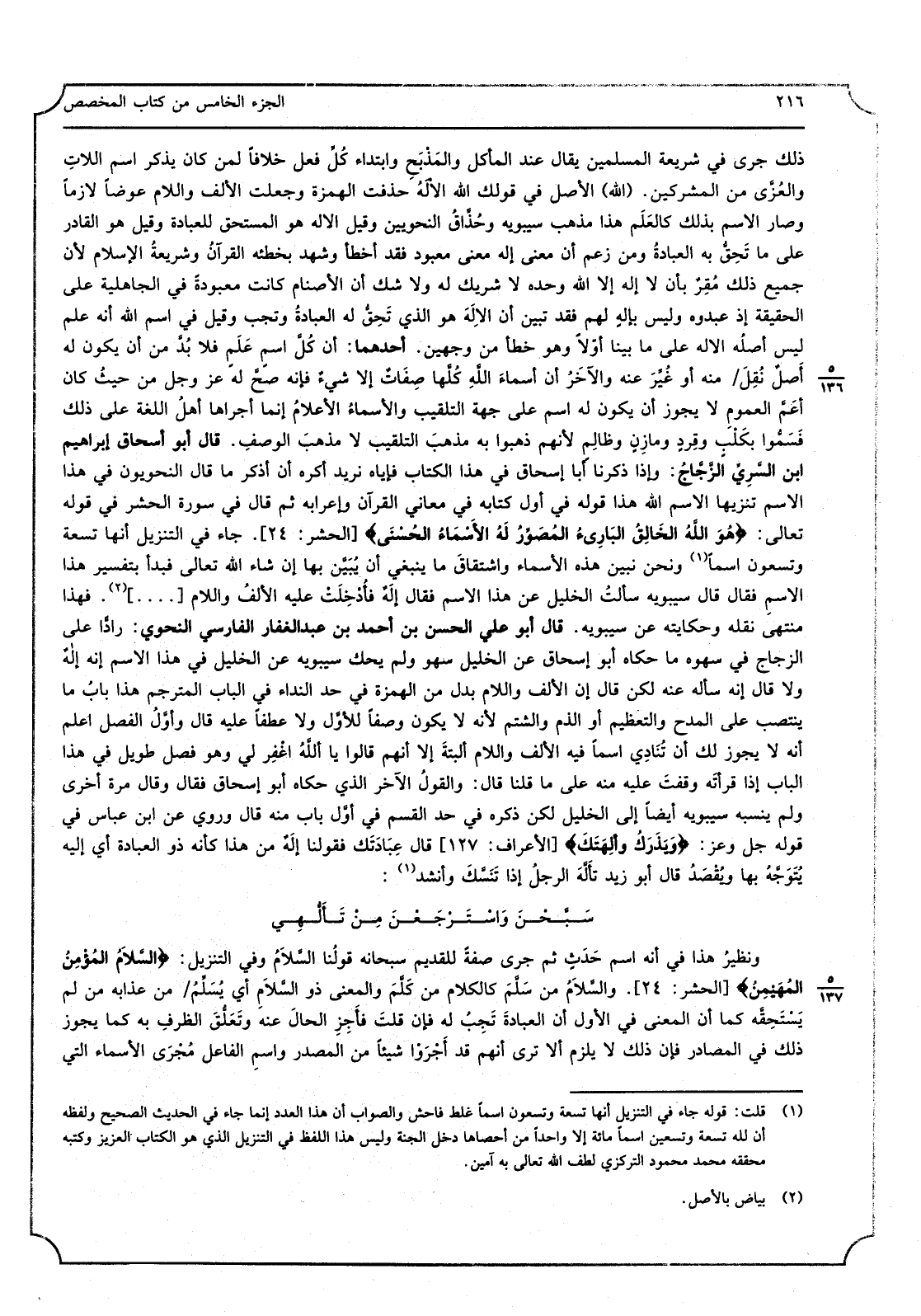 ذَلِك جرى فِي شَرِيعَة الْمُسلمين يُقَال عِنْد المأكل والمَذْبَحِ وَابْتِدَاء كُلِّ فعل خلافًا لمن كَانَ يذكر اسْم اللاتِ والعُزَّى من الْمُشْركين (الله) الأَصْل فِي قَوْلك الله الاْلَهُ حذفت الْهمزَة وَجعلت الْألف وَاللَّام عوضا لَازِما وَصَارَ الِاسْم بذلك كالعَلَم هَذَا مَذْهَب سِيبَوَيْهٍ وحُذَّاقُ النَّحْوِيين وَقيل الاله هُوَ الْمُسْتَحق لِلْعِبَادَةِ وَقيل هُوَ الْقَادِر على مَا تَحِقُّ بِهِ العيادةُ وَمن زعم أَن معنى إِلَه معنى معبود فقد أَخطَأ وَشهد بخطئه الْقُرْآن وشريعةُ الْإِسْلَام لِأَن جَمِيع ذَلِك مُقِرٌ بِأَن لَا إِلَه إِلَّا الله وَحده لَا شريك لَهُ وَلَا شكّ أَن الْأَصْنَام كَانَت معبودةً فِي الْجَاهِلِيَّة على الْحَقِيقَة إِذا عبدوه وَلَيْسَ بإلهٍ لَهُم فقد تبين أَن الاِلَهَ هُوَ الَّذِي تِحِقُّ لَهُ العبادةُ وَتجب وَقيل فِي اسْم الله أَنه علم لَيْسَ أصلُه الاله على مَا بَينا أوّلاً وَهُوَ خطأ من وَجْهَيْن أَحدهمَا: أَن كُلَّ اسمٍ عَلَمٍ فَلَا بُدَّ من أَن يكون لَهُ أَصلٌ نُقِلَ مِنْهُ أَو غُيِّرَ عَنهُ والآخَرُ أَن أسماءَ اللهِ كُلَّها صِفَاتٌ إِلَّا شيءٌ فَإِنَّهُ صَحَّ لَهُ عز وَجل من حيثُ كَانَ أعَمَّ العمومِ لَا يجوز أَن يكون لَهُ اسْم على جِهَة التلقيب والأسماءُ الأعلامُ إِنَّمَا أجراها أهلُ اللُّغَة على ذَلِك فَسَمُّوا بكَلْبٍ وقِردٍ ومازِنٍ وظالِم لأَنهم ذَهَبُوا بِهِ مذهبَ التلقيب لَا مذهبَ الوصفِ قَالَ أَبُو أسْحَاق إِبْرَاهِيم ابْن السَّرِيِّ الزَّجَّاجُ: وَإِذا ذكرنَا أَبَا إِسْحَاق فِي هَذَا الْكتاب فإياه نُرِيد أكره أَن أذكر مَا قَالَ النحويون فِي هَذَا الِاسْم تَنْزِيها الِاسْم الله هَذَا قَوْله فِي أول كِتَابه فِي مَعَاني الْقُرْآن وَإِعْرَابه ثمَّ قَالَ فِي سُورَة الْحَشْر فِي قَوْله تَعَالَى: {هُوَ اللهُ الخَالِقُ البَارِئُ المُصَوِّرُ لَهُ الأَسْمَاءُ الحُسْنَى} [الْحَشْر: 24] جَاءَ فِي التَّنْزِيل أَنَّهَا تِسْعَة وَتسْعُونَ اسْما وَنحن نبين هَذِه الْأَسْمَاء واشتقاقَ مَا يَنْبَغِي أَن يُبَيِّن بهَا إِن شَاءَ الله تَعَالَى فَبَدَأَ بتفسير هَذَا الاسمِ فَقَالَ قَالَ سِيبَوَيْهٍ سألتُ الْخَلِيل عَن هَذَا الِاسْم فَقَالَ إلَهٌ فأُدْخِلَتْ عَلَيْهِ الألفُ وَاللَّام [ ... .] فَهَذَا مُنْتَهى نَقله وحكايته عَن سِيبَوَيْهٍ قَالَ أَبُو عَليّ الْحسن بن أَحْمد بن عبد الْغفار الْفَارِسِي النَّحْوِيّ: رادًّا على الزّجاج فِي سَهْوه مَا حَكَاهُ أَبُو إِسْحَاق عَن الْخَلِيل سَهْو وَلم يحك سِيبَوَيْهٍ عَن الْخَلِيل فِي هَذَا الِاسْم إِن إلهٌ وَلَا قَالَ إِنَّه سَأَلَهُ عَنهُ لَكِن قَالَ إِن الْألف وَاللَّام بدل من الْهمزَة فِي حد النداء فِي الْبَاب المترجم هَذَا بابُ مَا ينْتَصب على الْمَدْح والتعظيم أَو الذَّم والشتم لِأَنَّهُ لَا يكون وَصفا للأوَّل وَلَا عطفا عَلَيْهِ قَالَ وأوَّلُ الْفَصْل اعْلَم أَنه لَا يجوز لَك أَن تُنَادِي اسْما فِيهِ الْألف وَاللَّام ألبتةَ إِلَّا أَنهم قَالُوا يَا اللهُ اغْفِر لي وَهُوَ فصل طَوِيل فِي هَذَا الْبَاب إِذا قرأتَه وقفتَ عَلَيْهِ مِنْهُ على مَا قُلْنَا قَالَ: والقولُ الآخر الَّذِي حَكَاهُ أَبُو إِسْحَاق فَقَالَ وَقَالَ مرّة أُخْرَى وَلم ينْسبهُ سِيبَوَيْهٍ أَيْضا إِلَى الْخَلِيل وَلَكِن ذكره فِي حد الْقسم فِي أوَّل بَاب مِنْهُ قَالَ وَرُوِيَ عَن ابْن عَبَّاس فِي قَوْله جلّ وَعز: {وَيَذَرَكُ وألِهَتَكَ} [الْأَعْرَاف: 127] قَالَ عِبَادَتَك فقلونا إلَهٌ من هَذَا كَأَنَّهُ ذُو الْعِبَادَة أَي إِلَيْهِ يُتَوَجَّهُ بهَا ويُقْصَدُ قَالَ أَبُو زيد تأَلَّهَ الرجلُ إِذا تَنَسَّكَ وَأنْشد: