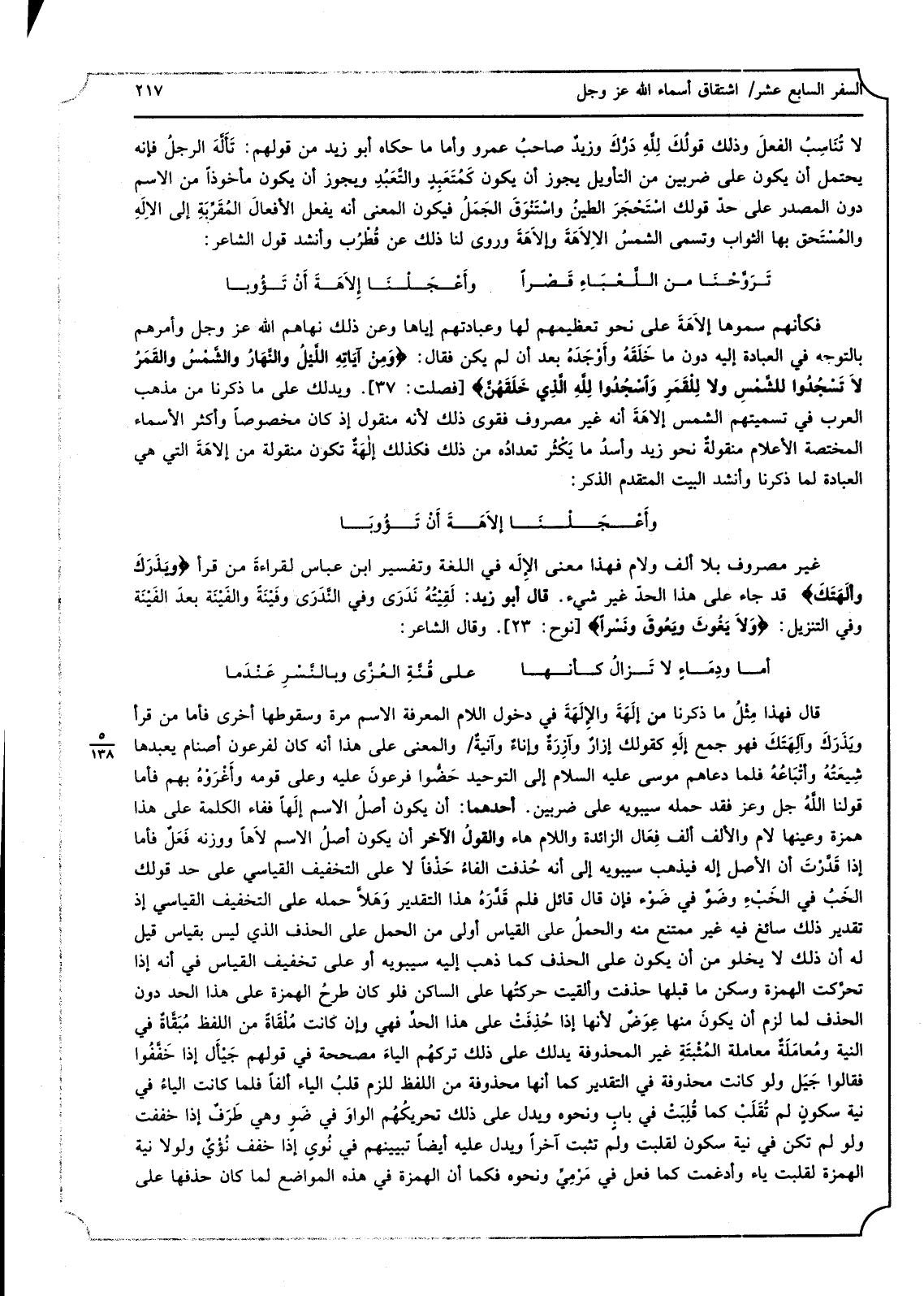 فكأنهم سَموهَا إلاَهَةَ على نَحْو تعظيمهم لَهَا وعبادتهم إِيَّاهَا وَعَن ذَلِك نَهَاهُم الله عز وَجل وَأمرهمْ بالتوجه فِي الْعِبَادَة إِلَيْهِ دون مَا خَلَقَهُ وأَوْجَدَهُ بعد أَن لم يكن فَقَالَ: {وَمِنْ آيَاتِهِ اللَّيْلُ والنَّهَارُ والشَّمْسُ والقَمَرُ لاَ تَسْجُدُوا للشَّمْسِ وَلَا لِلْقَمَرِ وَاسْجُدُوا لِلهِ الَّذِي خَلَقَهُنَّ} [فصلت: 37] ويدلك على مَا ذكرنَا من مَذْهَب الْعَرَب فِي تسميتهم الشَّمْس إلاهَةَ أَنه غير مَصْرُوف فقوى ذَلِك لِأَنَّهُ مَنْقُول إِذْ كَانَ مَخْصُوصًا وَأكْثر الْأَسْمَاء المختصة الْأَعْلَام منقولةٌ نَحْو زيد وأسدُ مَا يَكْثُر تعدادُه من ذَلِك فَكَذَلِك إلهَةٌ تكون منقولة من إلاهَةَ الَّتِي هِيَ الْعِبَادَة لما ذكرنَا وَأنْشد الْبَيْت الْمُتَقَدّم الذّكر: