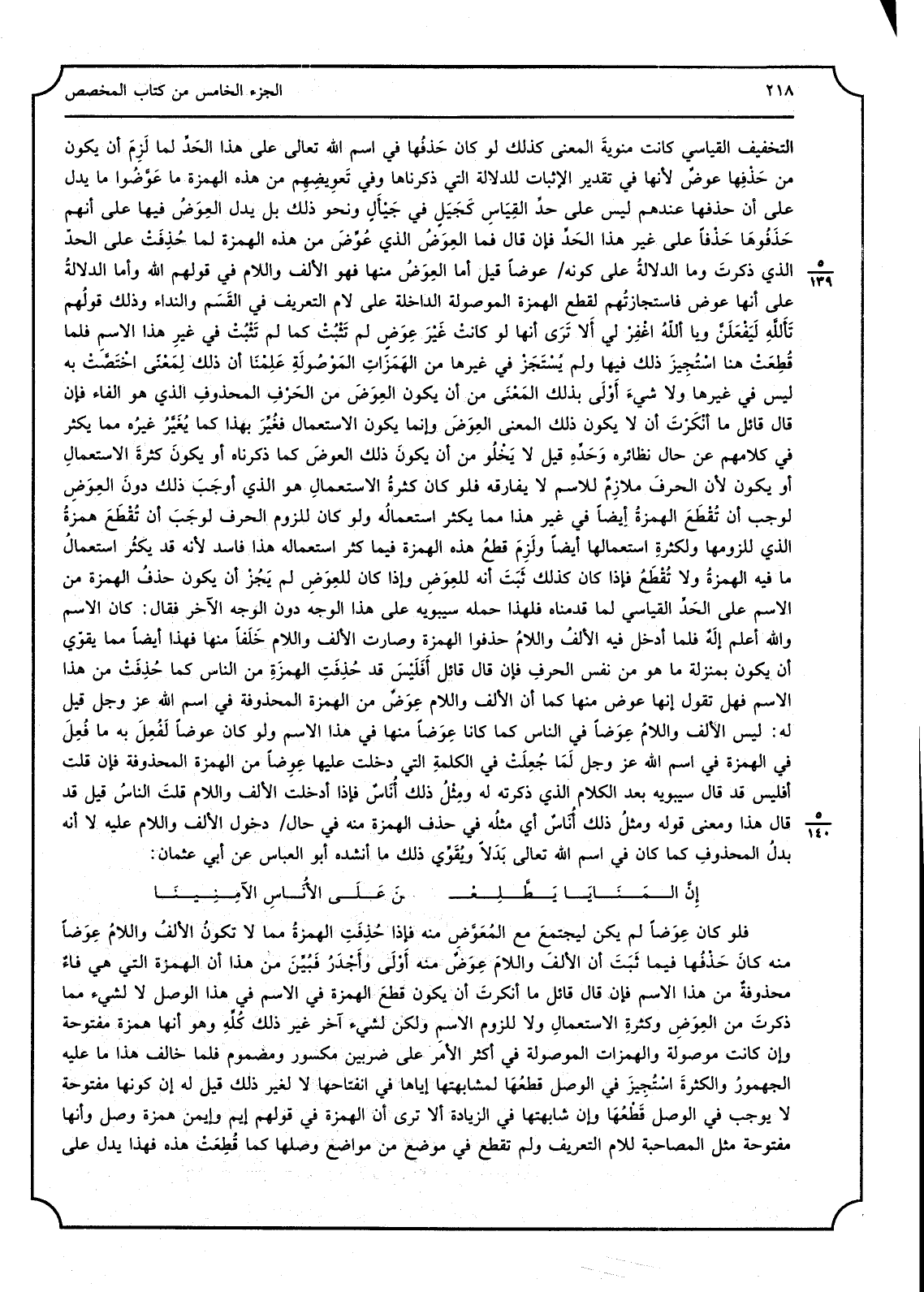 التَّخْفِيف القياسي كَانَت منويةَ الْمَعْنى كَذَلِك لَو كَانَ حَذفُها فِي اسْم الله تَعَالَى على هَذَا الحَدِّ لما لَزِمَ أَن يكون من حَذْفِها عوضٌ لِأَنَّهَا فِي تَقْدِير الْإِثْبَات للدلالة الَّتِي ذَكرنَاهَا وَفِي تَعوِيضِهِم من هَذِه الْهمزَة مَا عَوَّضُوا مَا يدل على أَن حذفهَا عِنْدهم لَيْسَ على حدِّ القِيَاسِ كَجَيَلٍ فِي جَيْأَلٍ وَنَحْو ذَلِك بل يدل العِوَضُ فِيهَا على أَنهم حَذَفُوهَا حَذْفاً على غير هَذَا الحَدِّ فَإِن قَالَ فَمَا العِوَضُ الَّذِي عُوِّضَ من هَذِه الْهمزَة لما حُذِفَتْ على الحدّ الَّذِي ذكرتَ وَمَا الدلالةُ على كَونه عوضا قيل أما العِوَضُ مِنْهَا فَهُوَ الْألف وَاللَّام فِي قَوْلهم الله وَأما الدلالةُ على أَنَّهَا عوض فاستجازتُهم لقطع الْهمزَة الموصولة الدَّاخِلَة على لَام التَّعْرِيف فِي القَسَم والنداء وَذَلِكَ قولُهم تَأَللَّهِ لَيَفْعَلَنَّ وَيَا أللهُ اغْفِرْ لي أَلا تَرضى أَنَّهَا لَو كانتْ غَيْرَ عِوَضٍ لم تَثْبُتْ كَمَا لم تَثْبُتْ فِي غيرِ هَذَا الِاسْم فَلَمَّا قُطِعَتْ هُنَا اسْتُجِيزَ ذَلِك فِيهَا وَلم يُسْتَجَزْ فِي غَيرهَا من الهَمَزَاتِ المَوْصُولَةِ عَلِمْنَا أَن ذَلِك لِمَعْنىً اخْتَصَّتْ بِهِ لَيْسَ فِي غَيرهَا وَلَا شيءَ أَوْلَى بذلك المَعْنَى من أَن يكون العِوَضَ من الحَرْفِ المحذوفِ الَّذِي هُوَ الْفَاء فَإِن قَالَ قَائِل مَا أنْكَرْتَ أَن لَا يكون ذَلِك الْمَعْنى العِوَضَ وَإِنَّمَا يكون الِاسْتِعْمَال فغُيِّرَ بِهَذَا كَمَا يُغَيِّرُ غيرُه مِمَّا يكثر فِي كَلَامهم عَن حَال نَظَائِره وَحَدِّهِ قيل لَا يَخْلُو من أَن يكونَ العوضَ كَمَا ذَكرْنَاهُ أَو يكونَ كثرةَ الاستعمالِ أَو يكون لِأَن الحرفَ ملازِمٌ للاسم لَا يُفَارِقهُ فَلَو كَانَ كثرةُ الاستعمالِ هُوَ الَّذِي أوجَبَ ذَلِك دونَ العِوَض لوَجَبَ أَن تُقْطَعَ الهمزةُ أَيْضا فِي غير هَذَا مِمَّا يكثر استعمالُه وَلَو كَانَ للُزُوم الْحَرْف لوجَبَ أَن تُقْطَعَ همزةُ الَّذِي للزومها ولكثرةِ اسْتِعْمَالهَا أَيْضا ولَزِمَ قطعُ هَذِه الْهمزَة فِيمَا كثر اسْتِعْمَاله هَذَا فَاسد لِأَنَّهُ قد يكثُر استعمالُ مَا فِيهِ الهمزةُ وَلَا تُقْطَعُ فَإِذا كَانَ كَذَلِك ثَبَتَ أَنه للعِوَضِ وَإِذا كَانَ للعِوَضِ لم يَجُزْ أَن يكون حذفُ الْهمزَة من الِاسْم على الحَدِّ القياسي لما قدمْنَاهُ فَلهَذَا حمله سِيبَوَيْهٍ على هَذَا الْوَجْه دون الْوَجْه الآخر قَالَ: كَانَ الِاسْم وَالله أعلم إلَهٌ فَلَمَّا أَدخل فِيهِ الألفُ واللامُ حذفوا الْهمزَة وَصَارَت الْألف وَاللَّام خَلَفاً مِنْهَا فَهَذَا أَيْضا مِمَّا يقوّي أَن يكون بِمَنْزِلَة مَا هُوَ من نفس الحرفِ فَإِن قَالَ قَائِل أَفَلَيْسَ قد حُذِفَتِ الهمزَةِ من النَّاس كَمَا حُذِفَتْ من هَذَا الِاسْم فَهَل تَقول إِنَّهَا عوض مِنْهَا كَمَا أَن الْألف وَاللَّام عِوَضٌ من الْهمزَة المحذوفة فِي اسْم الله عز وَجل قيل لَهُ: لَيْسَ الْألف واللامُ عِوَضاً فِي النَّاس كَمَا كَانَا عِوَضاً مِنْهَا فِي هَذَا الِاسْم وَهُوَ كَانَ عوضا لَفُعِلَ بِهِ مَا فُعِلَ فِي الْهمزَة فِي اسْم الله عز وَجل لَمَا جُعِلَتْ فِي الكلمةِ الَّتِي دخلت عَلَيْهَا عِوِضاً من الْهمزَة المحذوفة فَإِن قلت أفليس قد قَالَ سِيبَوَيْهٍ بعد الْكَلَام الَّذِي ذكرته لَهُ ومِثْلُ ذَلِك أُنَاسٌ فَإِذا أدخلت الألأف وَاللَّام قلتَ الناسُ قيل قد قَالَ هَذَا وَمعنى قَوْله ومثلُ ذَلِك أُنَاسٌ أَي مثلُه فِي حذف الْهمزَة مِنْهُ فِي حَال دُخُول الْألف وَاللَّام عَلَيْهِ لَا أَنه بدلُ المحذوفِ كَمَا كَانَ فِي اسْم الله تَعَالَى بَدَلاً ويُقَوِّي ذَلِك مَا أنْشدهُ أَبُو الْعَبَّاس عَن أبي عُثْمَان: