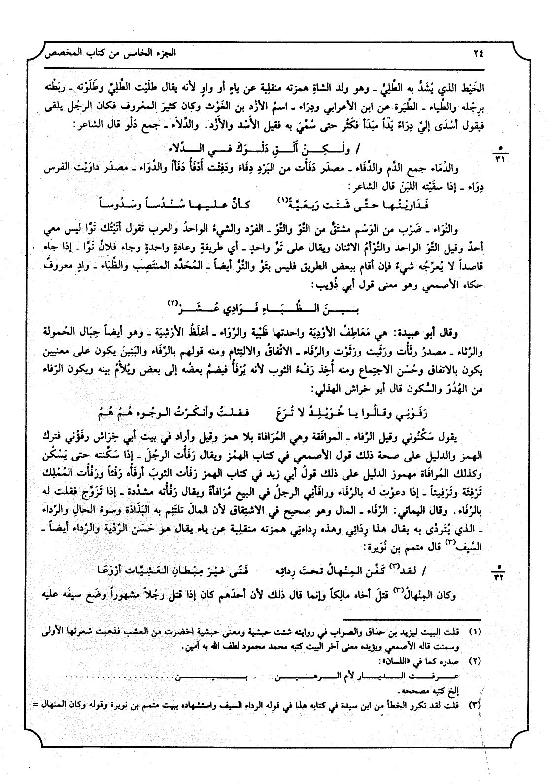 الخَيْط الَّذِي يُشَدُّ بِهِ الطَّلِيُّ - وَهُوَ ولد الشاةِ همزته منقلِبة عَن ياءٍ أَو واوٍ لِأَنَّهُ يُقَال طلَيْت الطَّلِيَّ وطَلَوْته - ربَطْته برِجْله والطِّياء - الطِّيَرة عَن ابْن الْأَعرَابِي ودِرَاء - اسمُ الأزْد بن الغَوْث وَكَانَ كثيرَ المعْروف فَكَانَ الرجُل يلقى فَيَقُول أسْدَى إليَّ دِرَاءٌ يَداً مَبَدأ فكَثُر حَتَّى سُمِّيَ بِهِ فَقيل الأَسْد والأَزْد والدِّلاَء - جمع دَلْو قَالَ الشَّاعِر: