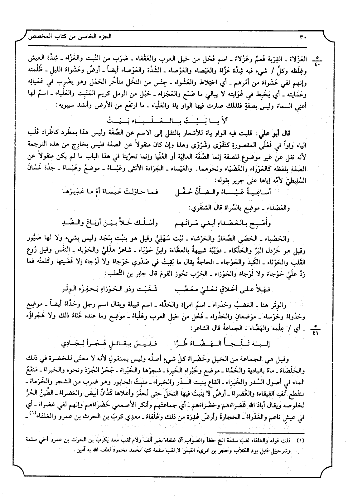 وَقيل هِيَ الْجَمَاعَة من الْخَيل وخَضراءُ كلِّ شيءٍ أصلُه وَلَيْسَ بمنقولٍ أَنه لَا معنَى للخضرة فِي ذَلِك والخَلْصَاءُ - ماءٌ بالبادية والخَمَّاءُ - مَوضِع وخَبْراء الخَبِرة - شجرُها والخَبْراءُ - جحْرُ الجُرَذ وَنَحْوه والخبراءُ - مَنقَعُ المَاء فِي أصُول السِّدر والخَبِزاء - القاع ينْبت السدْر والخبراء - منبِتُ الخابور وَهُوَ ضرب من الشّجر والخَرْماءُ - منقَطع أُنفِ القِيقاءة والغَضراءُ - أرضٌ لَا ينبتُ فِيهَا النخلُ حَتَّى تُحفَرَ وأعلاها كَذَّانّ أَبيض والغضراءُ - الطِّينْ الحُرُّ لخلوصه وَيُقَال أبادَ الله غَضراءَهم وخضْراءَهم - أَي جماعتَهم وَأنكر الْأَصْمَعِي خَضْراءَهم وَإِنَّهُم لفي غضراءُ - أَي فِي عيشٍ ناعم والغَدْراءُ - الحجارةُ وأرضٌ غَدِرَة من ذَلِك وغَلْفاءُ - معدِي كربَ بن الْحَرْث بن عَمْرو والغلفاء -