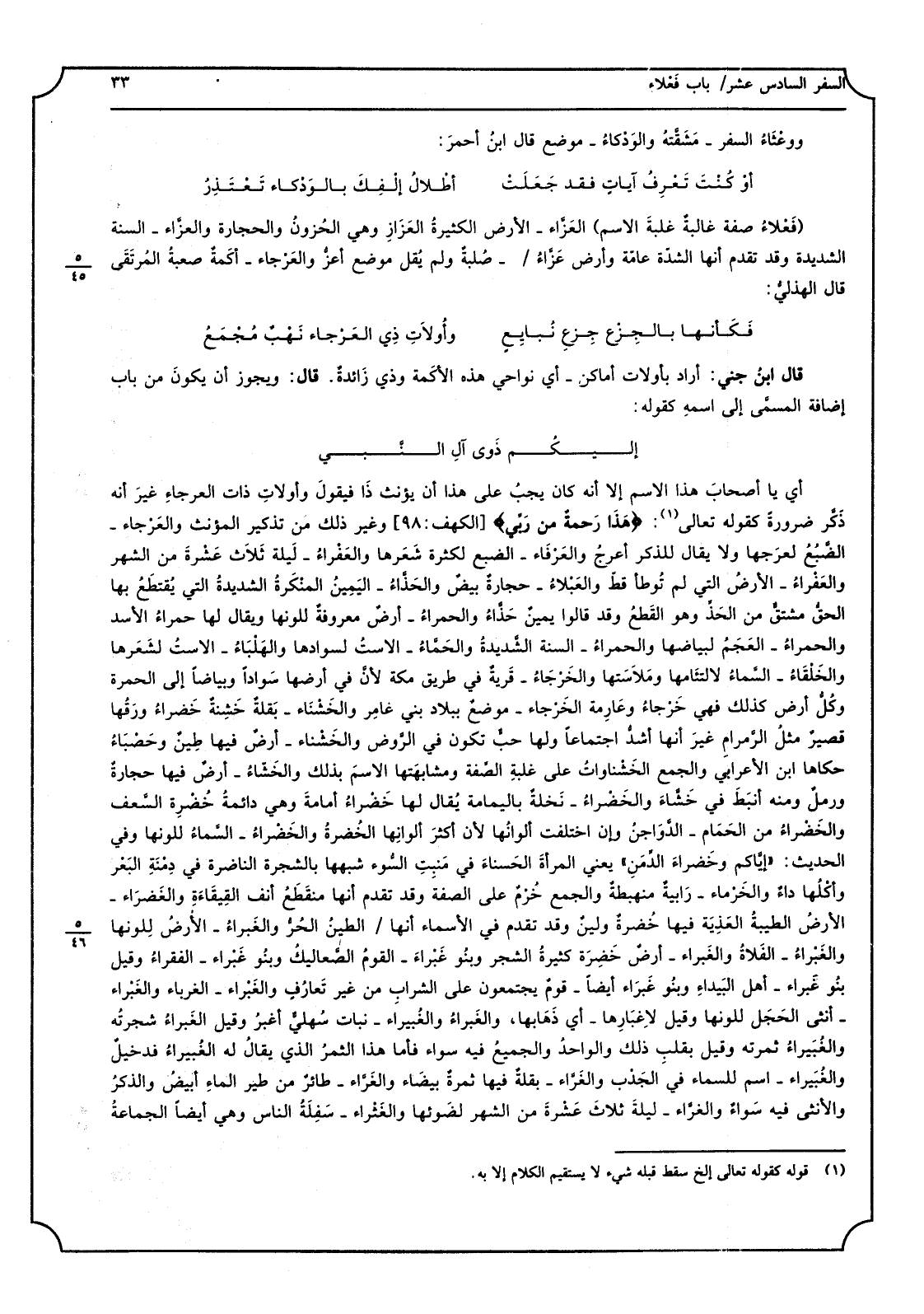 أَي يَا أصحابَ هَذَا الِاسْم إِلَّا أَنه كَانَ يجبُ على هَذَا أَن يؤنث ذَا فيقولَ وأولاتِ ذَات العرجاءِ غيرَ أَنه ذَكَّر ضرورةٌ كَقَوْلِه تَعَالَى: {هَذَا رَحمةٌ من رَبِّي} [الْكَهْف: 98] وَغير ذَلِك من تذكير الْمُؤَنَّث والعَرْجاء - الضَّبُعُ لعرَجها وَلَا يُقَال للذّكر أعرجُ والعَرْفَاء - الضبع لِكَثْرَة شَعَرها والعَفْراءُ - لَيْلَة ثَلاَث عَشْرةَ من الشَّهْر والعَفْراءُ - الأرضُ الَّتِي لم تُوطأ قطّ والعَبْلاءُ - حجارةٌ بيضٌ والحَذَّاءُ - اليَمِينُ المنْكَرةُ الشديدةُ الَّتِي يُقتطَعُ بهَا الحقُّ مشتقٌّ من الحَذِّ وَهُوَ القَطع وَقد قَالُوا يمينٌ حَذَّاءُ والحمراءُ - أرضٌ معروفةٌ للونها وَيُقَال لَهَا حمراءُ الْأسد والحمراءُ - العَجَمُ لبياضها والحمراءُ - السّنة الشَّديدةُ والحَمَّاءُ - الاستُ لسوادها والهَلْبَاءُ - الاستُ لشَعَرها والخَلْقَاءُ - السَّماءُ لالتئَامها ومَلاَسَتها والخَرْجَاءُ - قَريةٌ فِي طَرِيق مَكَّة لأنَّ فِي أرْضهَا سَوادً وبياضاً إِلَى الْحمرَة وكُلُّ أَرض كَذَلِك فَهِيَ خَرْجاءُ وعَارِمة الخَرْجاء - موضعٌ بِبِلَاد بني عامِر والخَشْنَاء - بَقلةٌ خَشِنةٌ خَضراءُ ورَقُها قصيرٌ مثلُ الرَّمرامِ غيرَ أَنَّهَا أشدُّ اجتماعاً وَلها حبٌّ تكون فِي الرَّوض والخَشْناء - أرضٌ فِيهَا طِينٌ وحَصْبَاءُ حَكَاهَا ابْن الْأَعرَابِي والمع الخَشْناواتُ على غلبةِ الصِّفة ومشابهَتها الاسمَ بذلك والخَشّاءُ - أرضٌ فِيهَا حجارةٌ ورملٌ وَمِنْه أنبَطَ من خَشَّاءَ والخَضْراءُ - نَخلةٌ بِالْيَمَامَةِ يُقال لَهَا خَضْراءُ أمامةُ وَهِي دائمةُ خُضْرِة السَّعٌ والخَضْراءُ من الحَمَام - الدَّوَاجنُ وَإِن اخْتلفت ألوانُها لِأَن أكثرَ ألوانِها الخُضرةُ والخَضْراءُ - السَّماءُ للونها وَفِي الحَدِيث: