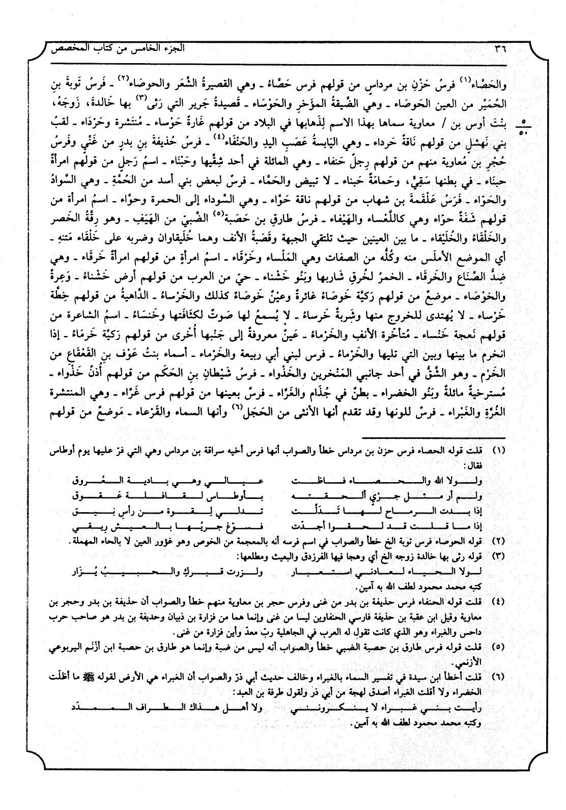 والحَصَّاء فرسُ حَزْنِ بن مرداسٍ من قَوْلهم فرس حَصَّاءُ - وَهِي القصيرةُ الشَّعَر والحوصَاء - فَرسُ تَوبةَ بنِ الحُمَيِّر من الْعين الحَوصَاء - وَهِي الضَّيقةُ المؤَخرِ والحَوْسَاء - قَصيدةُ جَرير الَّتِي رَثى بهَا خَالدةَ زَوجَهُ بنْتَ أَوْس بن مُعَاوِيَة سَمَّاهَا بِهَذَا الِاسْم لِذَهابها فِي الْبِلَاد من قَوْلهم غَارةٌ حَوْساء - مُنتَشرة وحَرْدَاء - لقبُ بني نَهشلِ من قَوْلهم نَاقةٌ حَرداء - وَهِي اليَابسةُ عَصَبِ اليدِ والحَنْقَاء - فرسُ حُذيفةَ بنِ بدرٍ من غَنِّي وفَرسُ حُجْرِ بن مُعاوية مِنْهُم من قَوْلهم رِجلٌ حَنفاء - وَهِي المائلة فِي أحد شِقَّيها وحَبْنَاء - اسمُ رَجلٍ من قَوْلهم امرأةٌ حبنَاء - فِي بَطنهَا سَقِيُّ وحَمامَةٌ حَبناء - لَا تبيض والحَمَّاء - فرسٌ لبَعض بني اسد من الحُمَّةِ - وَهِي السَّوادُ والحَوّاء - فَرَسُ عَلْقَمةَ بن شهَاب من قَوْلهم نَاقَة حَوَّاء - وَهِي السَّوداء إِلَى الْحمرَة وحوِّاء - اسمُ امْرَأَة من قَوْلهم شَفَةٌ حوّاء وهيكاللَّعْساء والهَيْفاء - فرسُ طارقِ بن حَصَبة الضِّبيّ من الهَيَفِ - وَهُوَ رِقَّةُ الخَصر والخَلْقَاء والخُلْيْقَاء - مَا بَين الْعَينَيْنِ حَيْثُ تلتقي الْجَبْهَة وقَصَبةُ الْأنف وهما خُلَيقاوان وضربه على خَلْقَاء مَتنِه - أَي الْموضع الأملَس مِنْهُ وكُلُّه من الصِّفَات وَهِي المَلْساء وخَرْقَاء - اسمُ امرأةٍ من قَوْلهم امرأةٌ خَرقَاء - وَهِي ضَدُّ الصَّنَاع والخَرقَاء - الخمرُ لخُرقِ شَاربها وبَنُو خَشْناء - حيّ من الْعَرَب من قَوْلهم أَرض خَشْناءُ - وَعِرةٌ والخَوْصَاء - موضعٌ من قَوْلهم رَكيَّة خَوصَاءُ غائرةٌ وعيْنٌ خَوصَاءٌ كَذَلِك والخَرْساءُ - الدَّاهيةُ من قَوْلهم خِطَّة خَرْساء - لَا يُهتدى لِلْخُرُوجِ مِنْهَا وشَربةٌ خَرساءُ - لَا يُسمعُ لَهَا صَوتٌ لكثَافَتها وخَنسَاءُ - اسمُ الشاعرة من قَوْلهم نَعجة خَنْسا - مُتأخّرة الأنفِ والخَرْماءُ - عَينٌ معروفةٌ إِلَى جَنْبِها أُخْرى من قَوْلهم رَكيَّة خَرمَاءُ - إِذا انخرم مَا بَينهَا وين الَّتِي تَلِيهَا والخَرْماءُ - فرس لبني أبي ربيعَة والخَرْماء - أَسمَاء بنتُ عَوْف بنِ القَعْقَاع من الخَرْم - وَهِي الشَّقُّ فِي أحد جَانِبي المَنْخرين والخَذْواء - فرسُ شَيْطانِ بنِ الحَكَم من قَوْلهم أُذنٌ خَذْوَاء - مُسترخيةٌ مائلةٌ وبَنُو الخضراء - بطنٌ فِي جُذَام والغَرَّاء - فرسٌ بِعَينهَا من قَوْلهم فرس غَرِّاء - وَهِي المنتشرة الغُر َّةِ والغَبْراء - فرسٌ للونها وَقد تقدم أَنَّهَا الْأُنْثَى من الحَجَل وَأَنَّهَا السَّمَاء والقَرْعاء - مَوضعٌ من قَوْلهم