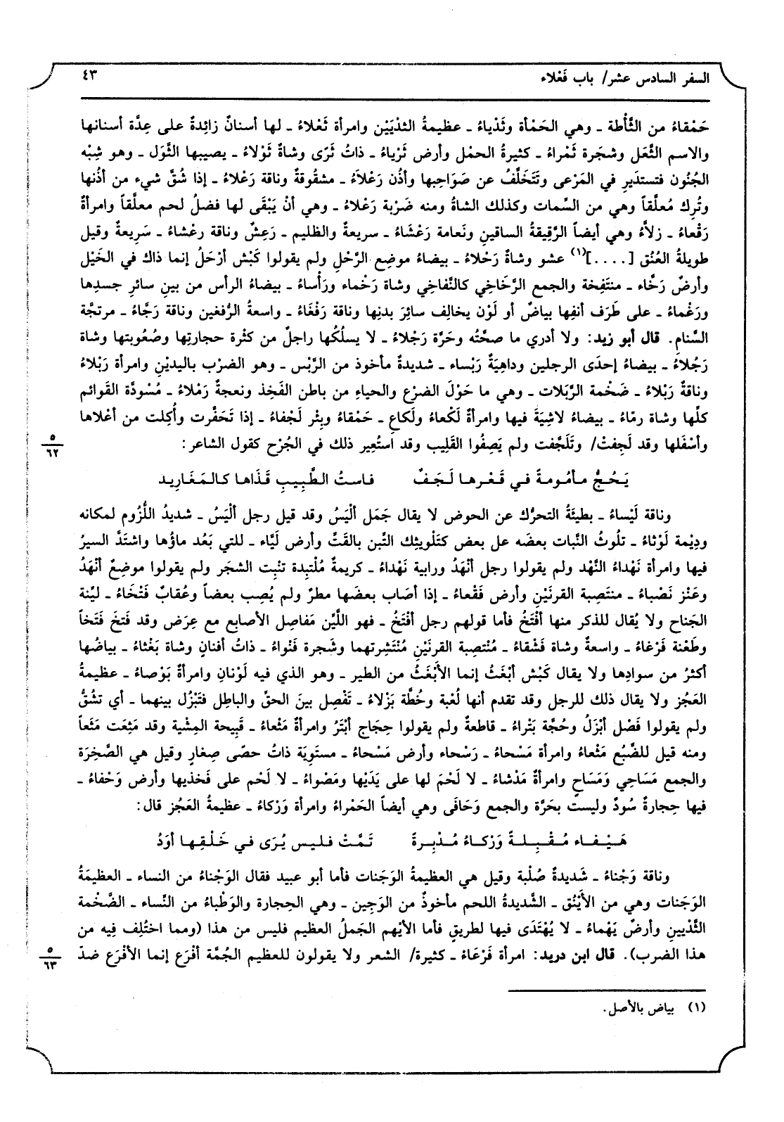 حَمْقاءُ من الثَّأْطة - وَهِي الحَمْأة وثَدْياءُ - عظيمةُ الثدْيَيْن وَامْرَأَة ثَعْلاءُ - لَهَا سنانٌ زائِدةق على عِدَّة أسنانها وَال اسْم الثَّعَل وشجَرة ثَمْراءُ - كثيرةُ الحمْل وَأَرْض ثَرْياءُ - ذاتُ ثَرَى وشاةٌ ثَوْلاءُ - يُصِيبهَا الثَّوَل - وَهُوَ شِبْه الجُنُون فتستدَيرِ فِي المَرْعى وتَتَخَلَّفُ عَن صَوَاحِبها وأذُن رَعْلاَءُ - مشقُوقةٌ وناقة رَعْلاءُ - إِذا شُقَّ شَيْء من أذُنها وتُرِك مُعلَّقاً وَهِي من السِّمات وَكَذَلِكَ الشاةُ وَمِنْه ضَرْبة رَعْلاءُ - وَهِي أنْ يَبْقَى لَهَا فضلُ لحم معلَّقاً وامرأةٌ رَقْعاءُ - زلاَّءُ وَهِي أَيْضا الرَّقِيقةُ الساقينِ ونَعامة رَعْشَاءُ - سريعةٌ والظليم - رَعِشُ وناقة رعْشاءُ - سَرِيعةق وَقيل طويلةُ العُنُق [ ... .] عشو وشاةٌ رَحْلاءُ - بيضاءُ موضِع الرَّحْلِ وَلم يقوولا كَبْش أرْحَلُ إِنَّمَا ذَاك فِي الخَيْل وأرضٌ رَخَّاء - منتَفِخة وَالْجمع الرَّخَاخِي كالنَّفاخِي وشَاة رَخْماء ورَأْساءُ - بيضاءُ الرَّأْس من بينِ سائرِ جسدِها ورَغْماءُ - على طَرَف أنفِها بياضٌ أَو لَوْن يخالِف سائِرَ بدنِها وناقة رَفْغَاءُ - واسعةُ الرُّفغين وناقة رَجَّاءُ - مرتجَّة السَّنام قَالَ أَبُو زيد: وَلَا أَدْرِي مَا صحَّتُه وحَرَّة رَجْلاءُ - لَا يسلُكُها راجلٌ من كثْرة حجارتِها وصُعُوتها وشَاة رَجْلاءُ - بيضاءُ إحدَى الرجلَيْن وداهِيَةٌ رَبْساء - شديدةق مَأْخُوذ من الرَّبْس - وَهُوَ الضرْب باليديْنِ وَامْرَأَة رَبْلاءُ وناقةٌ رَبْلاءُ - ضَخْمة الرَّبَلات - وَهِي مَا حَوْلَ الضرْع والحياءِ من بَاطِن الفَخِذ ونعجةٌ رَملاءُ - مُسْودَّة القَوائم كلَّها وشَاة رمّاءُ - بيضاءُ لاشِيَةَ فِيهَا وامرأةٌ لَكْعاءُ ولَكاعِ - حَمْقاءُ وبِئْر لَجْفاءُ - إِذا تَحَفَّرت وأُكِلت من أعْلاها وأسْفَلها وَقد لَجِفتْ وتَلَجَّفت وَلم يَصِفُوا القَلِيب وَقد استُعِير ذَلِك فِي الجُرْح كَقَوْل الشَّاعِر: