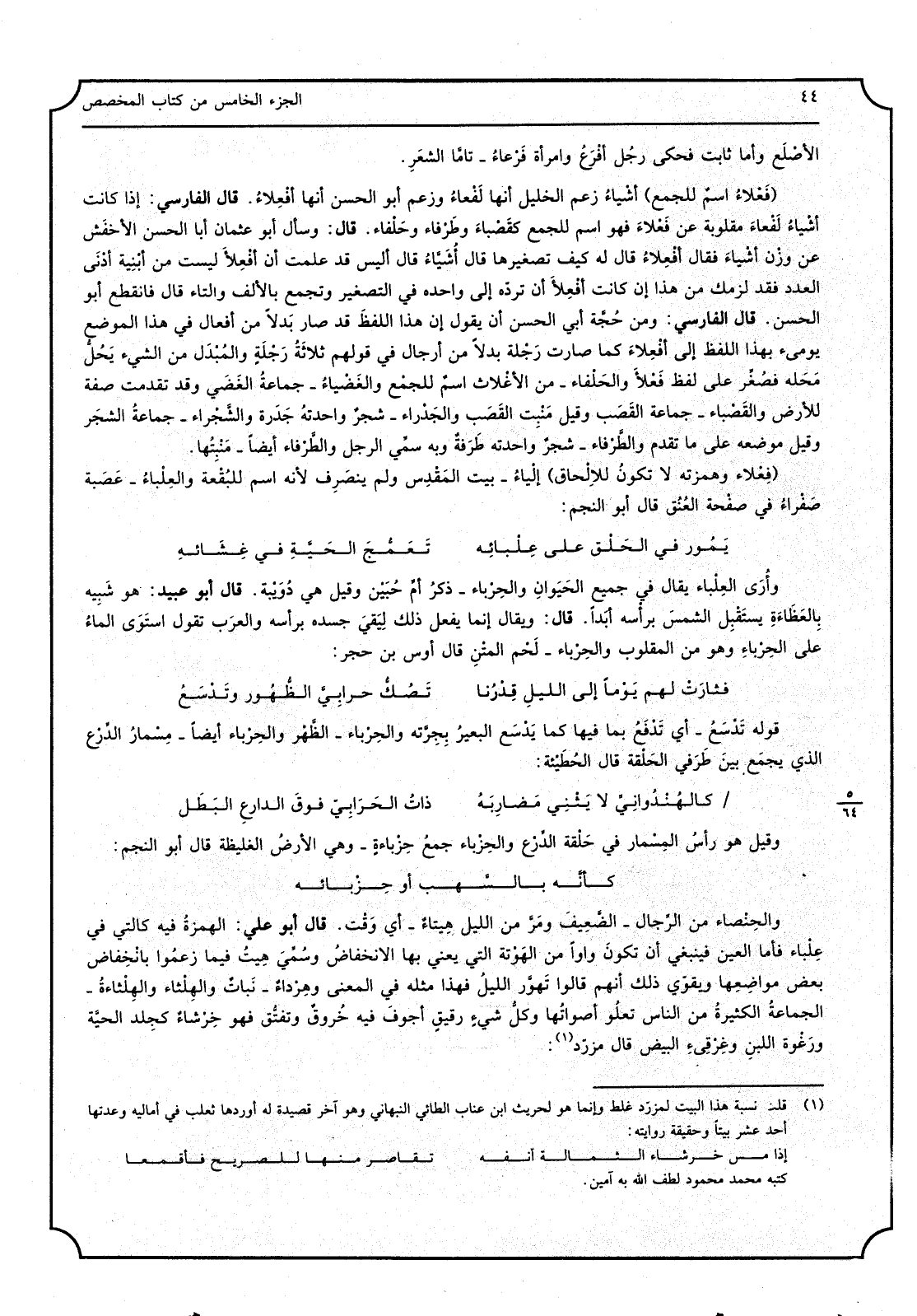 (فَعْلاءُ اسمٌ للْجمع) أشْياءُ زعم الْخَلِيل أَنَّهَا لَفْعاءُ وَزعم أَبُو الْحسن أَنَّهَا أفْعِلاءُ قَالَ الْفَارِسِي: إِذا كَانَت أشْياءُ لَفْعاءَ مَقْلُوبَة عَن فَعْلاءَ فَهُوَ اسْم للْجمع كَقَصْباءَ وطَرْفاء وحَلْفاء قَالَ: وَسَأَلَ أَبُو عُثْمَان أَبَا الْحسن الأخفَش عَن وزْن أشْياءَ فَقَالَ أفْعِلاءُ قَالَ لَهُ كَيفَ تصغيرها قَالَ أُشَيَّاءُ قَالَ أَلَيْسَ قد علمت أَن أفْعِلأَ لَيست من أبْنِية أدْ نَى الْعدَد فقد لزمك من هَذَا إِن كَانَت أفْعِلأَ أَن تردّه إِلَى وَاحِدَة فِي التصغير وَتجمع بِالْألف وَالتَّاء قَالَ فَانْقَطع أَبُو الْحسن قَالَ الْفَارِسِي: وَمن حُجَّة أبي الْحسن أَن يَقُول إِن هَذَا اللفظَ قد صَار بَدلاً من أَفعَال فِي هَذَا الْموضع يُومِئ بِهَذَا اللَّفْظ إِلَى أفْعِلاءَ كَمَا صَارَت رَجْلة بَدَلا من أرجال فِي قَوْلهم ثلاثَةُ رَجْلَةٍ والمُبْدَل من الشَّيْء يَحُلُّ مَحَله فصُغِّر على لفظ فَعْلأَ والحَلْفاء - من الأغْلاث اسمٌ للجمْع والغَضْياءُ - جماعةُ الغَضَي وَقد تقدّمت صفة للْأَرْض والقَصْباء - جمَاعَة القَصَب وَقيل مَنْبِت القَصَب والجَدْراء - شجرٌ واحدتُه جَدَرة والشَّجْراء - جماعُ الشجرَ وَقيل مَوْضِعه على مَا تقدم والطَّرْفاء - شجرٌ واحدتة طَرَفةٌ وَبِه سمِّي الرجل والطَّرْفاء أَيْضا - مَنْبِتُها