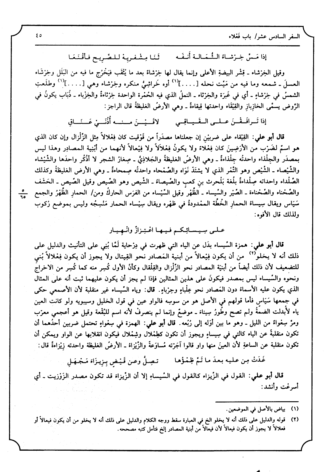 قَالَ أَبُو عَليّ: القِيْقاء على ضربيْنِ إِن جعلناها مصدَراً من قَوْقيت كَانَ فِعْلالاً مثل الزِّلْزال وغن كَانَ الَّذِي هُوَ اسمٌ لضَرْب من الأرَضِينَ كَانَ فِعْلاءً وَلَا يكونُ فِعْلاَلاً وَلَا فِيْعالاً لِأَنَّهُمَا من أبْنِية المصادِر وَهَذَا لَيْسَ بمصدَر والجِلْذاء واحدتُه جِلْذاءةٌ - وَهِي الأرضُ الغليظةُ والجَلاذِيُّ - صِغارُ الشّجر لَا أذْكُر واحدَها والشِّيْشاء والشِّيْصاء - الشِّيْص وَهُوَ التَّمْر الَّذِي لَا يشتَدّ نَوَاه والصِّمْحاء واحدتُه صِمحاءةٌ - وَهِي الأَرْض الغليظةُ وَكَذَلِكَ الصِّلْداء واحدته صِلْداءةٌ بلُغة بَلْحرث بنِ كعبٍ والصِّيصاءُ - الشِّيص وَهُوَ الصِّيص وَقيل الصِّيص - الحَشَف والصِّحْناء والصِّحْناءة - الصِّيْر والسِّيساء - الظَّهْر وَقيل السِّيْساء من الفرَس الحاركُ وَمن الحمارِ الظَّهْرُ وَالْجمع سَيَاس وَيُقَال سِيساءُ الحمارِ الخُطَّة الممْدودةُ فِي ظهْره وَيُقَال سِيْساء الْحمار مَنْسِجُه وَلَيْسَ بِموضع رُكوب وَلذَلِك قَالَ الأفوه: