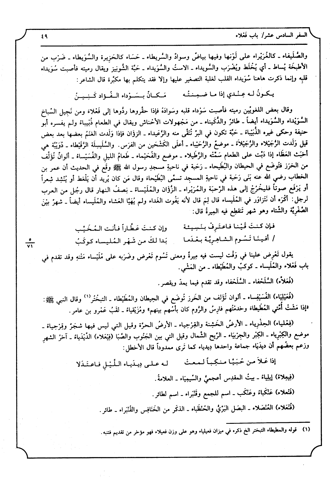 وَقَالَ بعض اللغويَّين رميته فاصبت سَوْداء قلبه وسَوادَهُ فغذا حقَّروها ردُّوها إِلَى فَعْلاَءَ وَمن نَجِيل السِّباخ السُّوْيداء أَيْضا - طائرٌ والدُّكَيناء - من مَجْهولات الأحْناش وَيُقَال فِي الطَّعَام ذُبْيباءُ وَلم يفسره أَبُو حنيفَة وَحكى غَيره الذُّبَيْباءُ - حَبَّة تكون فِي البرِّ تُنَقَّى مِنْهُ والرُّعَيداء - الزؤَان فَإِذا وَلَدت الغنَمُ بَعْضهَا بعد بعض قبل وَلَدت الرُّجَيْلاء والرُّجَيْلاَءُ - موضعٌ والرُّحَيْباء - أعلَى الكَشَحَين من الفَرس والسُّلَيسِلَة الرُّقَيْطاء - دُوَيْبَّة هِيَ أخبَث العَظَاء إِذا دَبَّت على الطَّعَام سَمَّتْه والرُّطَيلاء - مَوضِع والفُحَيْماء - طَعامُ الليلِ والفُسَيْساءُ - ألوانٌ تُؤَلَّف من الخرَز فتُوضَع فِي الْحِيطَان والبُطَيحاء - رَحَبة فِي ناحيةِ مسجدِ رَسُول الله صلى الله عَلَيْهِ وَسلم وقَع فِي الحَدِيث أَن عمر بن الْخطاب رَضِي الله عَنهُ بضنَى رَحَبة فِي ناحيةِ المسجِد تسمَّى البُطَيْحاءَ وَقَالَ مَن كَانَ يُريد أَن يَلْغط أَو يُنْشِد شِعراً أَو يَرْفَع صوتاُ فليخْرُجْ إِلَى هَذِه الرَّحبَة والمُرَيْراء - الزُّؤَان والمُلَيْساءُ - نِصفُ النَّهَار قَالَ رجُل من الْعَرَب لرجل: أكْرَه أَن نَتَزاوَر فِي المُلَيساء قَالَ لِمَ قَالَ لِأَنَّهُ يَفُوت الغَداء وَلم يُهَيِّا العَشاء والمُلَيساء أَيْضا - شهرٌ بيْنَ الصَّفَرِيَّة والشِّتاء وَهُوَ شهر تَنقطِع فِيهِ المِيرةُ قَالَ: