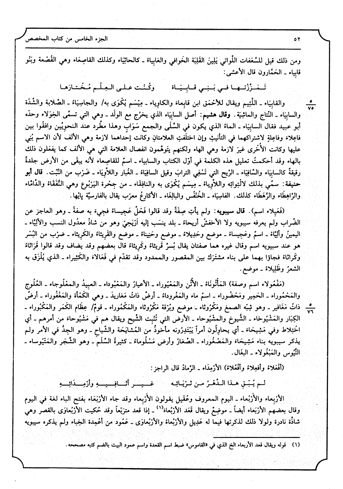 والقابِيَاء - اللَّئِيم وَيُقَال للأحْمَق ابْن قابِعاءَ والكاوِياء - مِيْسَم يُكْوَى بِهِ والجاسِيَاءُ - الصَّلابة والشِّدّة والسابِيَاء - النِّتاج والماشِيَة وَقَالَ هشيم: أصل السابِيَاء الَّذِي يخرُج مَعَ الولَد - وَهِي الَّتِي تسمَّى الخِوَلاء وحدّه أَبُو عبيد فَقَالَ السابِيَاء - الماءُ الَّذِي يكون فِي السَّلَى وَالْجمع سَوَابٍ وَهَذَا مطَّرد عِنْد النحوِيِّين وافقُوا بَين فاعِلاءَ وفاعِلةٍ لاشْتِرَاكهمَا فِي التأنيثِ وَإِن اختلَفتِ العلامتانِ وَكَانَت إِحْدَاهمَا لَازِمَة وَهِي الْألف لِأَن الِاسْم بُنِي عَلَيْهَا وَكَانَت الأُخْرى غيرَ لَازِمَة وَهِي الْهَاء وَلَكنهُمْ يتَوهَّمون انْفِصَال الْعَلامَة الَّتِي هِيَ الْألف كَمَا يفعَلون ذَلِك بِالْهَاءِ وَقد أحكمتث تَعْلِيل هَذِه الْكَلِمَة فِي أوّل الْكتاب والسابياء - اسمٌ للقاصِعاء لِأَنَّهُ يبقَى من الأَرْض جلدةٌ رقيقةٌ كالسابِيضاء والسَّافِيَاء - الرِّيح الَّتِي تَسْقِي الترابَ وَقيل السافِيَاءُ - الغُبار واللاَّوِيَاء - ضَرْب من النَّبْت قَالَ أَبُو حنيفَة: سمِّي بذلك لالْتِوائِه واللاَّوِياءُ - مِيسَم يُكْوَى بِهِ والنافِقَاء - من جِحْرة اليَرْبُوع وَهِي النُّفَقَاءُ والدَّامَّاء والرَّاهِطَاء والرُّهَطَاء كَذَلِك الفاسِيَاء - الخُنْفُس والبالِغَاء - الأكارعُ معرّب يقل بالفارسيَّة يايْها