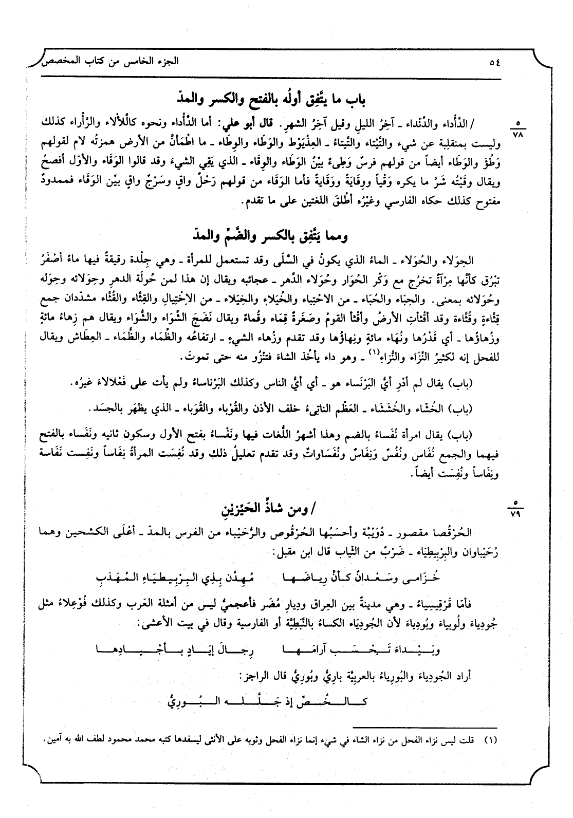 والحِوَلاء والحُوَلاء - الماءُ الَّذِي يكونُ فِي السَّلَى وَقد تسْتَعْمل للْمَرْأَة - وَهِي جِلْدة رقيقةٌ فِيهَا ماءٌ أَصْفَرُ تبْرُق كأنَّها مِرْآةٌ تخرُج مَعَ وَكْر الحُوَار وحُوَلاء الدَّهر - عجائبه وَيُقَال عَن هَذَا لمن حُولَة الدهرِ وحِوَلائه وحِوَله وحُوَلائه بِمَعْنى والحِبَاء والحُبَاء - من الاحْتِباء والخُيَلاء والخِيَلاء - من الاِخْتِيالِ والقِثَّاء والقُثَّاء مشدّدان جمع قِثَّاءةٍ وقُثَّاءة وَقد أقْثأتِ الأرضُ وأقْثأ القومُ وصَغَرةٌ قِمَاء وقُماءٌ وَيُقَال نَضَجَ الشِّوَاء والشُّوَاء وَيُقَال هم زِهاءُ مائةٍ وزُهاؤُها - أَي قَدْرُها ونُهَاء مائةٍ ونِهاؤُها وَقد تقدم وزُهاء الشَّيْء - ارتفاعُه والظِّمَاء والظُّمَاء - العِطَاش وَيُقَال لفحل إِنَّه لكثيرُ النِّزَاء والنُّزاءِ - وَهُوَ دَاء يأخُذ الشاءَ فتنْزُو مِنْهُ حَتَّى تموتَ