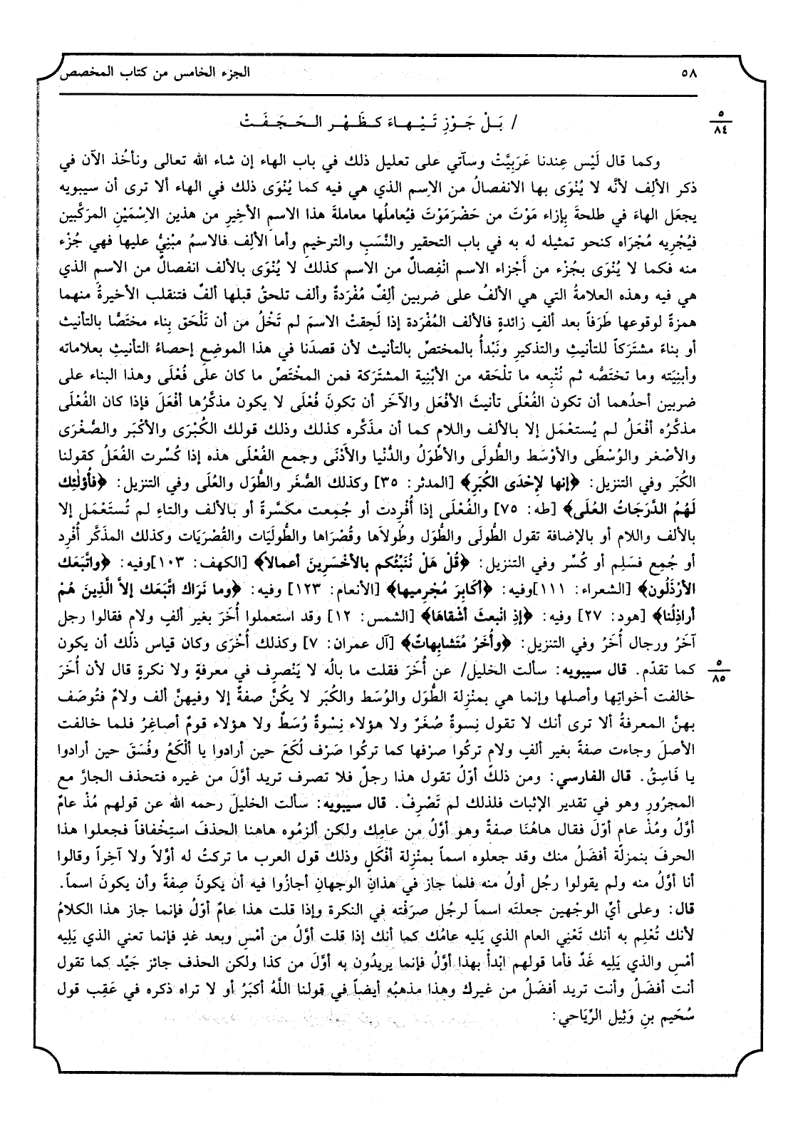 وكما قَالَ لَيْس عِندنا عَرَبِيَّتْ وسآتي على تَعْلِيل ذَلِك فِي بَاب الْهَاء إِن شَاءَ الله تَعَالَى ونأخُذ الْآن فِي ذكر الألِف لأنَّه لَا يُنْوَى بهَا الانفصالُ من الإسِم الَّذِي هِيَ فِيهِ كَمَا يُنْوَى ذَلِك فِي الْهَاء أَلا ترى أَن سِيبَوَيْهٍ يجعَل الهاءَ فِي طلحةَ بِإزاء مَوْتض من حَضْرَمَوْتَ فيُعاملُها معاملةَ هَذَا الاسمِ الأخِيرِ من هذَيْن الإِسْمَيْنِ المرَكَّبين فيُجْرِيه مُجْرَاة كنحو تمثيله لَهُ بِهِ فِي بَاب التحقير والنَّسَبِ والترخيمِ وَأما الألِف فالاسمُ مبْنِيُّ عَلَيْهَا فَهِيَ جُزْس مِنْهُ فَكَمَا لَا يُنْوَى بجُزْء من أَجْزاء الِاسْم انْفِصالٌ من الِاسْم كَذَلِك لَا يُنْوَى بِالْألف انفصالٌ من الِاسْم الَّذِي هِيَ فِيهِ وَهَذِه العلامةُ الَّتِي هِيَ الألفُ على ضَرْبَيْنِ ألِفٌ مُفْرَدةٌ وَألف تلحقُ بِناء مختَصًّا بالتأنيث أَو بِنَاء مشتَرَكاً للتأنيثِ والتذكيرِ ونَبْدأُ بالمختصِّ بالتأنيث لِأَن قصدَنا فِي هَذَا الموضِعِ إحصاءُ التأنيثِ بعلاماته وأبنِيتَه وَمَا تختَصُّه ثمَّ نُتْبِعه مَا تلْحَقه من الأبْنِية المشتَرَكة فَمن المخْتَصِّ مَا كَانَ علَى فُعْلَى وَهَذَا الْبناء على ضَرْبَيْنِ أحدُهما أَن تكون الفُعْلَى تأنيثَ الأفْعَل والآخَر أَن تكونَ فُعْلَى لَا يكون مذكَّرُها أفْعَلَ فَإِذا كَانَ الفُعْلَى مذكَّرُه أفْعَلُ لم يُستعْمَل إِلَّا بِالْألف وَاللَّام كَمَا أَن مذَكذَره كَذَلِك وَذَلِكَ قَوْلك الكُبْرَى والأكْبَر والصُّغْرَى والأصْغر والوُسْطَى والأوْسَط والطُّولَى والأطْوَلُ والدُّنْيا والأَدْنَى وَجمع الفُعْلَى هَذِه إِذا كُسِّرت الفُعَلُ كَقَوْلِنَا الكُبَر وَفِي التَّنْزِيل: {إِنَّهَا لإِحْدَى الكُبَر} [المدثر: 35] وَكَذَلِكَ الصُّغَر والطُّوَل والعُلَى وفيالتنزيل: {فأُولئِك لَهُمُ الدَّرَجَاتُ العُلَى} [طه: 75] والفُعْلَى إِذا أُفْرِدت أَو جُمِعت مكسَّرةً أَو بِالْألف والتاءِ لم تُستَعْمَل إِلَّا بِالْألف وَاللَّام أَو بِالْإِضَافَة تَقول الطُّولى والطُّوَل وطُولاَها وقُصْرَاها والطُّولَيَات والقُصْرَيَات وَكَذَلِكَ المذَكَّر أُفْرِد أَو جُمِع فسَلِم أَو كُسِّر وَفِي التَّنْزِيل: {قُلْ هَلْ نُنَبِّئُكم بالأخْسَرِينَ أعمالا} [الْكَهْف: 103] وَفِيه: {واتَّبَعَك الأرْذَلُون} [الشُّعَرَاء: 111] وَفِيه: {أكَابِرَ مُجْرِميها} [الْأَنْعَام: 123] وَفِيه: {وَمَا نَرَاك اتَّبَعَك إلاَّ الَّذِينَ هُمْ أراذِلُنا} [هود: 27] وَفِيه: {إذِ انْبعثَ أشْقاهَا} [الشَّمْس: 12] وَقد استعملوا أُخَرَ بِغَيْر ألفٍ وَلَام فَقَالُوا رجل آخَرُ وَرِجَال أُخَرُ وَفِي التَّنْزِيل: {وأُخَرُ مُتَشابِهاتٌ} [آل عمرَان: 7] وَكَذَلِكَ أُخْرَى وَكَانَ قِيَاس ذَلِك أَن يكون كَمَا تقدّم قَالَ سِيبَوَيْهٍ: سَأَلت الْخَلِيل عَن أُخَرَ فَقلت مَا بالُه لَا يَنْصرِف فِي معرفةٍ وَلَا نكرةٍ قَالَ لِأَن أُخَرَ خَالَفت أخواتِها وَأَصلهَا وَإِنَّمَا هِيَ بمنْزِلة الطُّوَل والوُسَط والكُبَر لَا يكُنَّ صفةٌ إِلَّا وفيهنَّ ألف ولامٌ فتُوصَف بهنَّ المعرفةُ أَلا ترى أَنَّك لَا تَقول نِسوةٌ صُغَرٌ وَلَا هَؤُلَاءِ نِسْوةٌ وُسَطٌ وَلَا هَؤُلَاءِ قومٌ أصاغِرُ فَلَمَّا خَالَفت الأصلَ وَجَاءَت صفة بِغَيْر ألفٍ ولامٍ تركُوا صرْفها كَمَا تركُوا صَرْف لُكَعَ حِين أَرَادوا يَا ألْكَعُ وفُسَقَ حِين أَرَادوا يَا فَاسِقُ قَالَ الْفَارِسِي: وَمن ذَلِك أوّلُ تَقول هَذَا رجلٌ فَلَا تصرف تُرِيدُ أوَّلَ من غَيره فتحذف الجارَّ مَعَ المجرُورِ وَهُوَ فِي تَقْدِير الْإِثْبَات فَلذَلِك لم تَصْرِفْ قَالَ سِيبَوَيْهٍ سَأَلت الخليلَ رَحمَه الله عَن قَوْلهم مُذْ عامٌ أوَّلُ ومُذْ عَام أوّلَ فَقَالَ هاهُنَا صفةٌ وَهُوَ أوَّلُ من عامِك وَلَكِن ألزمُوه هَاهُنَا الحذفَ استِخْفافاً فَجعلُوا هَذَا الحرفَ بِمَنْزِلَة أفضَلُ مِنْك وَقد جَعَلُوهُ ا