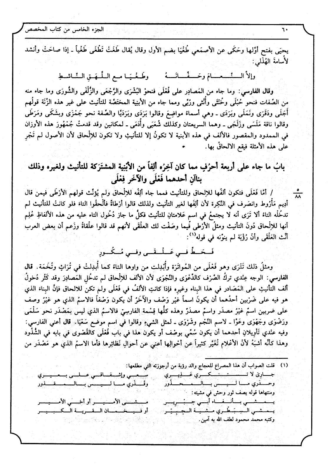 وَقَالَ الْفَارِسِي: وَمَا جَاءَ من المَصادِر على فُعْلَى فنحوْ البُشْرَى والرُّجْعَى والزُّلْفَى والشُّورَى وَمَا جَاءَ مِنْهُ من الصِّفات فنحو حُبْلَى وخُنْثَى وأُنْثى ورُبَّى وَمِمَّا جَاءَ من الأبنِية المختَصَّة للتأنيث على غير هَذِه الزِّنَة قولُهم أَجَلَى ودَقَرَى ونَمَلَى وبَرَدَى - وَهِي أسماءُ مواضِعَ وَقَالُوا بَرَدَى وبَرَدَيَّا والصِّفة نَحْو جَمْزَى وبشَكَى ومَرَطَى وَقَالُوا نَاقَة مَلَسَى وزَلَجَى - وهما السريعتان وَكَذَلِكَ شُعَبَى وأُدَمَى - لمكانين وَقد قدمتُ جُمْهُورَ هَذِه الأوزان فِي الْمَمْدُود والمقصور فالألف فِي هَذِه الْأَبْنِيَة لَا تكونُ إِلَّا للتأنيثِ وَلَا تكون للاِلْحاق لِأَن الْأُصُول لم تَجْرِ على هَذِه الْأَمْثِلَة فَيَقَع الالحاقُ بهَا