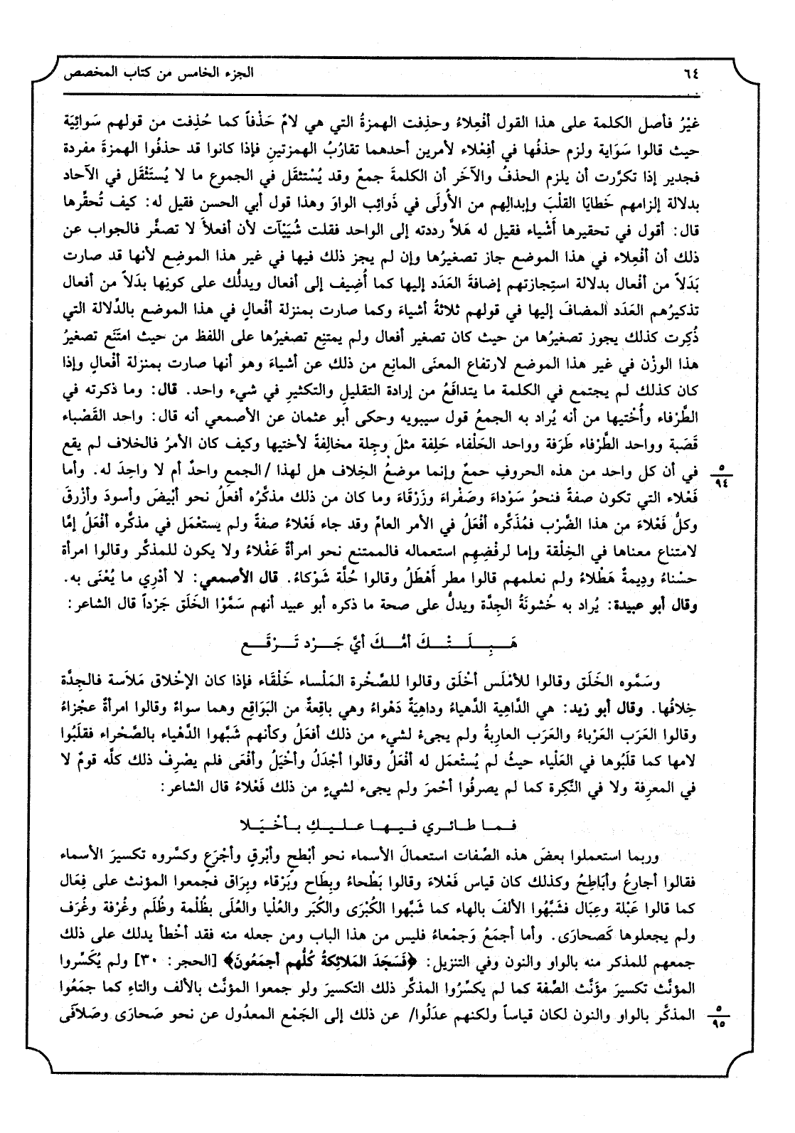 غيْرُ فَأصل الْكَلِمَة على هَذَا القَوْل أفْعِلاءُ وحذِقت الهمزةُ الَّتِي هِيَ لامٌ حَذْفاً من قَوْلهم سَوائِيَة حَيْثُ قَالُوا سَوَاية وَلزِمَ حذفُها فِي أفِعْلاء لأمرين أَحدهمَا تقارُبُ الهمزتينِ فَإِذا كَانُوا قد حذفُوا الهمزةَ مُفْردَة فجدير إِذا تكرَّرت أنيلزم الحذفُ والآخَر أَن الكلمةَ جمعٌ وَقد يُسْتثقَل فِي الجموع مَا لَا يُستَثْقَل فِي الْآحَاد بِدلَالَة إلزامهم خَطايَا القلْبَ وإبدالِهم من الأُولَى فِي ذَوائِب الواوَ وَهَذَا قَول أبي الْحسن فقي لَهُ: كَيفَ تُحقِّرها قَالَ: أَقُول فِي تحقيرها أَشْياء فَقيل لَهُ هَلاَّ رَددته إِلَى الْوَاحِد فَقلت شُيَيْآت لِأَن أفعلأَ لَا تصغَّر فَالْجَوَاب عَن ذَلِك أَن أفْعِلاء فِي هَذَا الْموضع جَازَ تصغيرُها وَإِن لم يجز ذَلِك فِيهَا فِي غير هَذَا الموضِع لِأَنَّهَا قد صَارَت بَدَلاً من أفْعال بِدلَالَة استِجازتهم إضافةَ العَدَد إِلَيْهَا كَمَا أُضِيف إِلَى أَفعَال ويدلُّلك على كونِها بدَلاً من أَفعَال تذكيرُهم العَدَد المضافَ إِلَيْهَا فِي قَوْلهم ثلاثةُ أشياءَ وكما صَارَت بِمَنْزِلَة أفْعالٍ فِي هَذَا الْموضع بالدَّلالة الَّتِي ذُكِرت كَذَلِك يجوز تصغيرُها من حَيْثُ كَانَ تَصْغِير أَفعَال وَلم يمتنِع تصغيرُها على اللَّفْظ من حَيْثُ امتَنَع تصغيرُ هَذَا الوزْن فِي غير هَذَا الْموضع لارْتِفَاع المعنَى المانِع من ذَلِك عَن أشياءَ وَهُوَ أَنَّهَا صَارَت بِمَنْزِلَة أفْعالٍ وَإِذا كَانَ كَذَلِك لم يجْتَمع فِي الْكَلِمَة مَا يتدافَعُ من إِرَادَة التقليلِ والتكثيرِ فِي شَيْء وَاحِد قَالَ: وَاحِد القَصْباء قَصَبة وَوَاحِد الطَّرْفاء طَرَفة وَوَاحِد الحَلْفاء حَلِفة مثلَ وجِلة مخالِفةً لأختيها وَكَيف كَانَ الأمرُ فَالْخِلَاف لم يَقع فِي أَن كل وَاحِد من هَذِه الحروفِ جمعٌ وَإِنَّمَا موضعُ الخِلاف هَل لهَذَا الْجمع واحدٌ أم لَا واحِدَ لَهُ وَأما فَعْلاء الَّتِي تكون صفة فنحوُ سَوْداءَ وصَفْراءَ وزَرْقَاءَ وَمَا كَانَ من ذَلِك مذكَّرُه أفعَلُ نَحْو أبْيضَ وأسودَ وأزْرقَ وكلُّ فَعْلاءَ من هَذَا الضَّرْب فمُذَكَّره أفْعَلُ فِي الْأَمر العامِّ وَقد جَاءَ فَعْلاءُ صفة وَلم يستعْمَل فِي مذكَّره أفْعَلُ إمَّا لِامْتِنَاع مَعْنَاهَا فِي الخِلْقة وَإِمَّا لرفْضِهِم اسْتِعْمَاله فالممتنع نَحْو امرأةٌ عَفْلاءُ وَلَا يكون للمذكَّر وَقَالُوا امْرَأَة حسْناءُ ودِيمةٌ هَطْلاءُ وَلم نعلمهُمْ قَالُوا مطر أَهْطَلُ وَقَالُوا حُلَّة شَوْكاءُ قَالَ الْأَصْمَعِي: لَا أدْرِي مَا يُعْنَى بِهِ وَقَالَ أَبُو عُبَيْدَة: يُراد بِهِ خُشونَةُ الجِدَّة ويدلُّ على صِحَة مَا ذكره أَبُو عبيد أَنهم سَمَّوْا الخَلَق جَرْداً قَالَ الشَّاعِر: