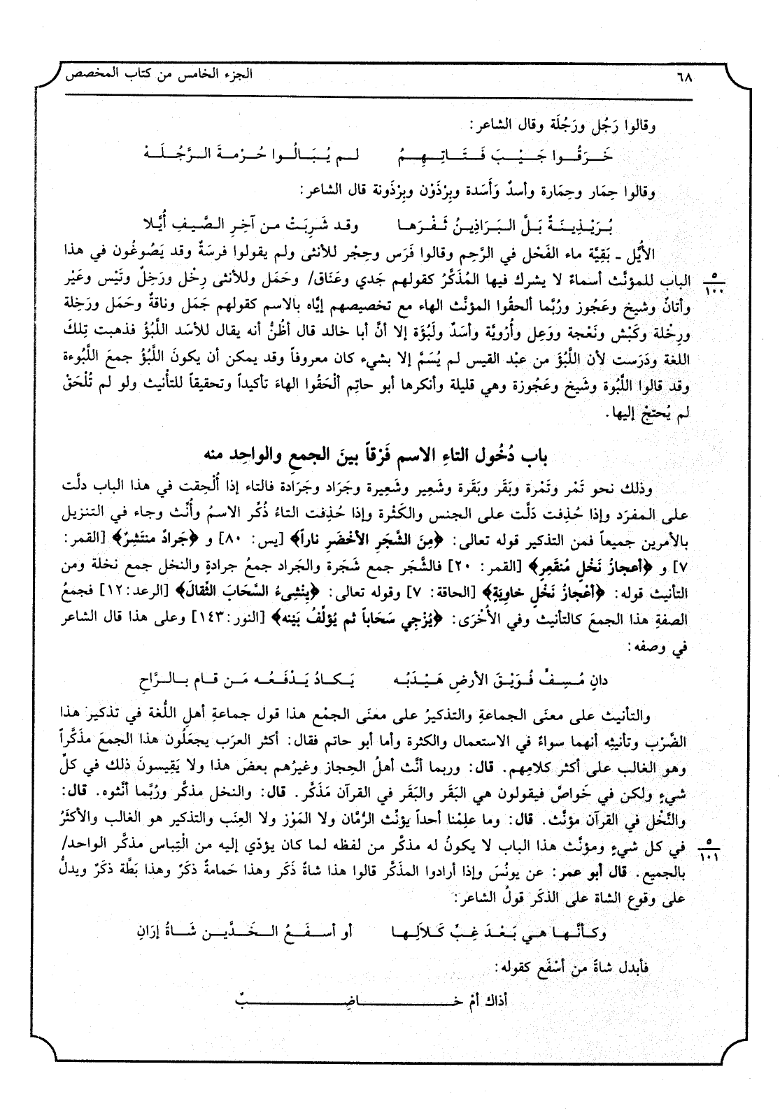 وَذَلِكَ نَحْو تَمْر وتَمْرة وبَقَر وبَقَرة وشِعِير وشَعِيرة وجَرَاد وجَرَادة فالتاء إِذا أُلْحِقت فِي هَذَا الْبَاب دلَّت على المفرَد وَإِذا حُذِفت دَلَّت على الْجِنْس والكَثْرة وَإِذا حُذِفت التاءُ الاسمُ وأُنْث وَجَاء فِي التَّنْزِيل بالأمرين جميعاُ فَمن التَّذْكِير قَوْله تَعَالَى: {مِنَ الشَّجَر الأخْضَرِ نَارا} [يس: 80] و {جَرادٌ منتَشِرٌ} [الْقَمَر: 7] و {أعجازُ نَخْلٍ مَنقَعِر} [الْقَمَر: 20] فالشَّجَر جمع شَجَرة والجَراد جمعُ جرادةٍ وَالنَّخْل جمع نَخْلَة وَمن التَّأْنِيث قَوْله: {أعْجازُ نَخْلٍ خاوِيَةٍ} [الحاقة: 7] وَقَوله تَعَالَى: {يِنْشِىءُ السَّحَابَ الثِّقالَ} [الرَّعْد: 12] فجمعُ الصفةِ هَذَا الجمعَ كالتأنيث وَفِي الأُخْرَىك {يُزْجِي سَحَاباً ثمَّ يُؤلِّفُ بَيْنه} [النُّور: 143] وعَلى هَذَا قَالَ الشَّاعِر فِي وَصفه: