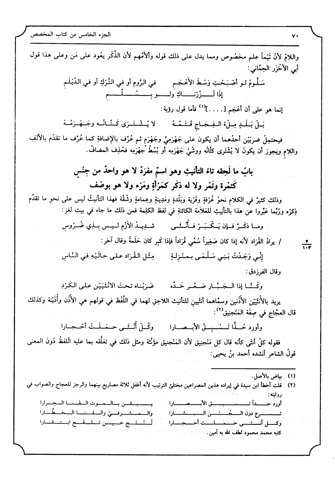 فَقَوله كلّ أنثَى كَأَنَّهُ قَالَ كل مَنْجنِيق لِأَن المَنْجنيق مؤَنَّثه وَمثل ذَلِك فِي تعَلُّقه بِمَا عَلَيْهِ اللفظُ دُونَ الْمَعْنى قولُ الشَّاعِر أنْشدهُ أَحْمد بنُ يحيى: