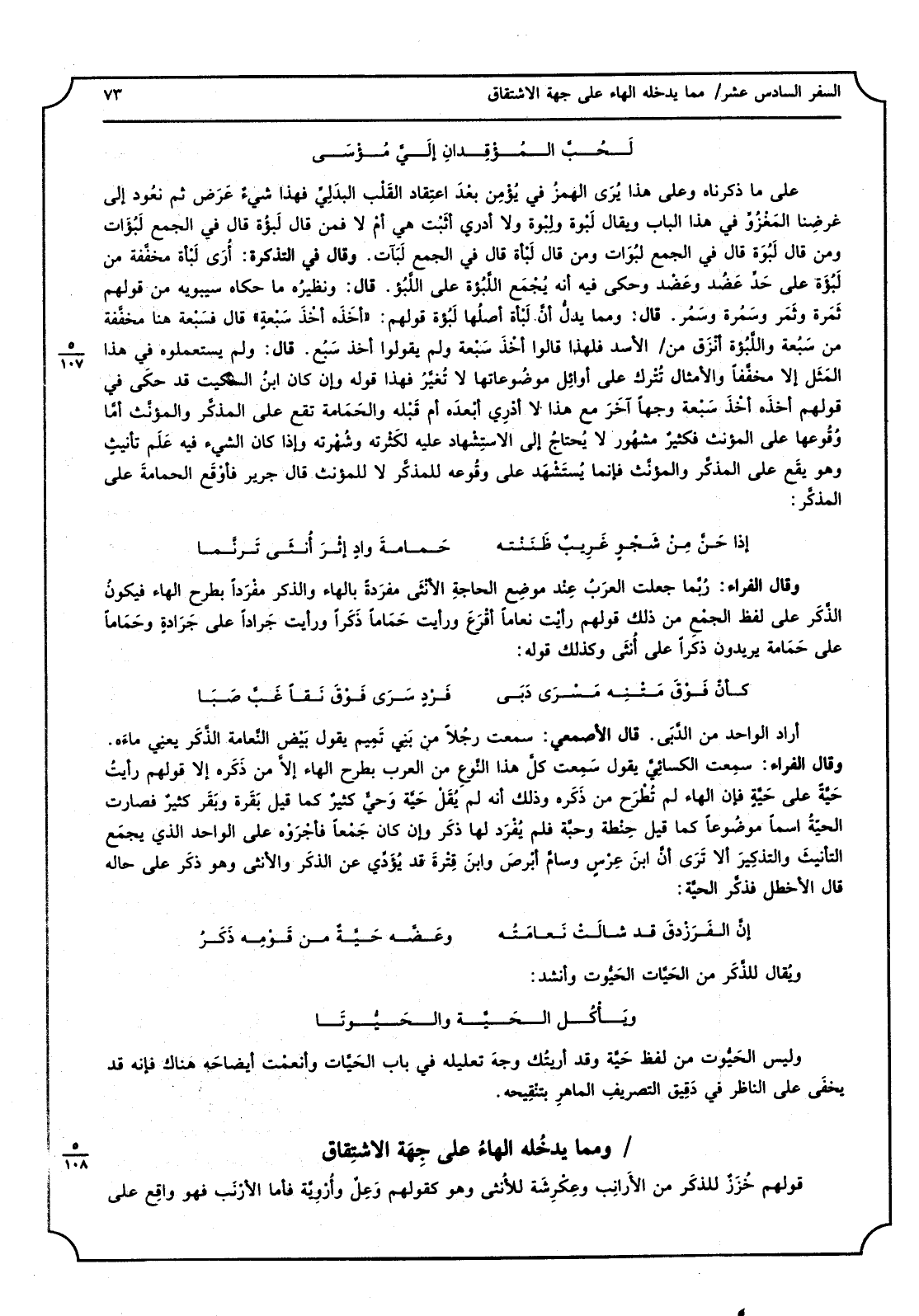 على مَا ذَكرْنَاهُ وعَلى هَذَا يُرَى الهمزُ فِي يُؤْمِن بعْدَ اعتِقاد القَلْب البدَلِيِّ فَهَذَا شيءٌ عَرَض ثمَّ نعُود إِلَى غرضِنا المَغْزُوِّ فِي هَذَا الْبَاب وَيُقَال لَبْوة ولِبْوة وَلَا أَدْرِي أثَبْت هِيَ أمْ لَا فَمن قَالَ لَبؤُة قَالَ فِي الْجمع لَبُؤَات وَمن قَالَ لَبُوَة قَالَ فِي الْجمع لبُوَات وَمن قَالَ لَبْاة قَالَ فِي الْجمع لَبَآت وَقَالَ فِي التَّذْكِرَة: أُرَى لَبْأة مخفَّفة من لَبُؤَة على حَدِّ عَضُد وَحكى فِيهِ أَنه يُجْمَع اللَّبُؤة على اللَّبُؤ قَالَ: ونظيرُه مَا جماه سِيبَوَيْهٍ من قَوْلهم ثَمَرة وثَمَر وسَمُرة وسَمُر قَالَ: وَمِمَّا يدلُّ أنَّ لَبْأة أصلُها لَبُؤة قَوْلهم: " أخَذَ سَبْعةٍ " قَالَ فسَبْعة هُنَا مخفَّفة من سَبُعه واللَّبُؤة أنْزَق من الْأسد فَلهَذَا قَالُوا أخْذَ سَبْعة وَلم يَقُولُوا أَخذ سَبُع قَالَ: وَلم يستعملوه فِي هَذَا المَثَل إِلَّا مخفَّفاً والأمثال تُتْرك على أوائِل موضُوعاتها لَا تُغيَّرُ فَهَذَا قَوْله وَإِن كَانَ ابنُ السّكيت قد حكَى فِي قَوْلهم أخذَه أخْذَ سَبْعة وَجها آخَرَ مَعَ هَذَا لَا أدْرِي أبْعدَه أم قَبْله والحَمَامة تقع على المذكَّر والمؤنَّث أمَّا وُقُوعها على الْمُؤَنَّث فكثيرٌ مشهُور لَا يُحتاجُ إِلَّا الاستِشْهاد عَلَيْهِ لكَثْرته وشُهْرته وَإِذا كَانَ الشَّيْء فِيهِ عَلَم تأنيثٍ وَهُوَ يقَع على المذكَّر والمؤنَّث فَإِنَّمَا يُستَشْهد على وقُوعه للمذكَّر لَا للمؤنث قَالَ جرير فأوْقَع الحمامةَ على المذكَّر: