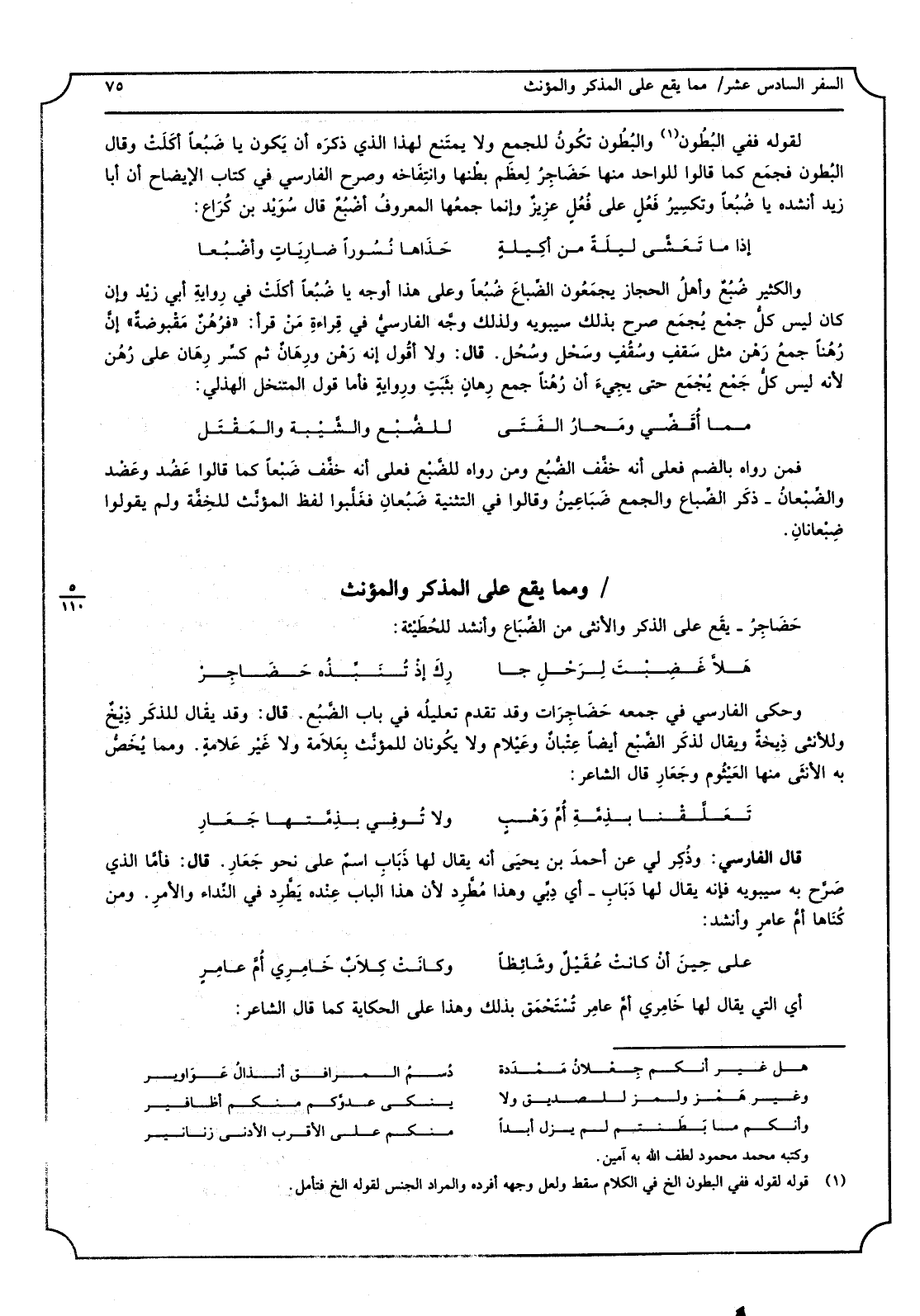 لقَوْله فَفِي البُطُون والبُطُون تكُونُ للْجمع وَلَا يمتَنع لهَذَا الَّذِي ذكرَه يَا ضَبُعاً أكَلَتْ وَقَالَ البُطون فجمَع كَمَا قَالُوا للْوَاحِد مِنْهَا حَضَاجِرُ لِعظضم بطْنها وانتِفضاخه وَصرح الْفَارِسِي فِي كتاب الْإِيضَاح أَن أَبَا زيد أنْشدهُ يَا ضُبُعاً وتكسِيرُ فَعُلٍ على فُعُلٍ عزِيزٌ وَإِنَّمَا جمعُها المعروفُ أضْبُعٌ قَالَ سُوَيْد بن كُرَاع: