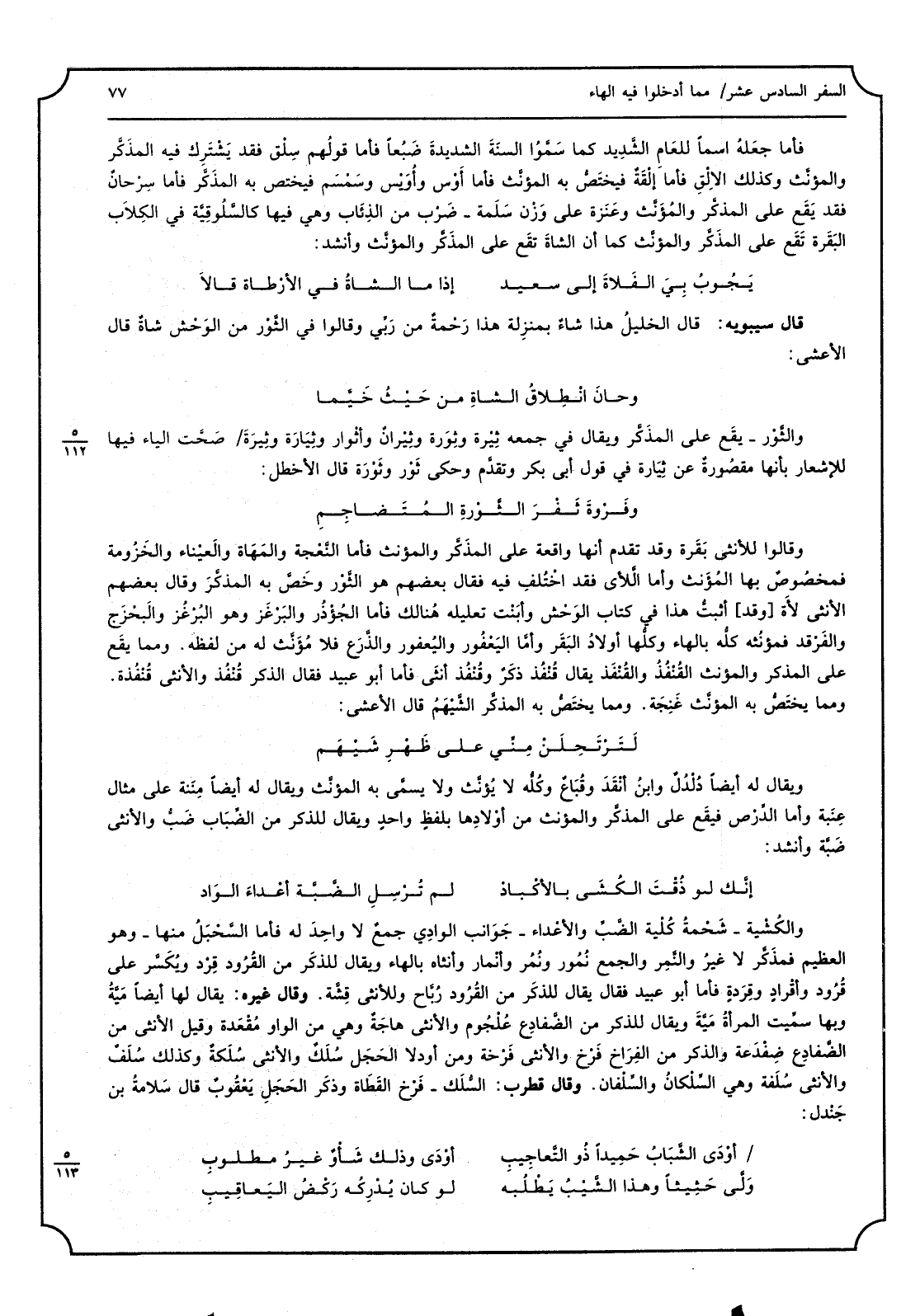 فَأَما جعَلهُ اسْما للعَامش الشَّدِيد كَمَا سَمَّوُا السنَةَ الشديدةَ ضَبُعاً فَأَما قولُهم سِلْق فقد يَشْتَرِك فِيهِ المذَكَّر والمؤنَّث وَكَذَلِكَ الإلْقِ فَأَما إلْقَةٌ فيختَصُّ بِهِ المؤنَّث فَأَما أَوْس وأُوَيْس وسَمْسَم فَيخْتَص بِهِ المذَكَّر فَأَما سِرْحانٌ فقد يَقَع على المذكَّر والمُؤَنَّث وعَنَزة على وَزْن سَلَمة - ضَرْب من الذِئَاب وَهِي فِيهَا كالسَّلُوقِيَّة فِي الكِلاَاب البَقَرة تقعَ على المذَكَّر والمؤنَّث كَمَا أَن الشاةَ تقَع على المذَكَّر والمؤنَّث وَأنْشد:
