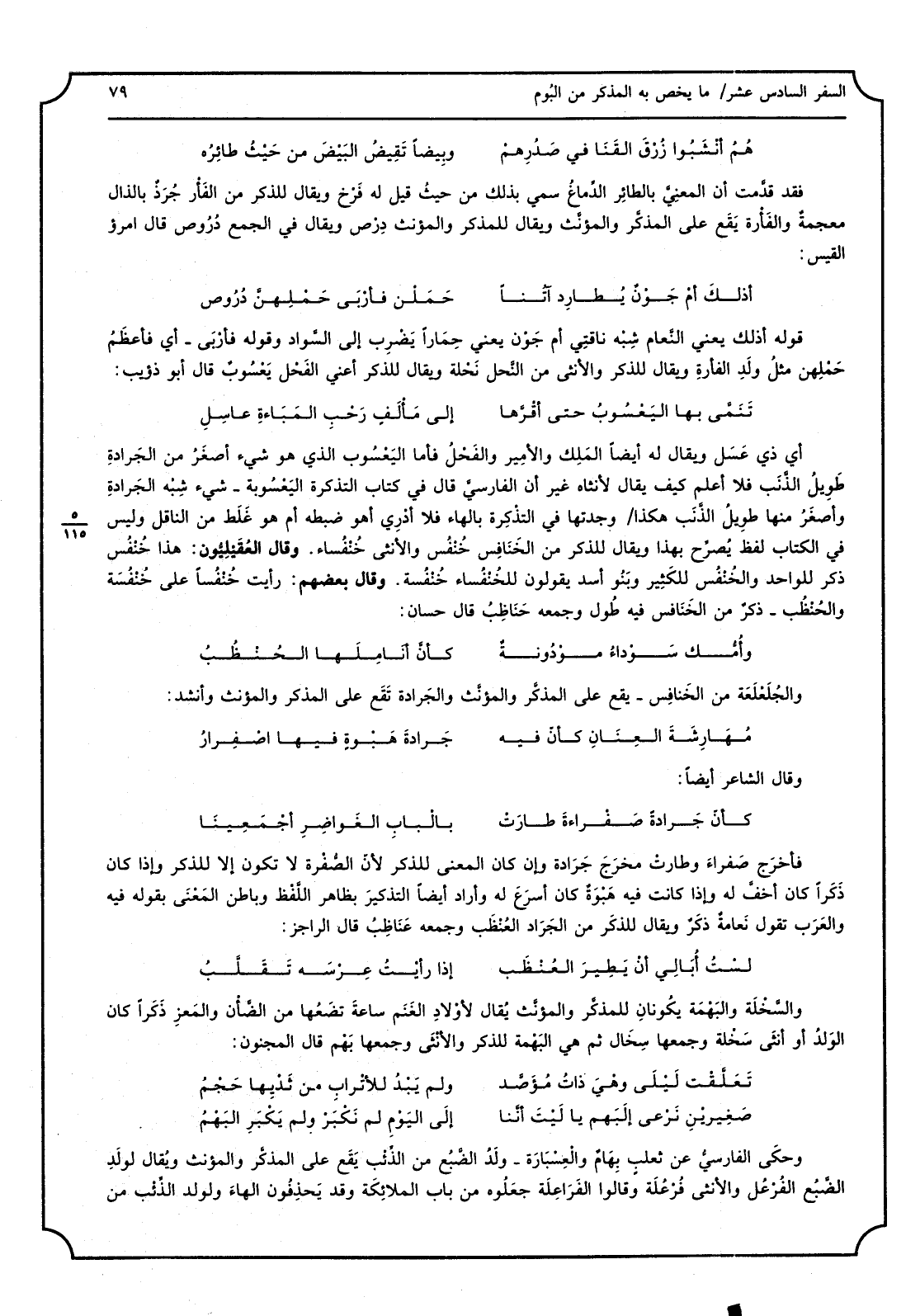 فأخرَج صَفراءَ وطارتْ مخرَجَ جَرَادة وَإِن كَانَ الْمَعْنى للذّكر لأنّ الصُّفْرة لَا تكون إِلَّا للذّكر وَإِذا كَانَ ذَكَراً كَانَ أخفَّ لَهُ وَإِذا كَانَت فِيهِ هَبْوَةٌ كَانَ أسرَعَ لَهُ وَأَرَادَ أَيْضا التذكيرَ بِظَاهِر اللَّفْظ وباطن المَعْنَى بقوله فِيهِ والعَرَب تَقول نَعامةٌ ذكَرٌ وَيُقَال للذَكَر من الجَرَاد العُنْظَب وَجمعه عَنَاظِبُ قَالَ الراجز: