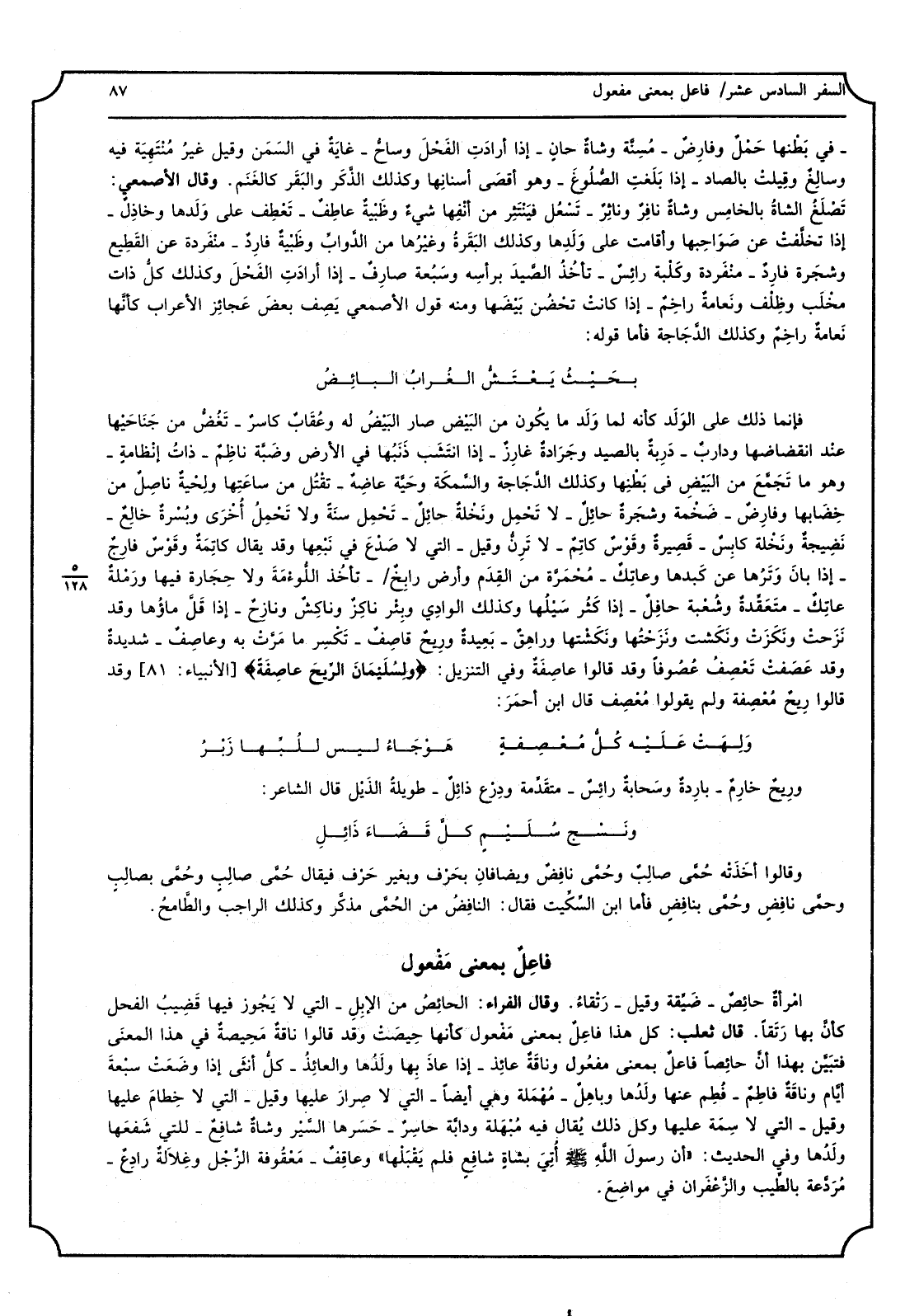 فَإِنَّمَا ذَلِك على الوَلَد كَأَنَّهُ لما وَلَد مَا يكُون من البَيْض صَار البَيْضُ لَهُ وعُقَابٌ كاسرٌ - تَغُضُّ من جَنَاحَيْها عنْد انقضاضها وداربٌ - دَرِبةٌ بالصيد وجَرَادةٌ غارِزٌ - إِذا انتَشَب ذَنَبُها فِي الأَرْض وضَبَّة ناظِمٌ - ذاتُ إنظامةٍ - وَهُوَ مَا تَجَمَّعَ من البَيْضِ فِي بَطْنِها وَكَذَلِكَ الدَّجَاجة والسَّمكَة وحَيَّة عاضِهٌ - تقْتُل من ساعَتِها ولِحْيةٌ ناصِلٌ من خَضَابها وفارِضٌ - ضَخْمة وشجَرةٌ حائِلٌ - لَا تَحْمِل ونَخْلةٌ حائِلٌ - تَحْمِل سَنةً وَلَا تَحْمِل أُخْرَى وبُسْرةٌ خالِعٌ - نَضِيجةٌ ونخْلة كابِسٌ - قَصِيرةٌ وقَوْسٌكاتِمٌ - لَا تَرِنُّ وَقيل - الَّتِي لَا صَدْعَ فِي نَبْعِها وَقد يُقَال كاتِمَةٌ وقَوْسٌ فارِجٌ - إِذا بانَ وَتَرُها عَن كَبدها وعاتِكٌ - مُحْمَرَّة من القِدَم وَأَرْض رابِخٌ - تأخُذ اللُّوءْمَةَ وَلَا حجَارة فِيهَا ورَمْلةٌ عاتِكٌ - متَعَقِّدةٌ وشُعْبة حافِلٌ - إِذا كَثُرَ سَيْلُها وَكَذَلِكَ الوادِي وبِئْر ناكِزٌ وناكِشٌ ونازِحٌ - إِذا قَ لَّ ماؤُها وَقد نَزَحتْ ونَكَزَتْ ونَكشت ونَزَحْتُها ونَكَشْتها وراهِقٌ - بَعِيدةٌ ورِيحٌ قاصِفٌ - تَكْسِر مَا مَرَّتْ بِهِ وعاصِفٌ - شديدةٌ وَقد عَصَفتْ تَعْصِفُ عُصُوفاً وَقد قَالُوا عاصِفَةٌ وَفِي التَّنْزِيل: {ولِسُلَيْمَانَ الرِّيحَ عاصِفَةً} [الْأَنْبِيَاء: 81] وَقد قَالُوا رِيحٌ مُعْصِفة وَلم يَقُولُوا مُعْصِف قَالَ ابْن أحمَرَ: