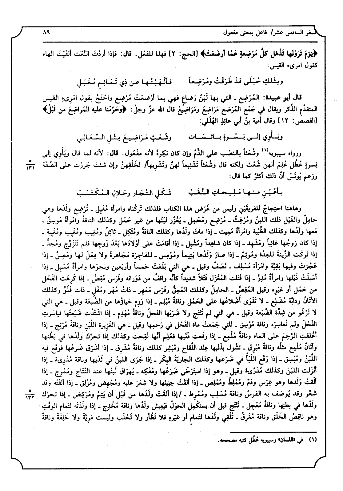 {يَوْمَ تَرَوْنَها تَذْهَل كلُّ مُرْضِعةٍ عَمَّا أرضَعَتْ} [الْحَج: 2] فَهَذَا للفعْل قَالَ: فَإِذا أردْتَ النَّعْت ألقَيْتَ الْهَاء كَقَوْل امْرِئ الْقَيْس: