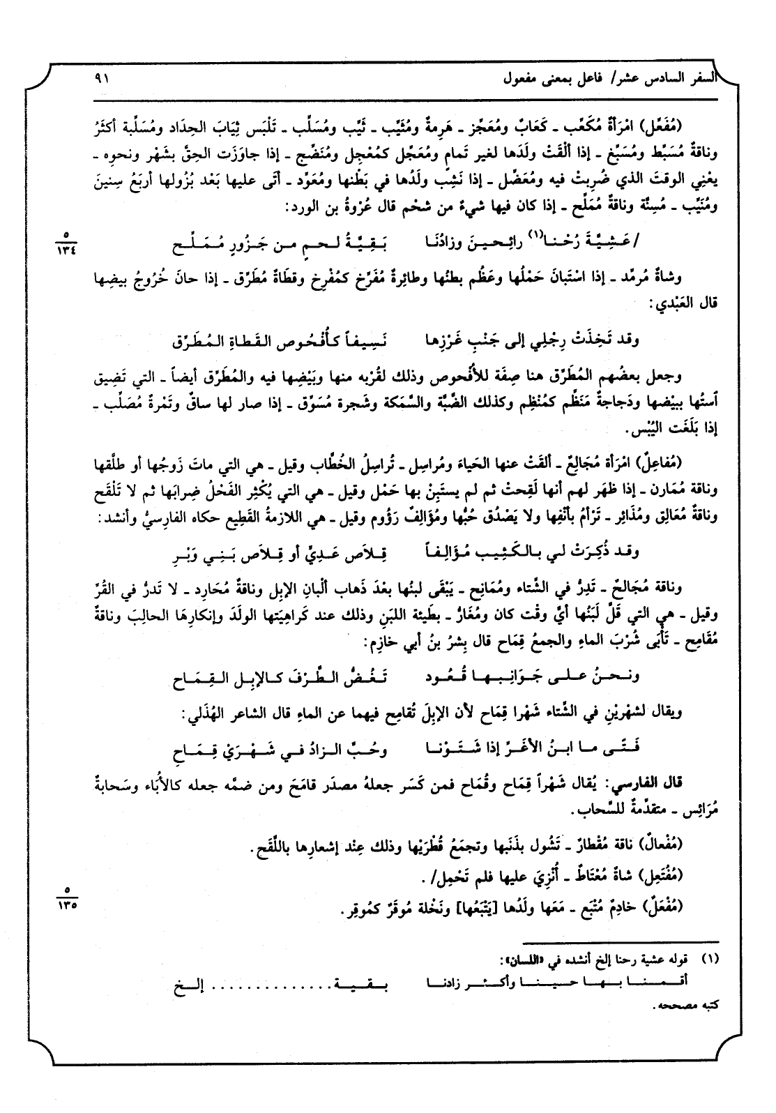 (مُفَعِّل) امْرَأةٌ مُكَعِّب - كَعَابٌ ومُعَجَّز - هَرِمةٌ ومُثَيِّب - ثَيِّب ومُسَلِّب - تَلْبَس ثِيَابَ الحِدَاد ومُسَلِّبة أكثَرُ وناقةٌ مُسَبِّط ومُسَبِّغ - إِذا ألْقَتْ ولَدَها لغير تَمامٍ ومُعَجِّل كمُعْجِل ومُنَضِّج - إِذا جاوَزَت الحِقَّ بشَهْر ونحوِه - يعْنِي الوقتَ الَّذِي ضُرِبتْ فِيهِ ومُعَضِّل - إِذا نَشِب ولَدُها فِي بَطْنها ومُعَوِّد - أتَى عَلَيْهَا بَعْد بُزُولها أربَعُ سِنينَ ومُنَيِّب - مُسِنَّة وناقةٌ مُمَلِّح - إِذا كَانَ فِيهَا شيءٌ من شحْم قَالَ عُرْوةُ بن الْورْد: