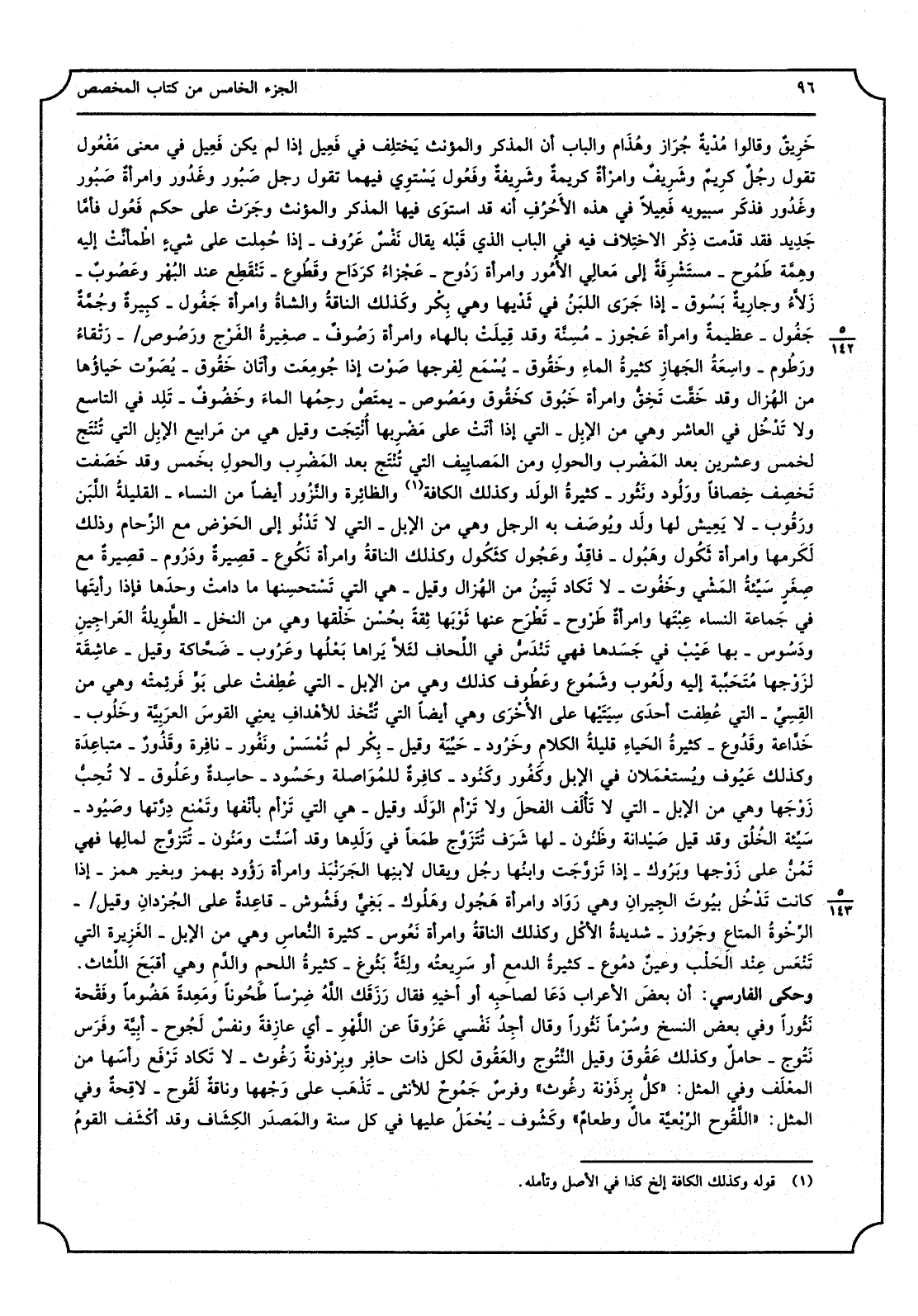 خَرِيقٌ وَقَالُوا مُدْيةٌ جَرَاز وهُذَام وَالْبَاب أَن الْمُذكر والمؤنث يَختلِف فِي فَعِيل إِذا لم يكن فَعِيل فِي معنى مَفْعُول تَقول رجُلٌّ كرِيمٌ وشَرِيفٌ وامْرأةٌ كريمةٌ وشَرِيفةٌ وفَعُول يَسْتوِي فيهمَا تَقول رجل صَبُور وغَدُور وامرأةٌ صَبُور وغَدُور فذكَر سِيبَوَيْهٍ فَعِيلاً فِي هَذِه الأَحُرُفِ أَنه قد استوَى فِيهَا الْمُذكر والمؤنث وجَرَتْ على حكم فَعُول فأمَّا جَدِيد فقد قدّمت ذِكْر الاختِلاف فِيهِ فِي الْبَاب الَّذِي قَبْله يُقَال نَفْسٌ عَرُوف - إِذا حُمِلت على شيءٍ اطْمأنَّتْ إِلَيْهِ وهِمَّة طَمُوح - مستَشْرِفَةٌ إِلَى مَعالِي الأُمُور وَامْرَأَة رَدُوح - عَجْزاءُ كرَدَاح وقَطُوع - تَنْقَطِع عِنْد البُهْر وعَصُوبٌ - زَلاّءُ وجارِيةٌ بَسُوق - إِذا جَرَى اللبَنُ فِي ثَدْيها وَهِي بِكْر وكَذلك الناقةُ والشاةُ وَامْرَأَة جَفُول - كبِيرةٌ وجُمَّةٌ جَفُول - عظيمةٌ وَامْرَأَة عَجْوز - مُسِنَّة وَقد قِيلَتْ بِالْهَاءِ وَامْرَأَة رَصُوفٌ - صغِيرةُ الفَرْج ورَصُوص - رَتْقاءُ ورَطُوم - واسِعَةُ الجِهازِ كثيرةُ الماءِ وخَقُوق - يُسْمَع لِفرجها صَوْت إِذا جُومِعَت وأتاَن خَقُوق - يُصَوِّت حَياؤُها من الهُزال وَقد خَقَّت تَخِقُّ وَامْرَأَة خَبُوق كخَقُوق ومَصُوص - يمتَصُّ رحِمُها الماءَ وخَضُوفٌ - تَلِد فِي التَّاسِع وَلَا تَدْخُل فِي الْعَاشِر وَهِي من الإبِل - الَّتِي إِذا أتَتْ على مَضْرٍبها أُنْتِجَت وَقيل هِيَ من مَرابيع الإبِل الَّتِي تُنْتَج لخمس وَعشْرين بعد المَضْرب والحولِ وَمن المَصايِيف الَّتِي تُنْتَج بعد المَضْرِب والحولِ بخَمس وَقد خَصَفت تَخصِف خِصافا ووَلُود ونَثُور - كثيرةُ الوَلد وَكَذَلِكَ الكافة والظائِرة والنَّزُور أَيْضا من النِّسَاء - القليلةُ اللِّبَن ورَقُوب - لَا يَعِيش لَهَا ولَد ويُوصَف بِهِ الرجل وَهِي من الْإِبِل - الَّتِي لَا تَدْنُو إِلَى الحَوْض مَعَ الزِّحام وَذَلِكَ لَكَرمها وَامْرَأَة ثَكُول وهَبُول - فاقِدٌ وعَجُول كثَكُول وَكَذَلِكَ الناقةُ وَامْرَأَة نَكُوع - قصِيرةٌ ودَرُوم - قصيرةٌ مَعَ صِغَرِ سَيِّئةُ المَشْي وخَفُوت - لَا تَكاد تَبِينُ من الهُزال وَقيل - هِيَ الَّتِي تَسْتحسِنها مَا دامتْ وحدَها فَإِذا رأيتَها فِي جَماعة النِّسَاء عِبْتَها وامرأةٌ طَرْوح - تَطْرَح عَنْهَا ثَوْبَها ثِقةً بحُسْن خَلْقها وَهِي من النهل - الطَّوِيلةُ العَراجِينِ ودَسُوس - بهَا عَيْبْ فِي جَسَدها فَهِيَ تَنْدَسُّ فِي اللِّحاف لئَلاَّ يَراها بَعْلُها وعَرُوب - ضَحَّاكة وَقيل - عاشِقَة لزَوْجها مُتَحَبِّبة إِلَيْهِ ولَعُوب وشَمُوع وعَطُوف كَذَلِك وَهِي من الْإِبِل - الَّتِي عُطِفتْ على بَوٍّ فَرئِمتْه وَهِي من القِسِيِّ - الَّتِي عُطِفت أحدَى سِيَتَيْها على الأُخْرَى وَهِي أَيْضا الَّتِي تُتَّخذ للأهْدافِ يعنِي القوسَ العرَبِيَّة وخَلُوب - خَدَّاعة وقَدُوح - كثيرةُ الحَياءِ قليلةُ الْكَلَام وخَرُود - حَيِّيَة وَقيل - بَكْر لم تُمْسَسْ ونَفُور - نافِرة وقَذُورٌ - متباعِدَة وَكَذَلِكَ عَيُوف ويُستعْمَلان فِي الْإِبِل وكَفُور وكَنُود - كافِرةٌ للمُوَاصلة وحَسُود - حاسِدةٌ وعَلُوق - لَا تُحِبُّ زَوْجَها وَهِي من الْإِبِل - الَّتِي لَا تَأْلَف الفحلَ وَلَا تَرْأم الوَلَد - هِيَ الَّتِي تَرْأم بأنْفها وتَمْنع دِرَّتها وصَيُود - سَيِّئة الخُلُق وَقد قيل صَيْدانة وظَنُون - لَهَا شَرَف تُتَزَوَّج طمَعاً فِي وَلَدِها وَقد أسَنَّت ومَنُون - تُتَزوَّج لمالِها فَهِيَ تَمُنُّ على زَوْجها وبَرُوك - إِذا تَزوَّجَت وابنُها رجُل وَيُقَال لابنِها الجَرَنْبَذ وَامْرَأَة رَؤُود بهمز وَبِغير همز - إِذا كَانَت تَدْخُل بيُوتَ الجيرانِ وَهِي رَوَاد وَامْرَأَة هَجُول وهَلُوك - بَغِيٌّ وفَشُوش - قاعِدةٌ على الجُرْدانِ وَقيل - الرِّخْوةُ المتاعِ وجَرُوز - شديدةُ الأكْل وَكَذَلِكَ النَّاقة وَامْرَأَة نَغُوس - كَثِيرَ