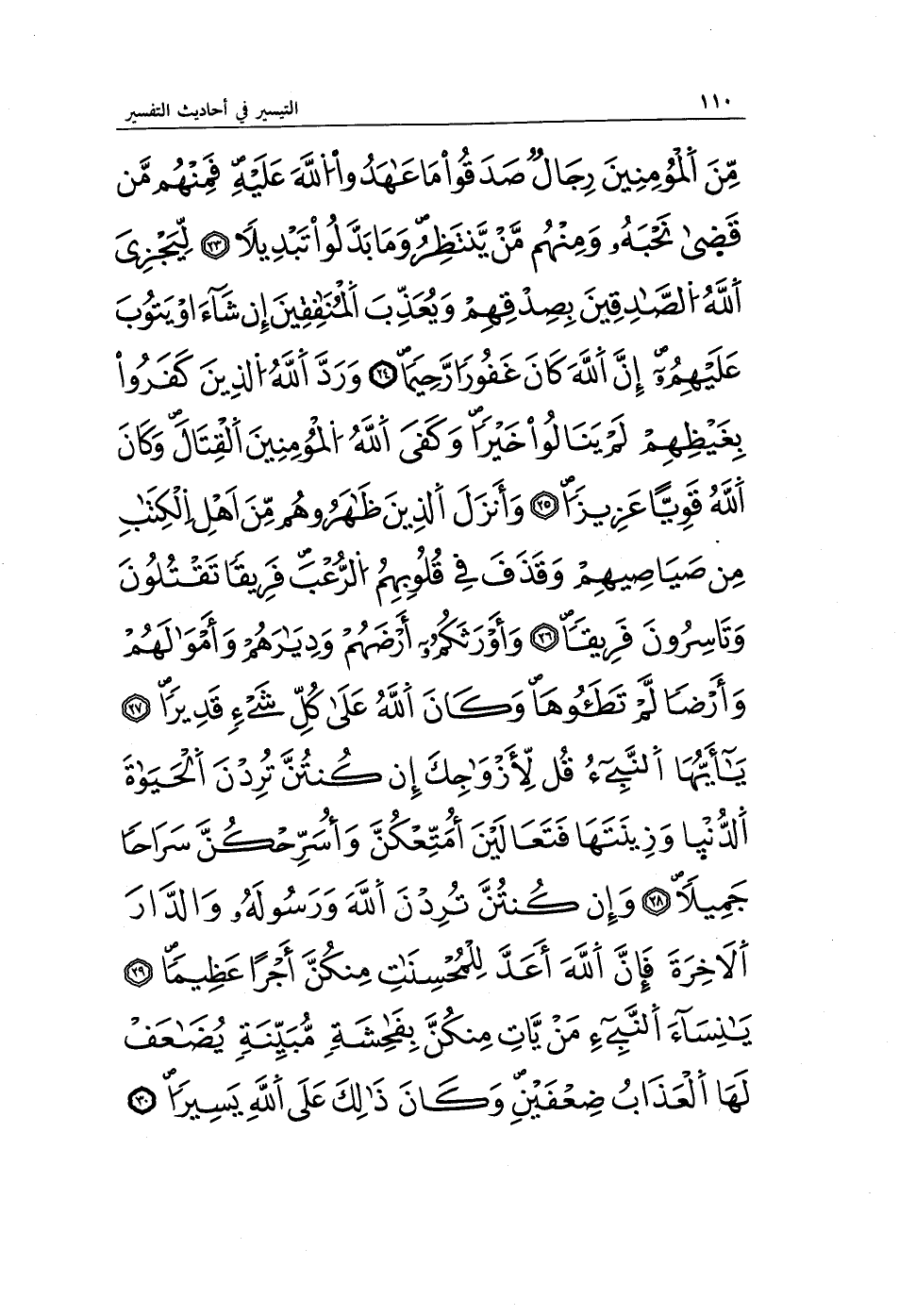 مِنَ الْمُؤْمِنِينَ رِجَالٌ صَدَقُوا مَا عَاهَدُوا اللَّهَ عَلَيْهِ فَمِنْهُمْ مَنْ قَضَى نَحْبَهُ وَمِنْهُمْ مَنْ يَنْتَظِرُ وَمَا بَدَّلُوا تَبْدِيلًا (23) لِيَجْزِيَ اللَّهُ الصَّادِقِينَ بِصِدْقِهِمْ وَيُعَذِّبَ الْمُنَافِقِينَ إِنْ شَاءَ أَوْ يَتُوبَ عَلَيْهِمْ إِنَّ اللَّهَ كَانَ غَفُورًا رَحِيمًا (24) وَرَدَّ اللَّهُ الَّذِينَ كَفَرُوا بِغَيْظِهِمْ لَمْ يَنَالُوا خَيْرًا وَكَفَى اللَّهُ الْمُؤْمِنِينَ الْقِتَالَ وَكَانَ اللَّهُ قَوِيًّا عَزِيزًا (25) وَأَنْزَلَ الَّذِينَ ظَاهَرُوهُمْ مِنْ أَهْلِ الْكِتَابِ مِنْ صَيَاصِيهِمْ وَقَذَفَ فِي قُلُوبِهِمُ الرُّعْبَ فَرِيقًا تَقْتُلُونَ وَتَأْسِرُونَ فَرِيقًا (26) وَأَوْرَثَكُمْ أَرْضَهُمْ وَدِيَارَهُمْ وَأَمْوَالَهُمْ وَأَرْضًا لَمْ تَطَئُوهَا وَكَانَ اللَّهُ عَلَى كُلِّ شَيْءٍ قَدِيرًا (27) يَا أَيُّهَا النَّبِيُّ قُلْ لِأَزْوَاجِكَ إِنْ كُنْتُنَّ تُرِدْنَ الْحَيَاةَ الدُّنْيَا وَزِينَتَهَا فَتَعَالَيْنَ أُمَتِّعْكُنَّ وَأُسَرِّحْكُنَّ سَرَاحًا جَمِيلًا (28) وَإِنْ كُنْتُنَّ تُرِدْنَ اللَّهَ وَرَسُولَهُ وَالدَّارَ الْآخِرَةَ فَإِنَّ اللَّهَ أَعَدَّ لِلْمُحْسِنَاتِ مِنْكُنَّ أَجْرًا عَظِيمًا (29) يَا نِسَاءَ النَّبِيِّ مَنْ يَأْتِ مِنْكُنَّ بِفَاحِشَةٍ مُبَيِّنَةٍ يُضَاعَفْ لَهَا الْعَذَابُ ضِعْفَيْنِ وَكَانَ ذَلِكَ عَلَى اللَّهِ يَسِيرًا (30)