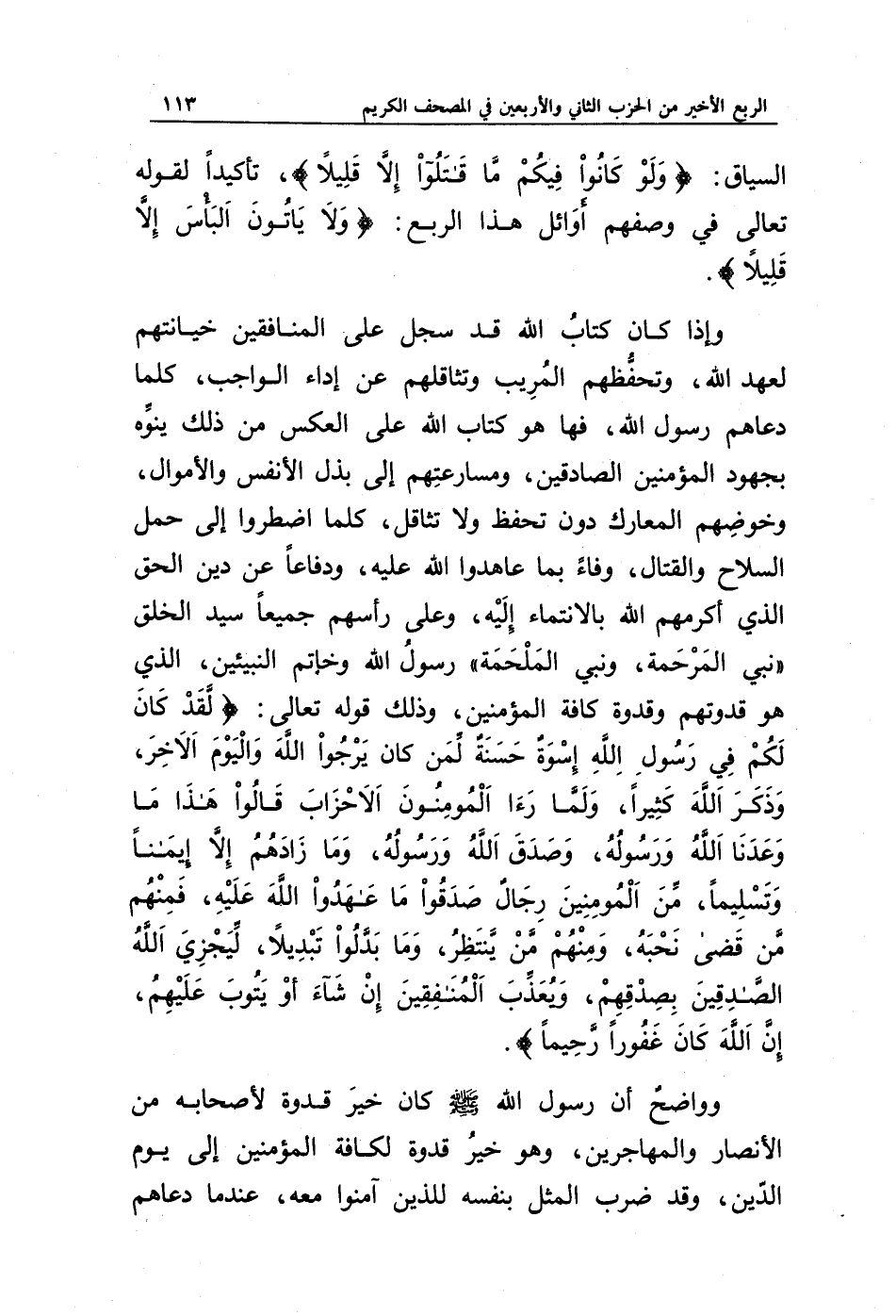 وإذا كان كتاب الله قد سجل على المنافقين خيانتهم لعهد الله، وتحفظهم المريب وتثاقلهم عن أداء الواجب، كلما دعاهم رسول الله، فها هو كتاب الله على العكس من ذلك ينوه بجهود المؤمنين الصادقين، ومسارعتهم إلى بذل الأنفس والأموال، وخوضهم المعارك دون تحفظ ولا تثاقل، كلما اضطروا إلى حمل السلاح والقتال، وفاءً بما عاهدوا الله عليه، ودفاعا عن دين الحق الذي أكرمهم الله بالانتماء إليه، وعلى رأسهم جميعا سيد الخلق (نبي المرحمة، ونبي الملحمة) رسول الله وخاتم النبيين، الذي هو قدوتهم وقدوة كافة المؤمنين، وذلك قوله تعالى: {لَقَدْ كَانَ لَكُمْ فِي رَسُولِ اللَّهِ أُسْوَةٌ حَسَنَةٌ لِمَنْ كَانَ يَرْجُو اللَّهَ وَالْيَوْمَ الْآخِرَ وَذَكَرَ اللَّهَ كَثِيرًا * وَلَمَّا رَأَى الْمُؤْمِنُونَ الْأَحْزَابَ قَالُوا هَذَا مَا وَعَدَنَا اللَّهُ وَرَسُولُهُ وَصَدَقَ اللَّهُ وَرَسُولُهُ وَمَا زَادَهُمْ إِلَّا إِيمَانًا وَتَسْلِيمًا * مِنَ الْمُؤْمِنِينَ رِجَالٌ صَدَقُوا مَا عَاهَدُوا اللَّهَ عَلَيْهِ فَمِنْهُمْ مَنْ قَضَى نَحْبَهُ وَمِنْهُمْ مَنْ يَنْتَظِرُ وَمَا بَدَّلُوا تَبْدِيلًا * لِيَجْزِيَ اللَّهُ الصَّادِقِينَ بِصِدْقِهِمْ وَيُعَذِّبَ الْمُنَافِقِينَ إِنْ شَاءَ أَوْ يَتُوبَ عَلَيْهِمْ إِنَّ اللَّهَ كَانَ غَفُورًا رَحِيمًا}.