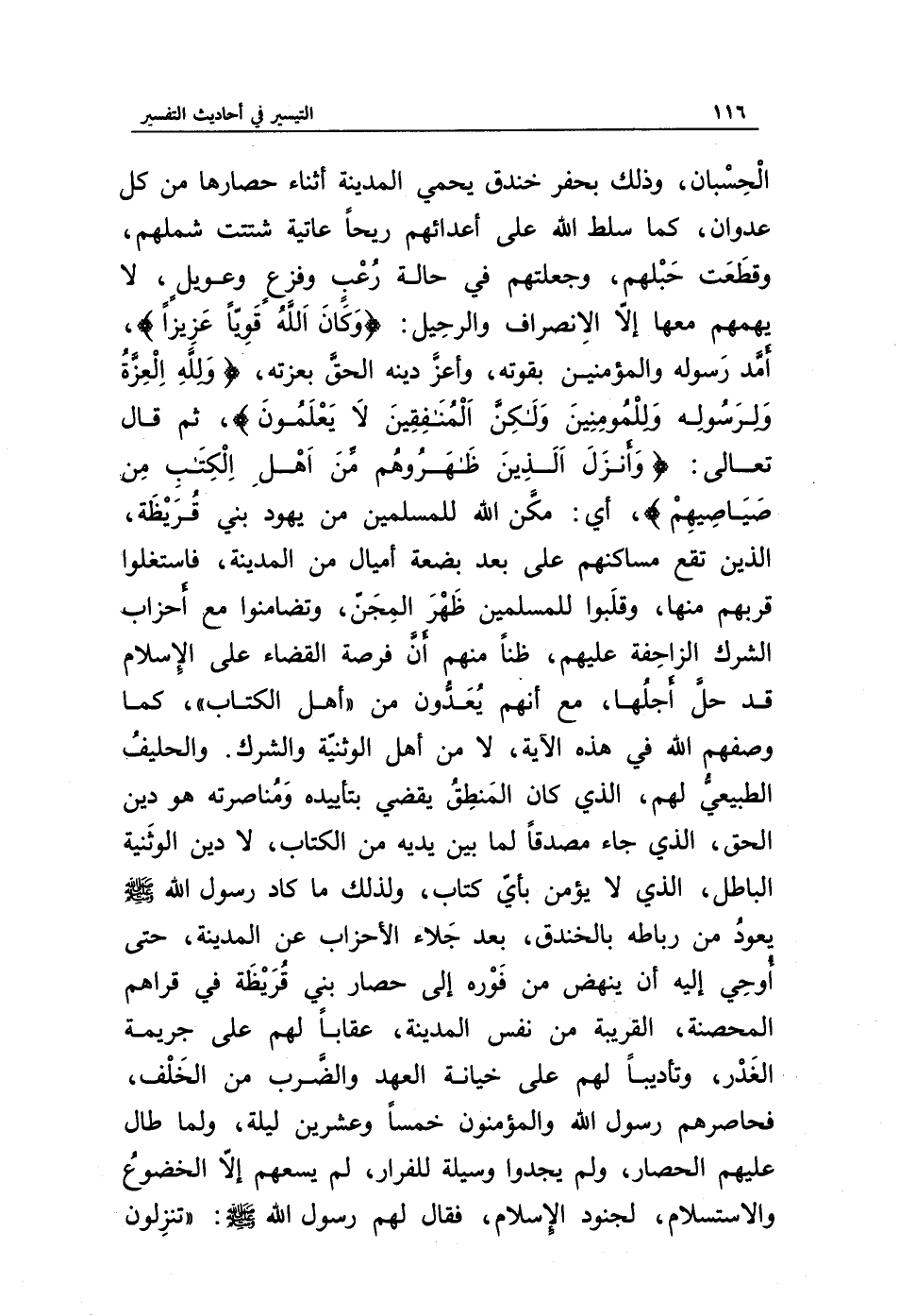 الحسبان، وذلك بحفر خندق يحمي المدينة أثناء حصارها من كل عدوان، كما سلط الله على أعدائهم ريحا عاتية شتتت شملهم، وقطعت حبلهم، وجعلتهم في حالة رعب وفزع وعويل، لا يهمهم معها إلا الانصراف والرحيل: {وَكَانَ اللَّهُ قَوِيًّا عَزِيزًا}، أمد رسوله والمؤمنين بقوته، وأعز دينه الحق بعزته، {وَلِلَّهِ الْعِزَّةُ وَلِرَسُولِهِ وَلِلْمُؤْمِنِينَ وَلَكِنَّ الْمُنَافِقِينَ لَا يَعْلَمُونَ}، ثم قال تعالى: {وَأَنْزَلَ الَّذِينَ ظَاهَرُوهُمْ مِنْ أَهْلِ الْكِتَابِ مِنْ صَيَاصِيهِمْ}، أي: مكن الله للمسلمين من يهود بني قريظة الذين تقع مساكنهم على بعد بضعة أميال من المدينة، فاستغلوا قربهم منها، وقلبوا للمسلمين ظهر المجن، وتضامنوا مع أحزاب الشرك الزاحفة عليهم، ظنا منهم أن فرصة القضاء على الإسلام قد حل أجلها، مع أنهم يعدون من (أهل الكتاب)، كما وصفهم الله في هذه الآية، لا من أهل الوثنية والشرك. والحليف الطبيعي لهم، الذي كان المنطق يقضي بتأييده ومناصرته هو دين الحق، الذي جاء مصدقا لما بين يديه من الكتاب، لا دين الوثنية الباطل، الذي لا يؤمن بأي كتاب، ولذلك ما كاد رسول الله صلى الله عليه وسلم يعود من رباطه بالخندق، بعد جلاء الأحزاب عن المدينة، حتى أوحي إليه أن ينهض من فوره إلى حصار بني قريظة في قراهم المحصنة، القريبة من نفس المدينة، عقابا لهم على جريمة الغدر، وتأديبا لهم على خيانة العهد والضرب من الخلف، فحاصرهم رسول الله والمؤمنون خمسا وعشرين ليلة، ولما طال عليهم الحصار، ولم يجدوا وسيلة للفرار، لم يسعهم إلا الخضوع والاستسلام، لجنود الإسلام، فقال لهم رسول الله صلى الله عليه وسلم: "تنزلون