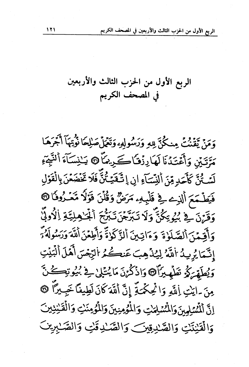 وَمَنْ يَقْنُتْ مِنْكُنَّ لِلَّهِ وَرَسُولِهِ وَتَعْمَلْ صَالِحًا نُؤْتِهَا أَجْرَهَا مَرَّتَيْنِ وَأَعْتَدْنَا لَهَا رِزْقًا كَرِيمًا (31) يَا نِسَاءَ النَّبِيِّ لَسْتُنَّ كَأَحَدٍ مِنَ النِّسَاءِ إِنِ اتَّقَيْتُنَّ فَلَا تَخْضَعْنَ بِالْقَوْلِ فَيَطْمَعَ الَّذِي فِي قَلْبِهِ مَرَضٌ وَقُلْنَ قَوْلًا مَعْرُوفًا (32) وَقَرْنَ فِي بُيُوتِكُنَّ وَلَا تَبَرَّجْنَ تَبَرُّجَ الْجَاهِلِيَّةِ الْأُولَى وَأَقِمْنَ الصَّلَاةَ وَآتِينَ الزَّكَاةَ وَأَطِعْنَ اللَّهَ وَرَسُولَهُ إِنَّمَا يُرِيدُ اللَّهُ لِيُذْهِبَ عَنْكُمُ الرِّجْسَ أَهْلَ الْبَيْتِ وَيُطَهِّرَكُمْ تَطْهِيرًا (33) وَاذْكُرْنَ مَا يُتْلَى فِي بُيُوتِكُنَّ مِنْ آيَاتِ اللَّهِ وَالْحِكْمَةِ إِنَّ اللَّهَ كَانَ لَطِيفًا خَبِيرًا (34) إِنَّ الْمُسْلِمِينَ وَالْمُسْلِمَاتِ وَالْمُؤْمِنِينَ وَالْمُؤْمِنَاتِ وَالْقَانِتِينَ وَالْقَانِتَاتِ وَالصَّادِقِينَ وَالصَّادِقَاتِ وَالصَّابِرِينَ