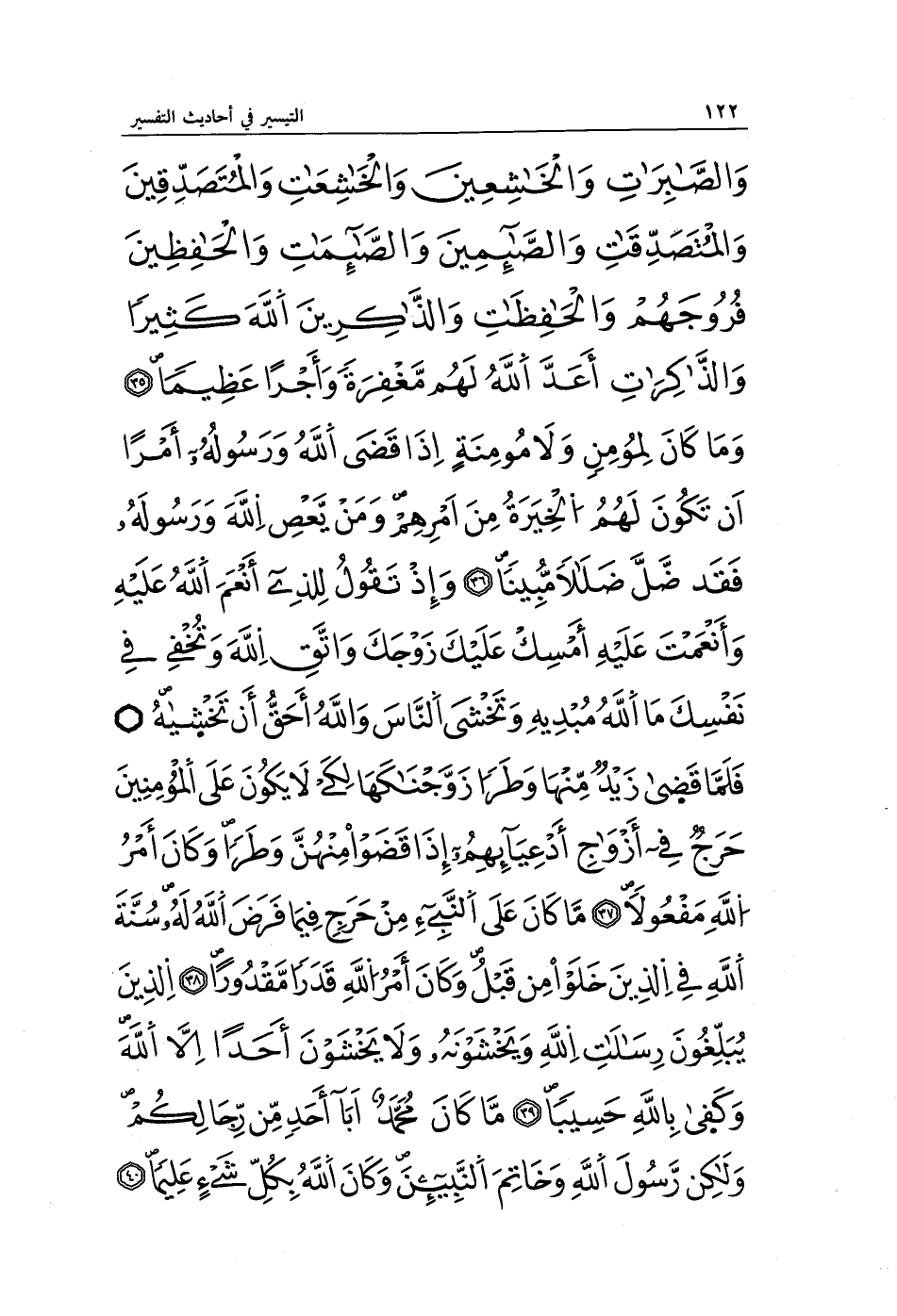وَالصَّابِرَاتِ وَالْخَاشِعِينَ وَالْخَاشِعَاتِ وَالْمُتَصَدِّقِينَ وَالْمُتَصَدِّقَاتِ وَالصَّائِمِينَ وَالصَّائِمَاتِ وَالْحَافِظِينَ فُرُوجَهُمْ وَالْحَافِظَاتِ وَالذَّاكِرِينَ اللَّهَ كَثِيرًا وَالذَّاكِرَاتِ أَعَدَّ اللَّهُ لَهُمْ مَغْفِرَةً وَأَجْرًا عَظِيمًا (35) وَمَا كَانَ لِمُؤْمِنٍ وَلَا مُؤْمِنَةٍ إِذَا قَضَى اللَّهُ وَرَسُولُهُ أَمْرًا أَنْ يَكُونَ لَهُمُ الْخِيَرَةُ مِنْ أَمْرِهِمْ وَمَنْ يَعْصِ اللَّهَ وَرَسُولَهُ فَقَدْ ضَلَّ ضَلَالًا مُبِينًا (36) وَإِذْ تَقُولُ لِلَّذِي أَنْعَمَ اللَّهُ عَلَيْهِ وَأَنْعَمْتَ عَلَيْهِ أَمْسِكْ عَلَيْكَ زَوْجَكَ وَاتَّقِ اللَّهَ وَتُخْفِي فِي نَفْسِكَ مَا اللَّهُ مُبْدِيهِ وَتَخْشَى النَّاسَ وَاللَّهُ أَحَقُّ أَنْ تَخْشَاهُ فَلَمَّا قَضَى زَيْدٌ مِنْهَا وَطَرًا زَوَّجْنَاكَهَا لِكَيْ لَا يَكُونَ عَلَى الْمُؤْمِنِينَ حَرَجٌ فِي أَزْوَاجِ أَدْعِيَائِهِمْ إِذَا قَضَوْا مِنْهُنَّ وَطَرًا وَكَانَ أَمْرُ اللَّهِ مَفْعُولًا (37) مَا كَانَ عَلَى النَّبِيِّ مِنْ حَرَجٍ فِيمَا فَرَضَ اللَّهُ لَهُ سُنَّةَ اللَّهِ فِي الَّذِينَ خَلَوْا مِنْ قَبْلُ وَكَانَ أَمْرُ اللَّهِ قَدَرًا مَقْدُورًا (38) الَّذِينَ يُبَلِّغُونَ رِسَالَاتِ اللَّهِ وَيَخْشَوْنَهُ وَلَا يَخْشَوْنَ أَحَدًا إِلَّا اللَّهَ وَكَفَى بِاللَّهِ حَسِيبًا (39) مَا كَانَ مُحَمَّدٌ أَبَا أَحَدٍ مِنْ رِجَالِكُمْ وَلَكِنْ رَسُولَ اللَّهِ وَخَاتَمَ النَّبِيِّينَ وَكَانَ اللَّهُ بِكُلِّ شَيْءٍ عَلِيمًا (40)
