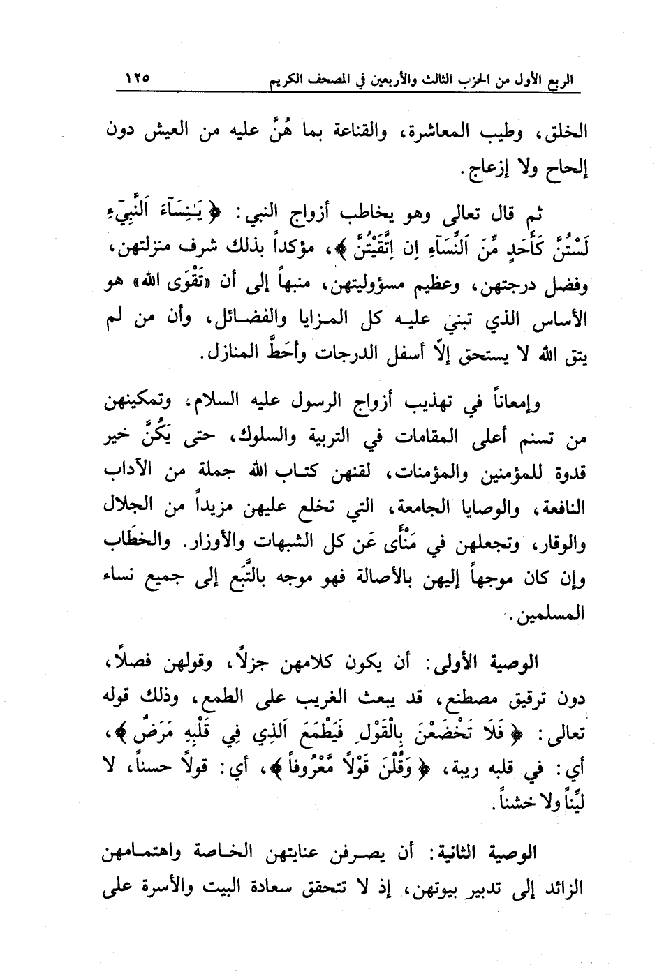 وإمعانا في تهذيب أزواج الرسول عليه السلام، وتمكينهن من تسنم أعلى المقامات في التربية والسلوك، حتى يكن خير قدوة للمؤمنين والمؤمنات، لقنهن كتاب الله جملة من الآداب النافعة، والوصايا الجامعة، التي تخلع عليهن مزيدا من الجلال والوقار، وتجعلهن في منأى عن كل الشبهات والأوزار. والخطاب وإن كان موجها إليهن بالأصالة فهو موجه بالتبع إلى جميع نساء المسلمين.