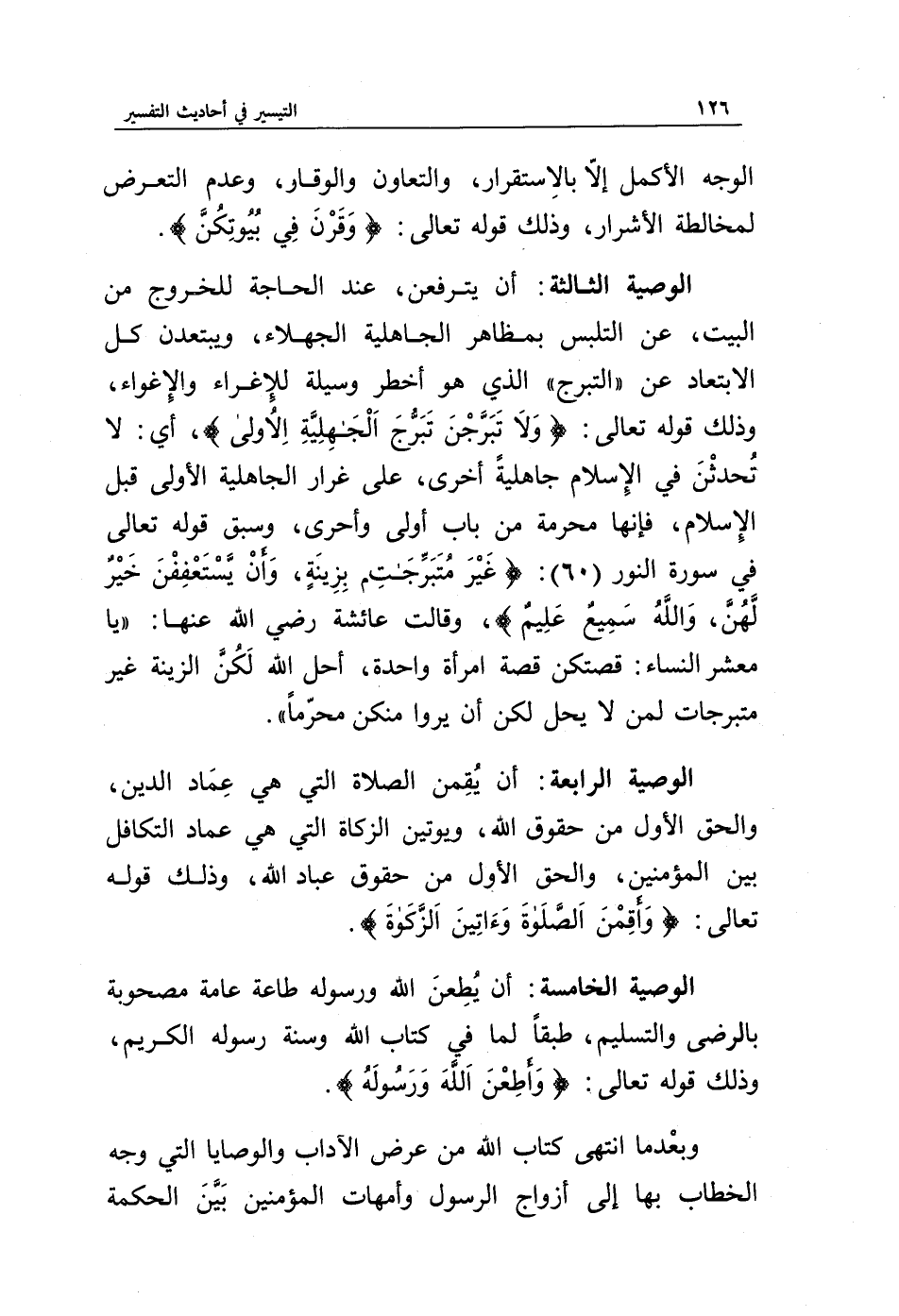الوصية الثالثة: أن يترفعن، عند الحاجة للخروج من البيت، عن التلبس بمظاهر الجاهلية الجهلاء، ويبتعدن كل الابتعاد عن (التبرج) الذي هو أخطر وسيلة للإغراء والإغواء، وذلك قوله تعالى: {وَلَا تَبَرَّجْنَ تَبَرُّجَ الْجَاهِلِيَّةِ الْأُولَى}، أي: لا تحدثن في الإسلام جاهلية أخرى، على غرار الجاهلية الأولى قبل الإسلام، فإنها محرمة من باب أولى وأحرى، وسبق قوله تعالى في سورة النور (60): {غَيْرَ مُتَبَرِّجَاتٍ بِزِينَةٍ وَأَنْ يَسْتَعْفِفْنَ خَيْرٌ لَهُنَّ وَاللَّهُ سَمِيعٌ عَلِيمٌ}، وقالت عائشة رضي الله عنها: (يا معشر النساء: قصتكن قصة امرأة واحدة، أحل الله لكن الزينة غير متبرجات لمن لا يحل لكن أن يروا منكن محرما).