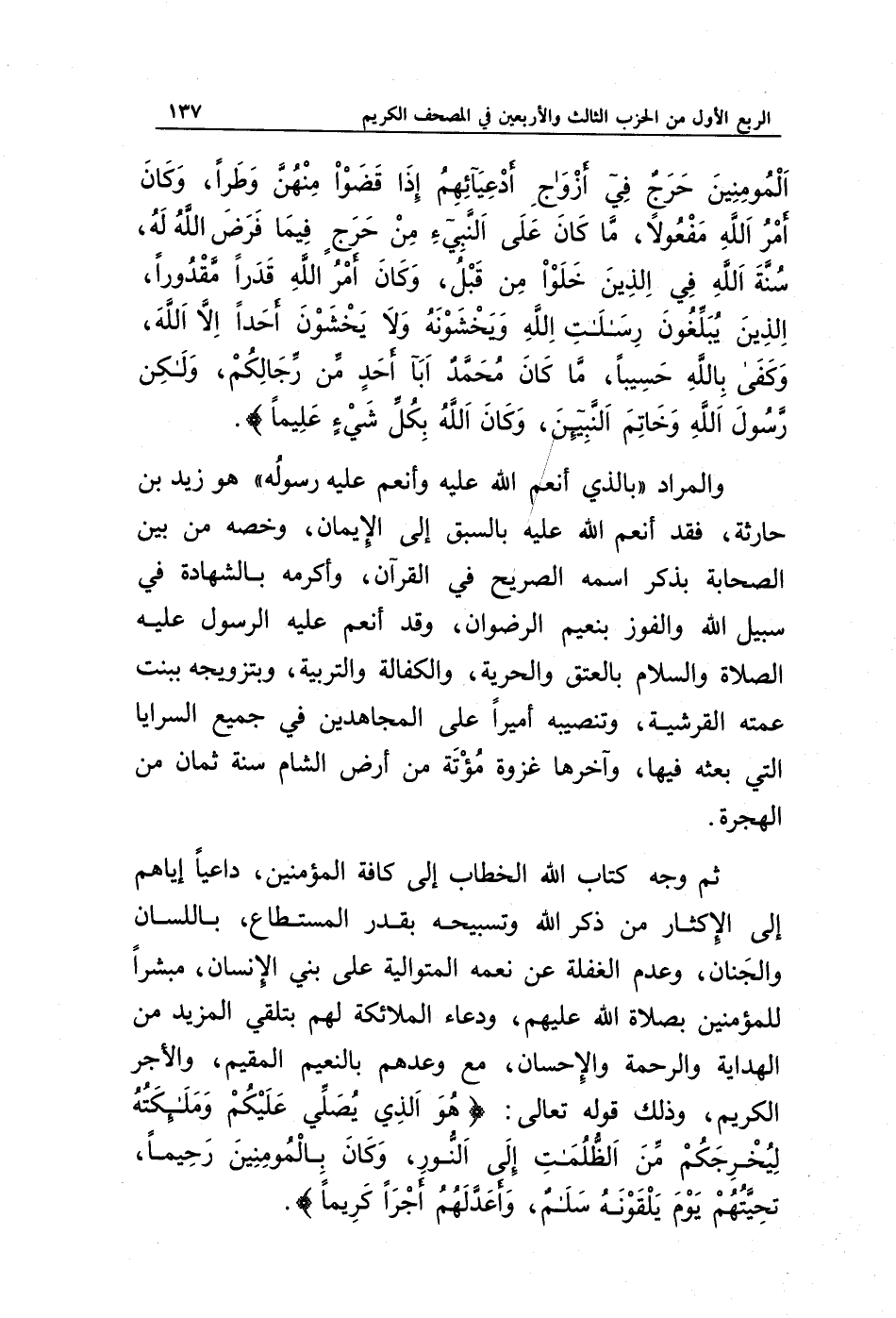 ثم وجه كتاب الله الخطاب إلى كافة المؤمنين، داعيا إياهم إلى الإكثار من ذكر الله وتسبيحه بقدر المستطاع، باللسان والجنان، وعدم الغفلة عن نعمه المتوالية على بني الإنسان، مبشرا للمؤمنين بصلاة الله عليهم، ودعاء الملائكة لهم بتلقي المزيد من الهداية والرحمة والإحسان، مع وعدهم بالنعيم المقيم، والأجر الكريم، وذلك قوله تعالى: {هُوَ الَّذِي يُصَلِّي عَلَيْكُمْ وَمَلَائِكَتُهُ لِيُخْرِجَكُمْ مِنَ الظُّلُمَاتِ إِلَى النُّورِ وَكَانَ بِالْمُؤْمِنِينَ رَحِيمًا * تَحِيَّتُهُمْ يَوْمَ يَلْقَوْنَهُ سَلَامٌ وَأَعَدَّ لَهُمْ أَجْرًا كَرِيمًا}.