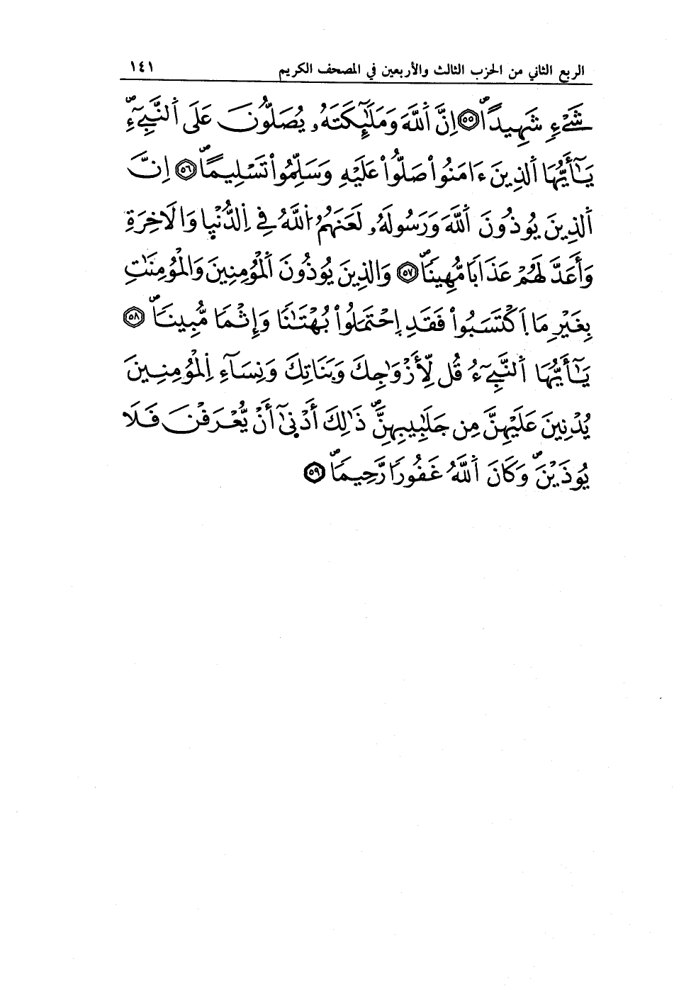 شَيْءٍ شَهِيدًا (55) إِنَّ اللَّهَ وَمَلَائِكَتَهُ يُصَلُّونَ عَلَى النَّبِيِّ يَا أَيُّهَا الَّذِينَ آمَنُوا صَلُّوا عَلَيْهِ وَسَلِّمُوا تَسْلِيمًا (56) إِنَّ الَّذِينَ يُؤْذُونَ اللَّهَ وَرَسُولَهُ لَعَنَهُمُ اللَّهُ فِي الدُّنْيَا وَالْآخِرَةِ وَأَعَدَّ لَهُمْ عَذَابًا مُهِينًا (57) وَالَّذِينَ يُؤْذُونَ الْمُؤْمِنِينَ وَالْمُؤْمِنَاتِ بِغَيْرِ مَا اكْتَسَبُوا فَقَدِ احْتَمَلُوا بُهْتَانًا وَإِثْمًا مُبِينًا (58) يَا أَيُّهَا النَّبِيُّ قُلْ لِأَزْوَاجِكَ وَبَنَاتِكَ وَنِسَاءِ الْمُؤْمِنِينَ يُدْنِينَ عَلَيْهِنَّ مِنْ جَلَابِيبِهِنَّ ذَلِكَ أَدْنَى أَنْ يُعْرَفْنَ فَلَا يُؤْذَيْنَ وَكَانَ اللَّهُ غَفُورًا رَحِيمًا (59)