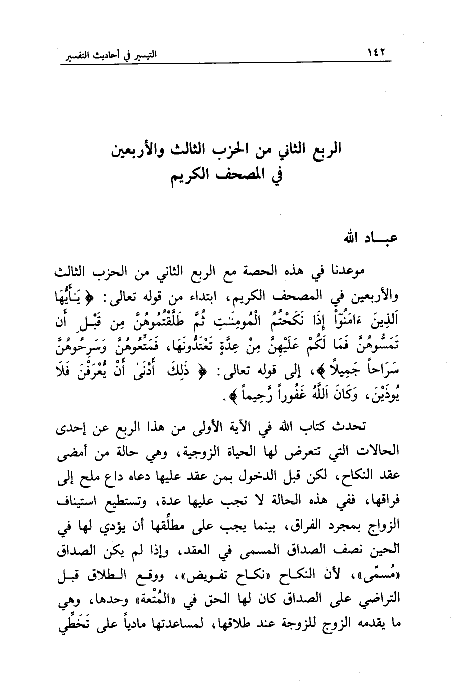 موعدنا في هذه الحصة مع الربع الثاني من الحزب الثالث، والأربعين في المصحف الكريم، ابتداء من قوله تعالى: {يَا أَيُّهَا الَّذِينَ آمَنُوا إِذَا نَكَحْتُمُ الْمُؤْمِنَاتِ ثُمَّ طَلَّقْتُمُوهُنَّ مِنْ قَبْلِ أَنْ تَمَسُّوهُنَّ فَمَا لَكُمْ عَلَيْهِنَّ مِنْ عِدَّةٍ تَعْتَدُّونَهَا فَمَتِّعُوهُنَّ وَسَرِّحُوهُنَّ سَرَاحًا جَمِيلًا}، إلى قوله تعالى: {ذَلِكَ أَدْنَى أَنْ يُعْرَفْنَ فَلَا يُؤْذَيْنَ وَكَانَ اللَّهُ غَفُورًا رَحِيمًا}.