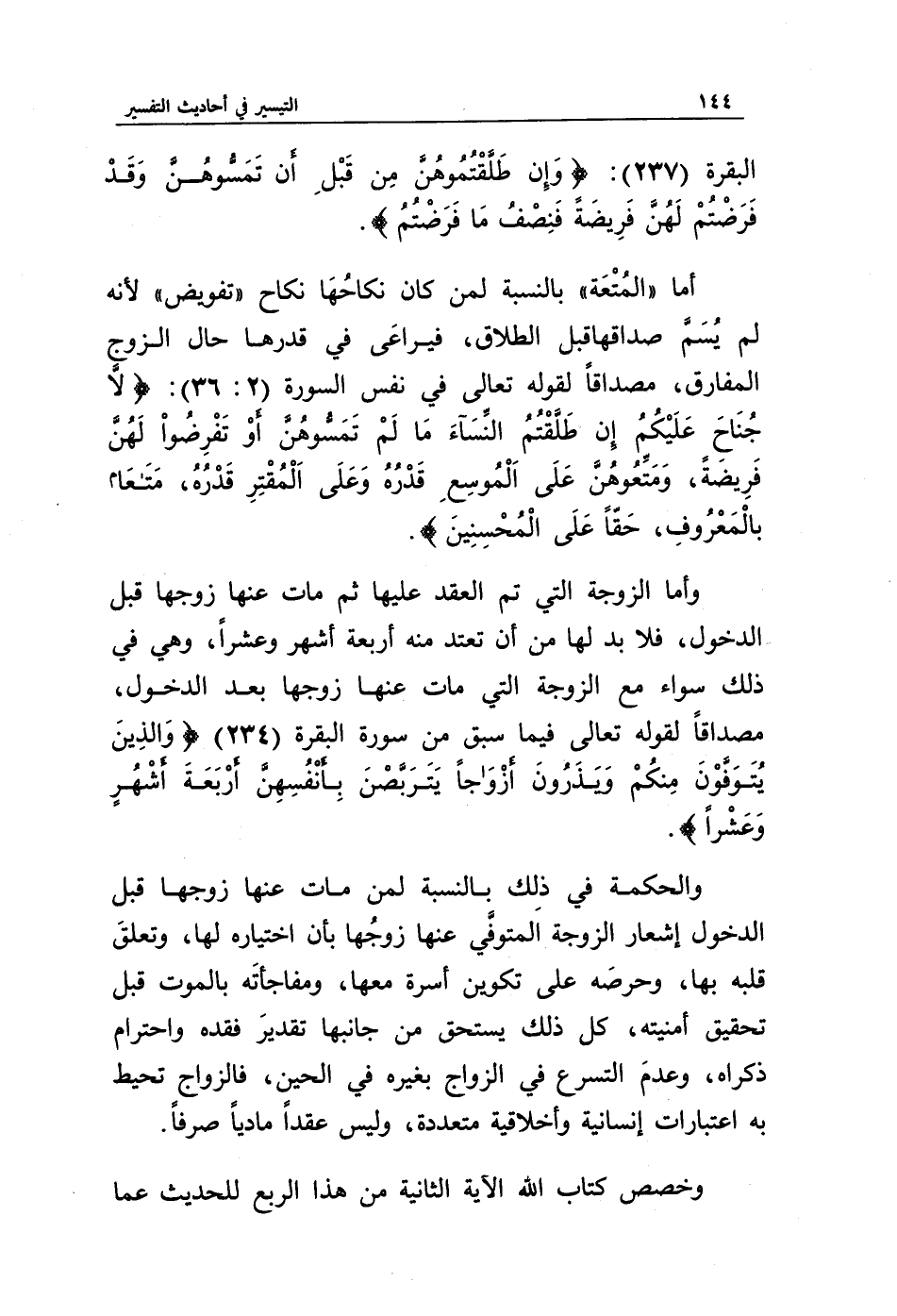 أما (المتعة) بالنسبة لمن كان نكاحها نكاح (تفويض) لأنه لم يسم صداقها قبل الطلاق، فيراعى في قدرها حال الزوج المفارق، مصداقا لقوله تعالى في نفس السورة (36: 2): {لَا جُنَاحَ عَلَيْكُمْ إِنْ طَلَّقْتُمُ النِّسَاءَ مَا لَمْ تَمَسُّوهُنَّ أَوْ تَفْرِضُوا لَهُنَّ فَرِيضَةً وَمَتِّعُوهُنَّ عَلَى الْمُوسِعِ قَدَرُهُ وَعَلَى الْمُقْتِرِ قَدَرُهُ مَتَاعًا بِالْمَعْرُوفِ حَقًّا عَلَى الْمُحْسِنِينَ}.