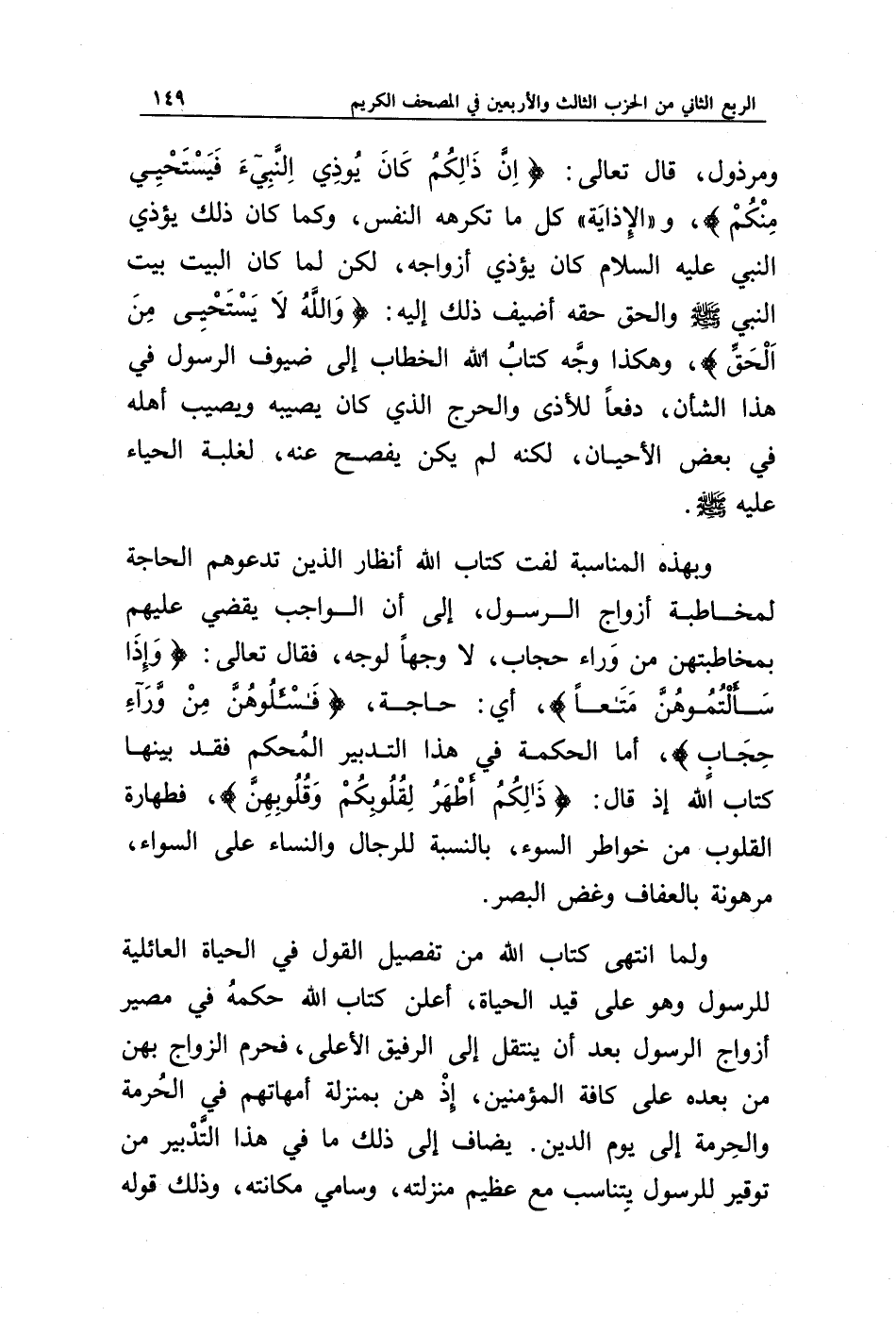 ولما انتهى كتاب الله من تفصيل القول في الحياة العائلية للرسول وهو على قيد الحياة، أعلن كتاب الله حكمه في مصير أزواج الرسول بعد أن ينتقل إلى الرفيق الأعلى، فحرم الزواج بهن من بعده على كافة المؤمنين، إذ هن بمنزلة أمهاتهم في الحرمة والحرمة إلى يوم الدين. يضاف إلى ذلك ما في هذا التدبير من توقير للرسول يتناسب مع عظيم منزلته، وسامي مكانته، وذلك قوله