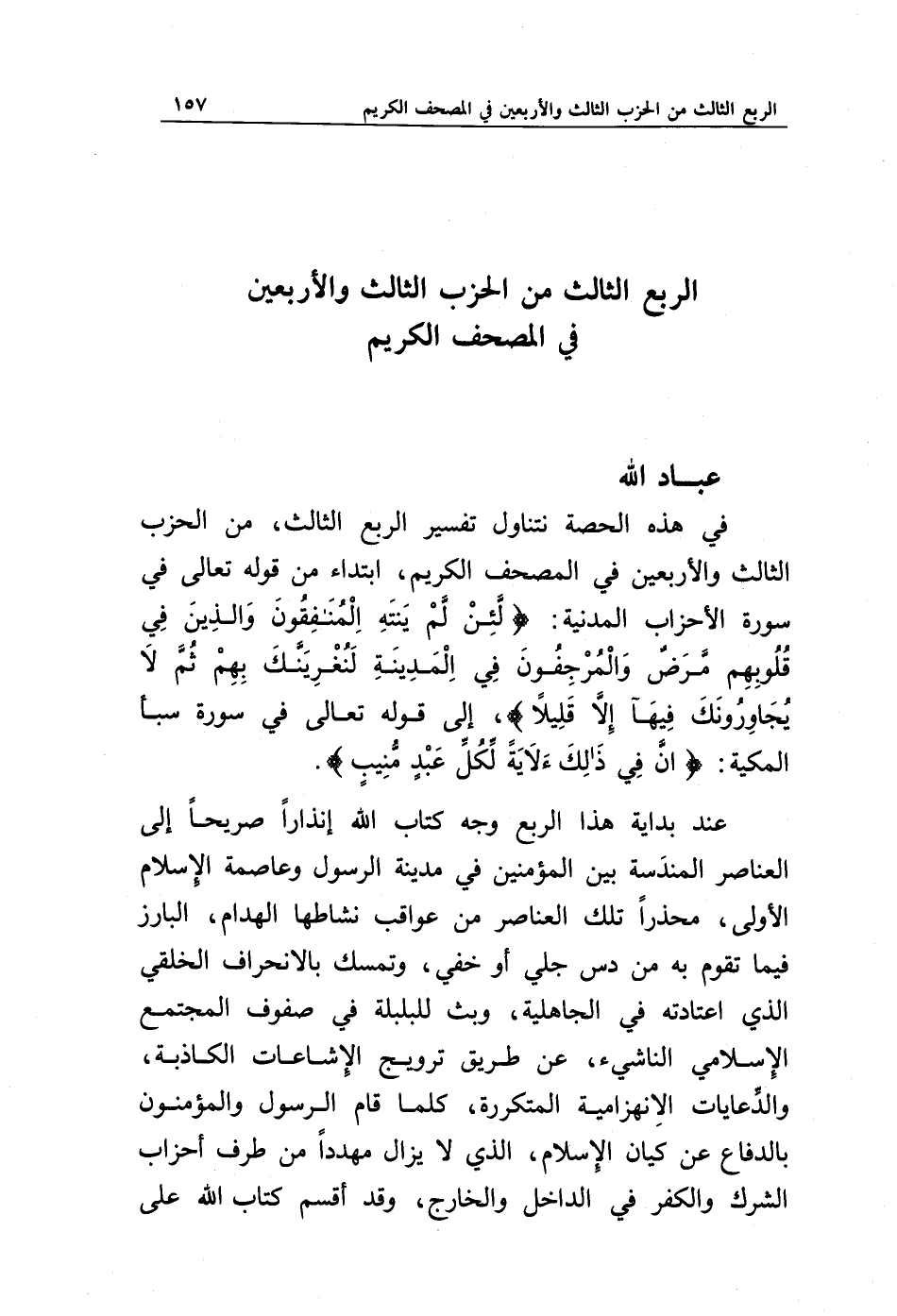 في هذه الحصة نتناول تفسير الربع الثالث، من الحزب الثالث والأربعين في المصحف الكريم، ابتداء من قوله تعالى في سورة الأحزاب المدنية: {لَئِنْ لَمْ يَنْتَهِ الْمُنَافِقُونَ وَالَّذِينَ فِي قُلُوبِهِمْ مَرَضٌ وَالْمُرْجِفُونَ فِي الْمَدِينَةِ لَنُغْرِيَنَّكَ بِهِمْ ثُمَّ لَا يُجَاوِرُونَكَ فِيهَا إِلَّا قَلِيلًا}، إلى قوله تعالى في سورة سبأ المكية: {إِنَّ فِي ذَلِكَ لَآيَةً لِكُلِّ عَبْدٍ مُنِيبٍ}.