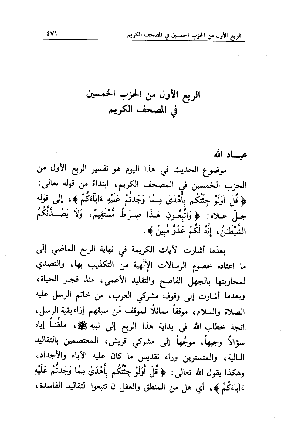 موضوع الحديث في هذا اليوم هو تفسير الربع الأول من الحزب الخمسين في المصحف الكريم، ابتداء من قوله تعالى: {قَالَ أَوَلَوْ جِئْتُكُمْ بِأَهْدَى مِمَّا وَجَدْتُمْ عَلَيْهِ آبَاءَكُمْ}، إلى قوله جل علاه: {وَاتَّبِعُونِ هَذَا صِرَاطٌ مُسْتَقِيمٌ * وَلَا يَصُدَّنَّكُمُ الشَّيْطَانُ إِنَّهُ لَكُمْ عَدُوٌّ مُبِينٌ}.