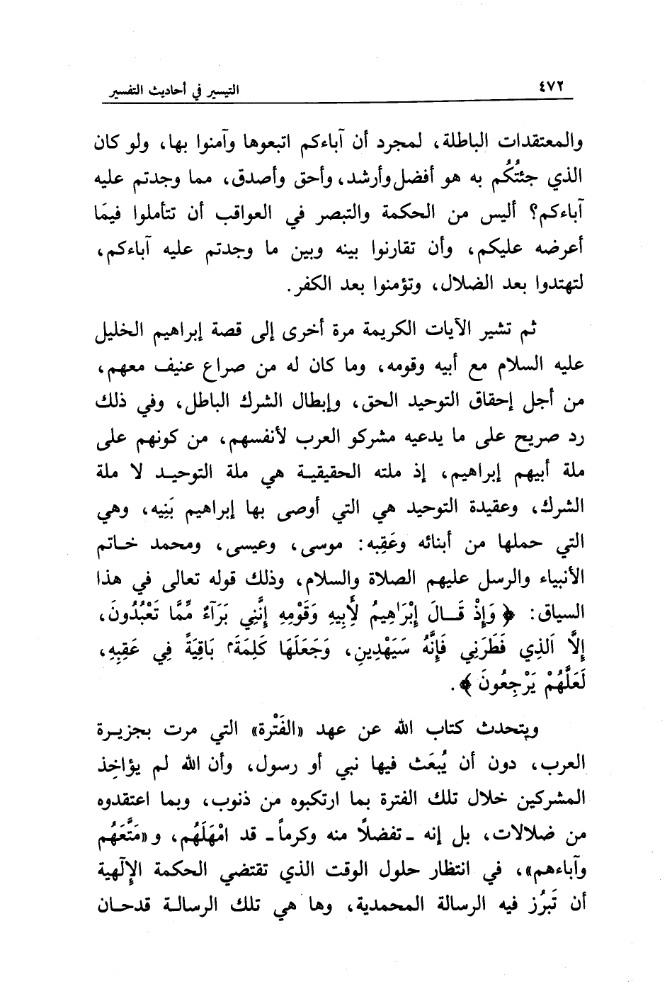 ويتحدث كتاب الله عن عهد (الفترة) التي مرت بجزيرة العرب، دون أن يبعث فيها نبي أو رسول، وأن الله لم يؤاخذ المشركين خلال تلك الفترة بما ارتكبوه من ذنوب، وبما اعتقدوه من ضلالات، بل إنه- تفضلا منه وكرما- قد أمهلهم، و (متعهم وآباءهم)، في انتظار حلول الوقت الذي تقتضي الحكمة الإلهية أن تبرز فيه الرسالة المحمدية، وها هي تلك الرسالة قد حان