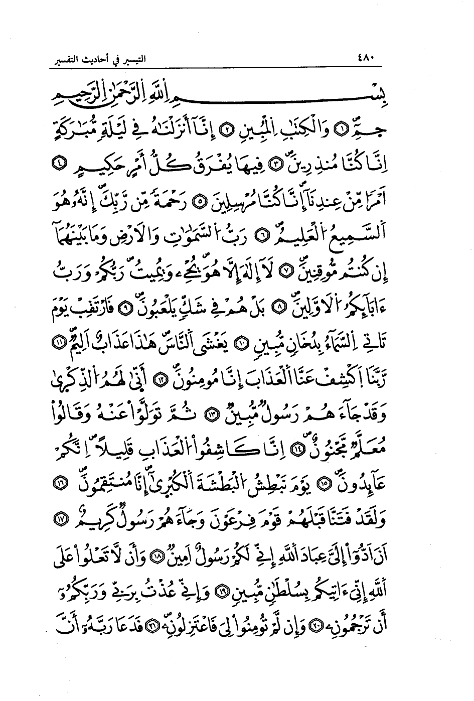 حم (1) وَالْكِتَابِ الْمُبِينِ (2) إِنَّا أَنْزَلْنَاهُ فِي لَيْلَةٍ مُبَارَكَةٍ إِنَّا كُنَّا مُنْذِرِينَ (3) فِيهَا يُفْرَقُ كُلُّ أَمْرٍ حَكِيمٍ (4) أَمْرًا مِنْ عِنْدِنَا إِنَّا كُنَّا مُرْسِلِينَ (5) رَحْمَةً مِنْ رَبِّكَ إِنَّهُ هُوَ السَّمِيعُ الْعَلِيمُ (6) رَبِّ السَّمَاوَاتِ وَالْأَرْضِ وَمَا بَيْنَهُمَا إِنْ كُنْتُمْ مُوقِنِينَ (7) لَا إِلَهَ إِلَّا هُوَ يُحْيِي وَيُمِيتُ رَبُّكُمْ وَرَبُّ آبَائِكُمُ الْأَوَّلِينَ (8) بَلْ هُمْ فِي شَكٍّ يَلْعَبُونَ (9) فَارْتَقِبْ يَوْمَ تَأْتِي السَّمَاءُ بِدُخَانٍ مُبِينٍ (10) يَغْشَى النَّاسَ هَذَا عَذَابٌ أَلِيمٌ (11) رَبَّنَا اكْشِفْ عَنَّا الْعَذَابَ إِنَّا مُؤْمِنُونَ (12) أَنَّى لَهُمُ الذِّكْرَى وَقَدْ جَاءَهُمْ رَسُولٌ مُبِينٌ (13) ثُمَّ تَوَلَّوْا عَنْهُ وَقَالُوا مُعَلَّمٌ مَجْنُونٌ (14) إِنَّا كَاشِفُو الْعَذَابِ قَلِيلًا إِنَّكُمْ عَائِدُونَ (15) يَوْمَ نَبْطِشُ الْبَطْشَةَ الْكُبْرَى إِنَّا مُنْتَقِمُونَ (16) وَلَقَدْ فَتَنَّا قَبْلَهُمْ قَوْمَ فِرْعَوْنَ وَجَاءَهُمْ رَسُولٌ كَرِيمٌ (17) أَنْ أَدُّوا إِلَيَّ عِبَادَ اللَّهِ إِنِّي لَكُمْ رَسُولٌ أَمِينٌ (18) وَأَنْ لَا تَعْلُوا عَلَى اللَّهِ إِنِّي آتِيكُمْ بِسُلْطَانٍ مُبِينٍ (19) وَإِنِّي عُذْتُ بِرَبِّي وَرَبِّكُمْ أَنْ تَرْجُمُونِ (20) وَإِنْ لَمْ تُؤْمِنُوا لِي فَاعْتَزِلُونِ (21) فَدَعَا رَبَّهُ أَنَّ