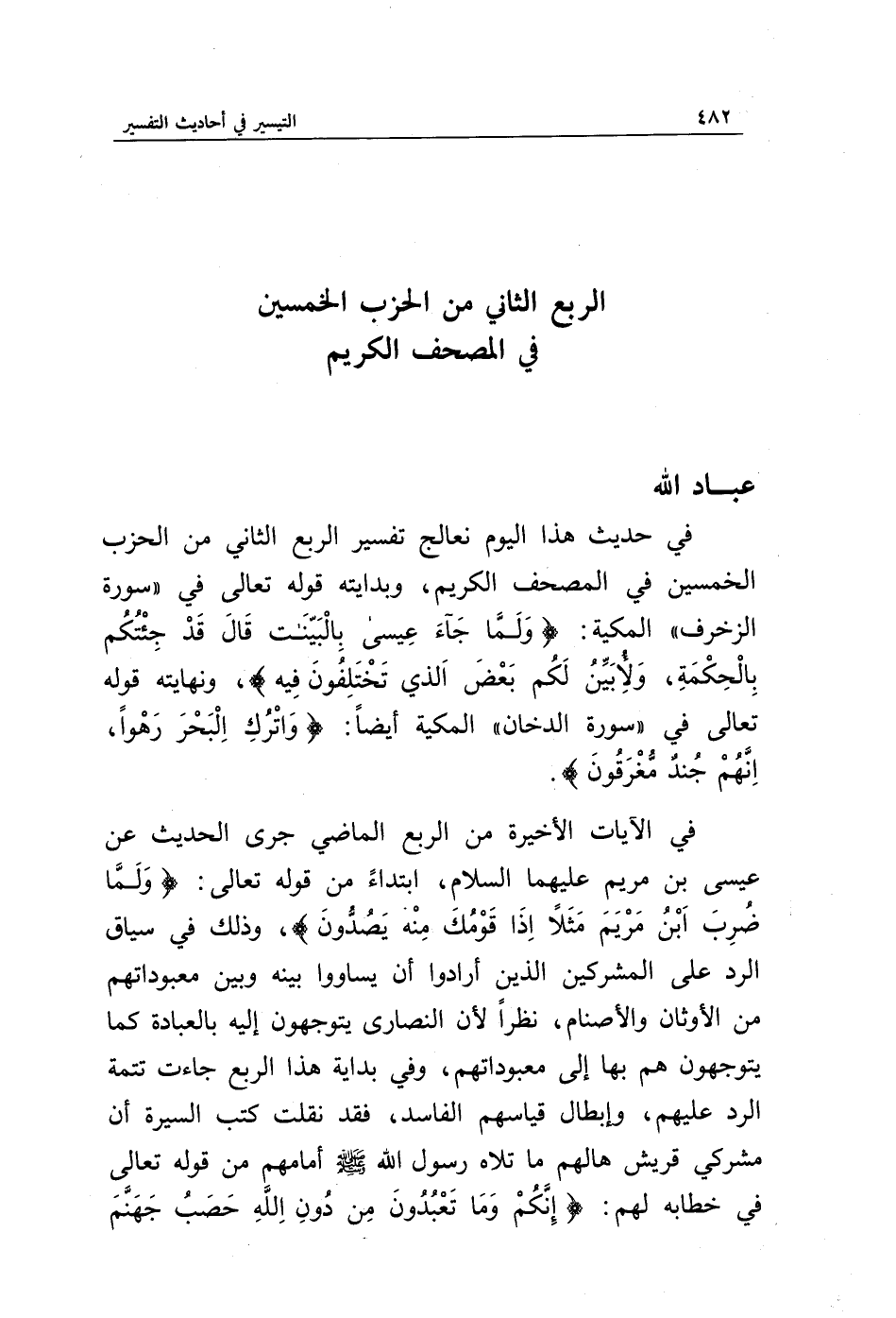 في حديث هذا اليوم نعالج تفسير الربع الثاني من الحزب الخمسين في المصحف الكريم، وبداية قوله تعالى في "سورة الزخرف" المكية: {وَلَمَّا جَاءَ عِيسَى بِالْبَيِّنَاتِ قَالَ قَدْ جِئْتُكُمْ بِالْحِكْمَةِ وَلِأُبَيِّنَ لَكُمْ بَعْضَ الَّذِي تَخْتَلِفُونَ فِيهِ}، ونهايته قوله تعالى في "سورة الدخان" المكية أيضا: {وَاتْرُكِ الْبَحْرَ رَهْوًا إِنَّهُمْ جُنْدٌ مُغْرَقُونَ}.