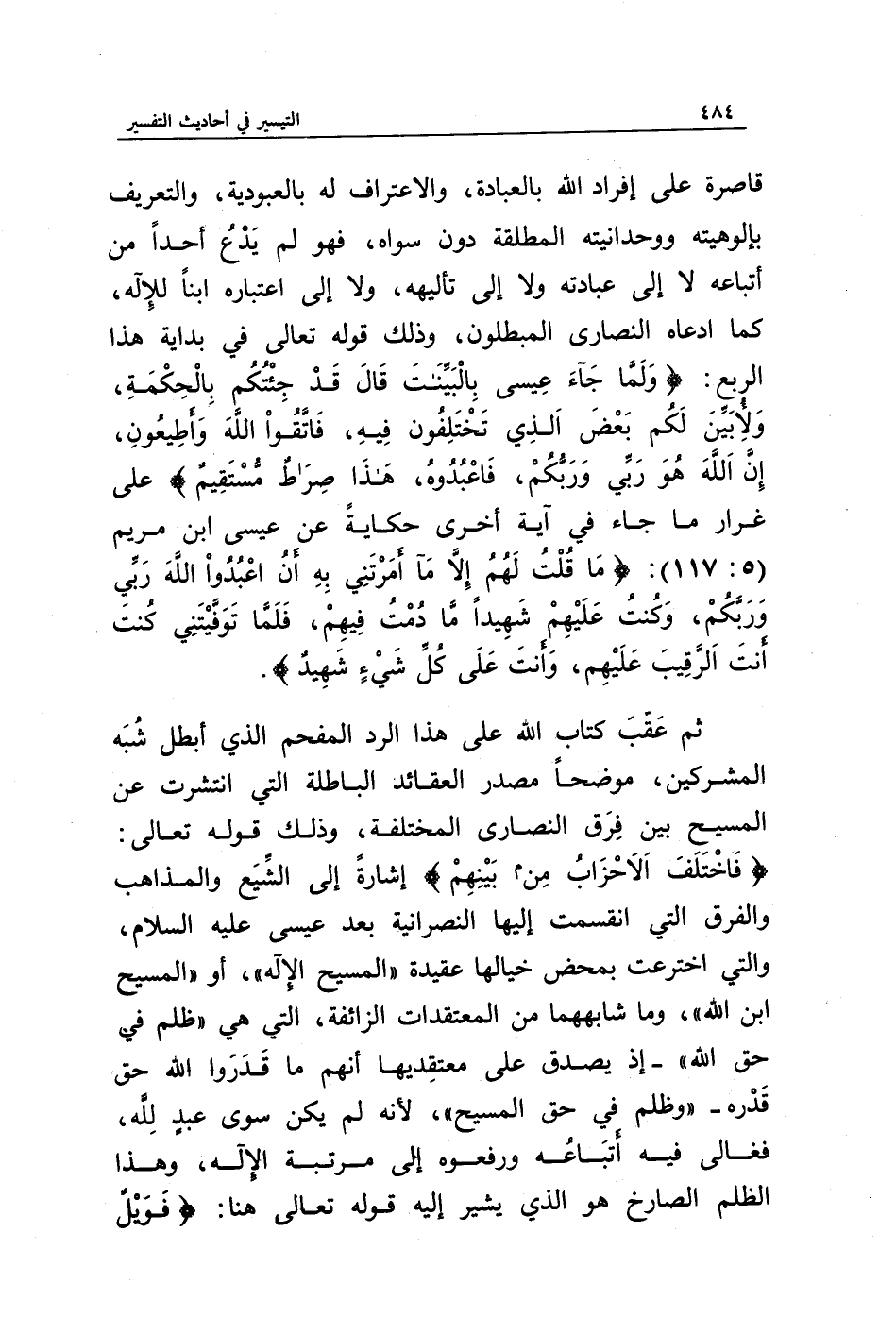 قاصرة على إفراد الله بالعبادة، والاعتراف له بالعبودية، والتعريف بإلوهيته ووحدانيته المطلقة دون سواه، فهو لم يدع أحدا من أتباعه لا إلى عبادته ولا إلى تأليهه، ولا إلى اعتباره ابنا للإله، كما ادعاه النصارى المبطلون، وذلك قوله تعالى في بداية هذا الربع: {وَلَمَّا جَاءَ عِيسَى بِالْبَيِّنَاتِ قَالَ قَدْ جِئْتُكُمْ بِالْحِكْمَةِ وَلِأُبَيِّنَ لَكُمْ بَعْضَ الَّذِي تَخْتَلِفُونَ فِيهِ فَاتَّقُوا اللَّهَ وَأَطِيعُونِ * إِنَّ اللَّهَ هُوَ رَبِّي وَرَبُّكُمْ فَاعْبُدُوهُ هَذَا صِرَاطٌ مُسْتَقِيمٌ} على غرار ما جاء في آية أخرى حكاية عن عيسى ابن مريم (117: 5): {مَا قُلْتُ لَهُمْ إِلَّا مَا أَمَرْتَنِي بِهِ أَنِ اعْبُدُوا اللَّهَ رَبِّي وَرَبَّكُمْ وَكُنْتُ عَلَيْهِمْ شَهِيدًا مَا دُمْتُ فِيهِمْ فَلَمَّا تَوَفَّيْتَنِي كُنْتَ أَنْتَ الرَّقِيبَ عَلَيْهِمْ وَأَنْتَ عَلَى كُلِّ شَيْءٍ شَهِيدٌ}.