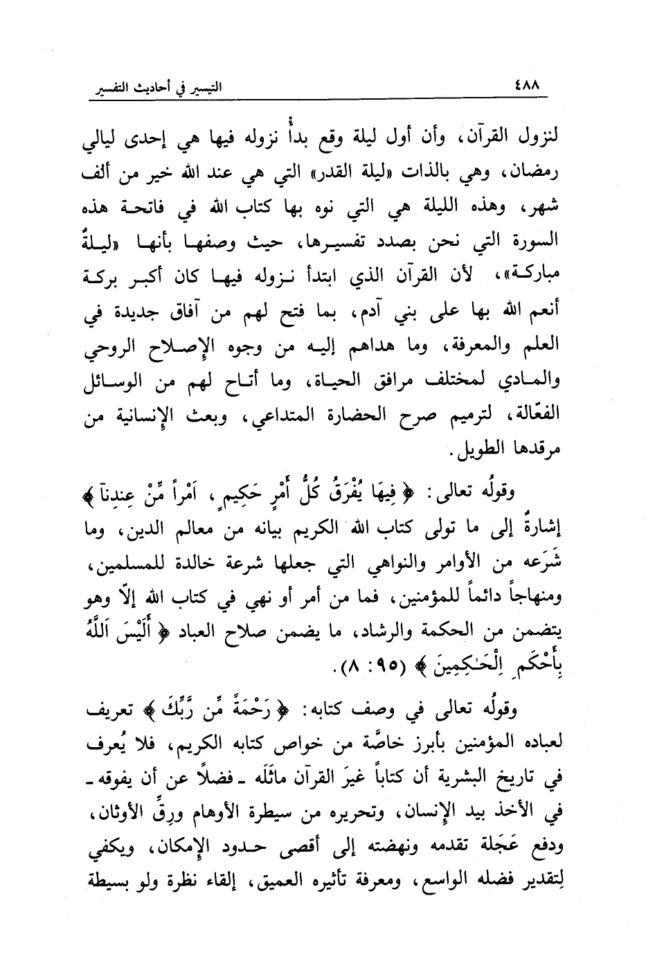لنزول القرآن، وأن أول ليلة وقع بدأ نزوله فيها هي إحدى ليالي رمضان، وهي بالذات (ليلة القدر) التي هي عند الله خير من ألف شهر، وهذه الليلة هي التي نوه بها كتاب الله في فاتحة هذه السورة التي نحن بصدد تفسيرها، حيث وصفها بأنها (ليلة مباركة)، لأن القرآن الذي ابتدأ نزوله فيها كان أكبر بركة أنعم الله بها على بني آدم، بما فتح لهم من آفاق جديدة في العلم والمعرفة، وما هداهم إليه من وجوه الإصلاح الروحي والمادي لمختلف مرافق الحياة، وما أتاح لهم من الوسائل الفعالة، لترميم صرح الحضارة المتداعي، وبعث الإنسانية من مرقدها الطويل.