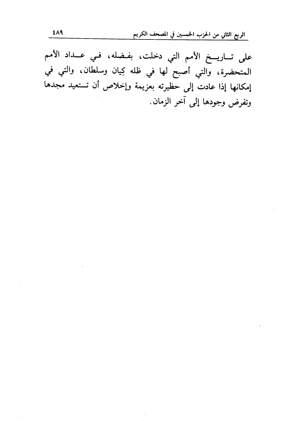 على تاريخ الأمم التي دخلت، بفضله، في عداد الأمم المتحضرة، والتي أصبح لها في ظله كيان وسلطان، والتي في إمكانها إذا عادت إلى حظيرته بعزيمة وإخلاص أن تستعيد مجدها وتفرض وجودها إلى آخر الزمان.