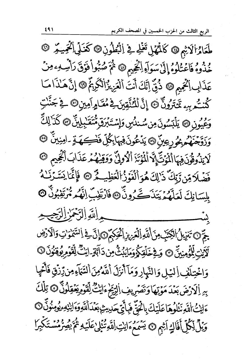 طَعَامُ الْأَثِيمِ (44) كَالْمُهْلِ يَغْلِي فِي الْبُطُونِ (45) كَغَلْيِ الْحَمِيمِ (46) خُذُوهُ فَاعْتِلُوهُ إِلَى سَوَاءِ الْجَحِيمِ (47) ثُمَّ صُبُّوا فَوْقَ رَأْسِهِ مِنْ عَذَابِ الْحَمِيمِ (48) ذُقْ إِنَّكَ أَنْتَ الْعَزِيزُ الْكَرِيمُ (49) إِنَّ هَذَا مَا كُنْتُمْ بِهِ تَمْتَرُونَ (50) إِنَّ الْمُتَّقِينَ فِي مَقَامٍ أَمِينٍ (51) فِي جَنَّاتٍ وَعُيُونٍ (52) يَلْبَسُونَ مِنْ سُنْدُسٍ وَإِسْتَبْرَقٍ مُتَقَابِلِينَ (53) كَذَلِكَ وَزَوَّجْنَاهُمْ بِحُورٍ عِينٍ (54) يَدْعُونَ فِيهَا بِكُلِّ فَاكِهَةٍ آمِنِينَ (55) لَا يَذُوقُونَ فِيهَا الْمَوْتَ إِلَّا الْمَوْتَةَ الْأُولَى وَوَقَاهُمْ عَذَابَ الْجَحِيمِ (56) فَضْلًا مِنْ رَبِّكَ ذَلِكَ هُوَ الْفَوْزُ الْعَظِيمُ (57) فَإِنَّمَا يَسَّرْنَاهُ بِلِسَانِكَ لَعَلَّهُمْ يَتَذَكَّرُونَ (58) فَارْتَقِبْ إِنَّهُمْ مُرْتَقِبُونَ (59)