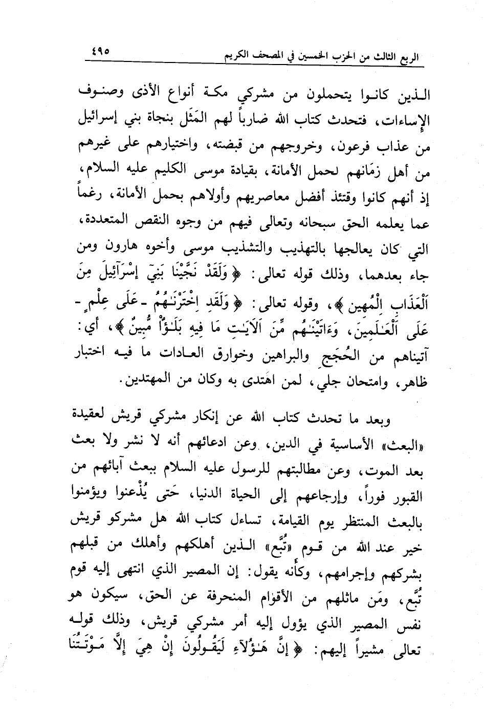 الذين كانوا يتحملون من مشركي مكة أنواع الأذى وصنوف الإساءات، فتحدث كتاب الله ضاربا لهم المثل بنجاة بني إسرائيل من عذاب فرعون، وخروجهم من قبضته، واختيارهم على غيرهم من أهل زمانهم لحمل الأمانة، بقيادة موسى الكليم عليه السلام، إذ إنهم كانوا وقتئذ أفضل معاصريهم وأولاهم بحمل الأمانة، رغما عما يعلمه الحق سبحانه وتعالى فيهم من وجوه النقص المتعددة، التي كان يعالجها بالتهذيب والتشذيب موسى وأخوه هارون ومن جاء بعدهما، وذلك قوله تعالى: {وَلَقَدْ نَجَّيْنَا بَنِي إِسْرَائِيلَ مِنَ الْعَذَابِ الْمُهِينِ}، وقوله تعالى: {وَلَقَدِ اخْتَرْنَاهُمْ عَلَى عِلْمٍ عَلَى الْعَالَمِينَ * وَآتَيْنَاهُمْ مِنَ الْآيَاتِ مَا فِيهِ بَلَاءٌ مُبِينٌ}، أي: آتيناهم من الحجج والبراهين وخوارق العادات ما فيه اختيار ظاهر، وامتحان جلي، لمن اهتدى به وكان من المهتدين.