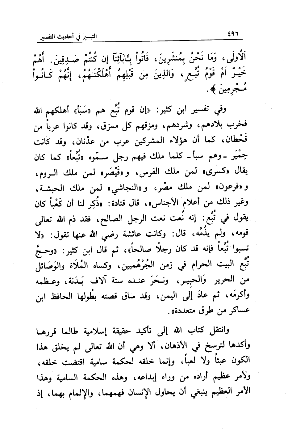 وفي تفسير ابن كثير: (إن قوم تبع هم (سبأ) أهلكهم الله فخرب بلادهم، وشردهم، ومزقهم كل ممزق، وقد كانوا عربا من قحطان، كما أن هؤلاء المشركين عرب من عدنان، وقد كانت حمير- وهم سبأ- كلما ملك فيهم رجل سموه (تبعا) كما كان يقال (كسرى) لمن ملك الفرس، و (قيصر) لمن ملك الروم، و (فرعون) لمن ملك مصر، و (النجاشي) لمن ملك الحبشة، وغير ذلك من أعلام الأجناس)، قال قتادة: " ذكر لنا أن كعبا كان يقول في تبع: إنه نُعت نعت الرجل الصالح، فقد ذم الله تعالى قومه، ولم يذمه، قال: وكانت عائشة رضي الله عنها تقول: (لا تسبوا تبعا فإنه قد كان رجلا صالحا)، ثم قال ابن كثير: (وحج تبع البيت الحرام في زمن الجرهميين، وكساه الملاء والوصائل من الحرير والحبير، ونحر عنده ستة آلاف بدنة، وعظمه وأكرمه، ثم عاد إلى اليمن وقد ساق قصته بطولها الحافظ ابن عساكر من طرق متعددة).