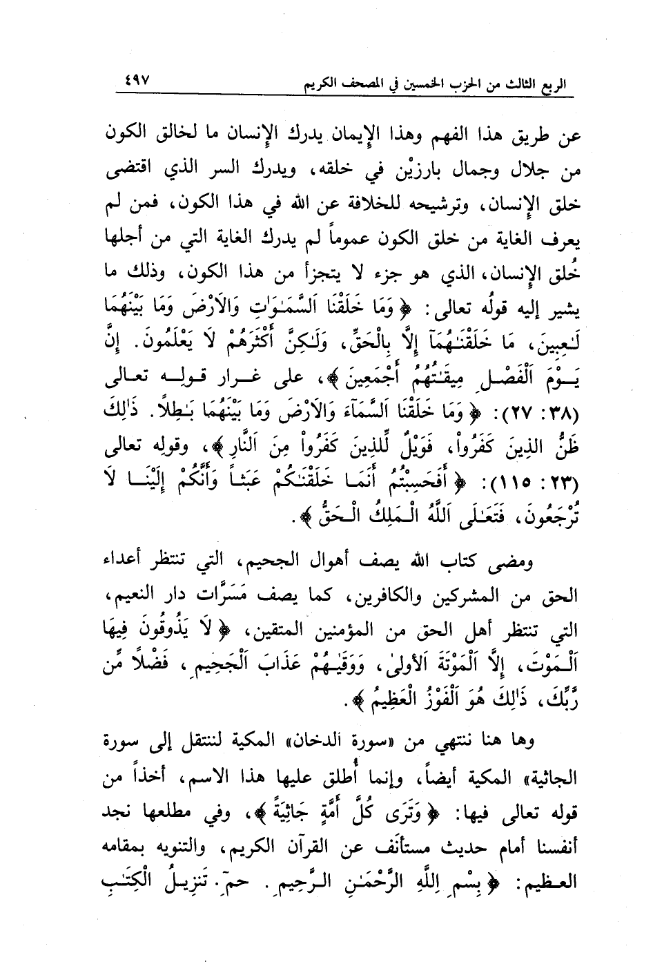 وها هنا ننتهي من (سورة الدخان) المكية لننتقل إلى سورة (الجاثية) المكية أيضا، وإنما أطلق عليها هذا الاسم، أخذا من قوله تعالى فيها: {وَتَرَى كُلَّ أُمَّةٍ جَاثِيَةً}، وفي مطلعها نجد أنفسنا أمام حديث مستأنف عن القرآن الكريم، والتنويه بمقامه العظيم: {بسم الله الرحمن الرحيم حم * تَنْزِيلُ الْكِتَابِ